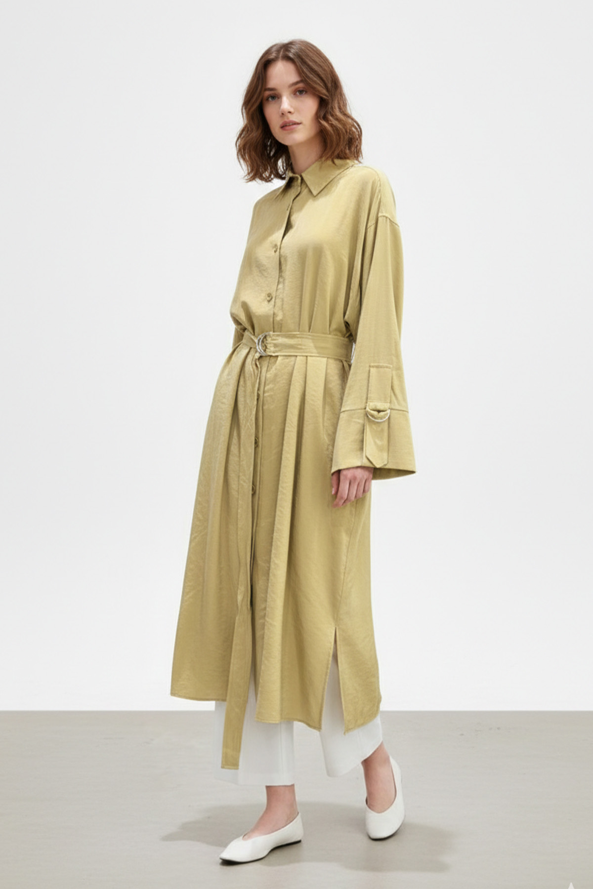 This long shirt dress offers a stylish and balanced look with its button-front design and belted waist, while its relaxed fit ensures all-day comfort. The adjustable belt accentuates the figure, and its simple and timeless design easily adapts to different outfits. Ideal for both casual and elegant wear.