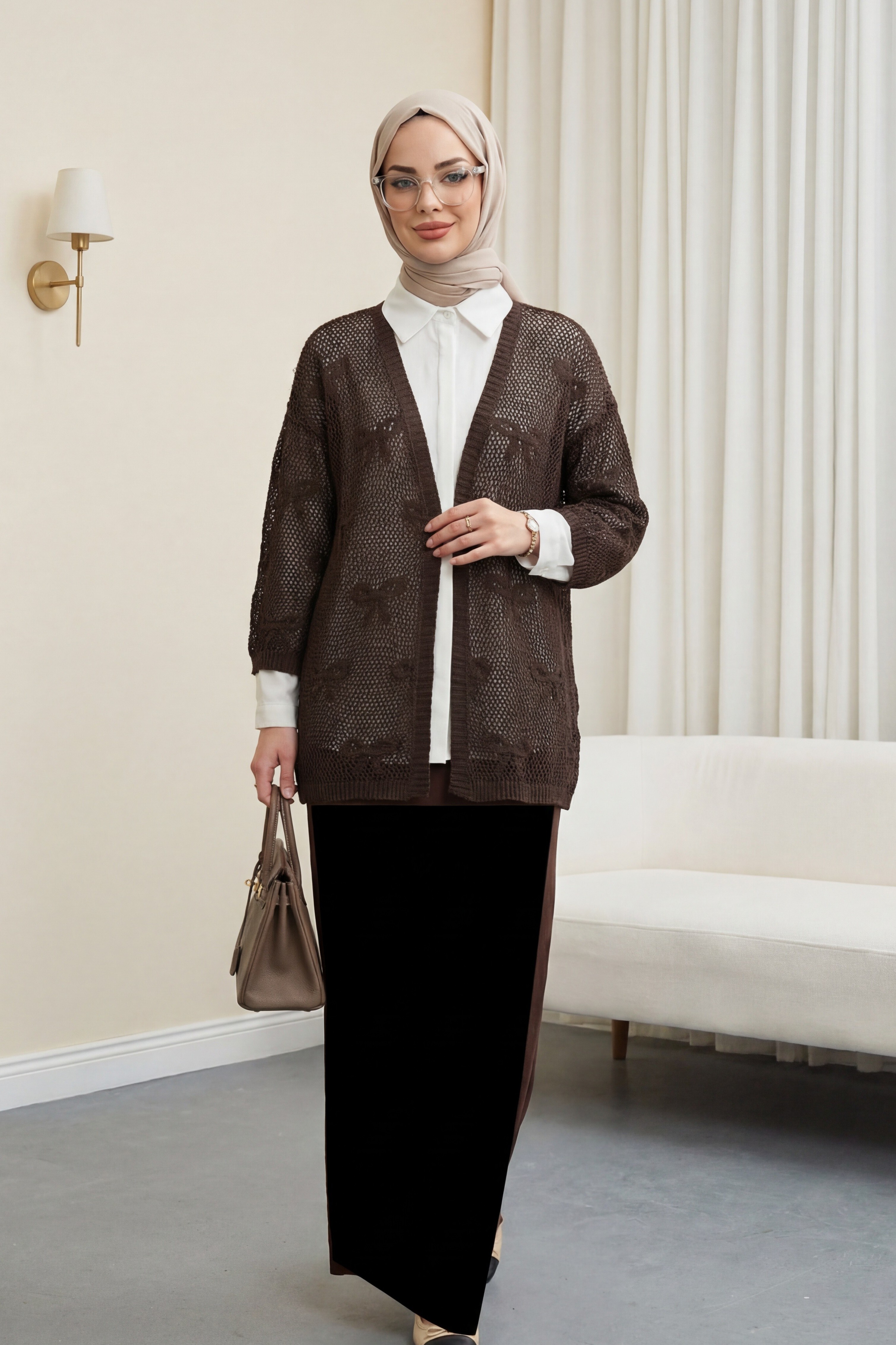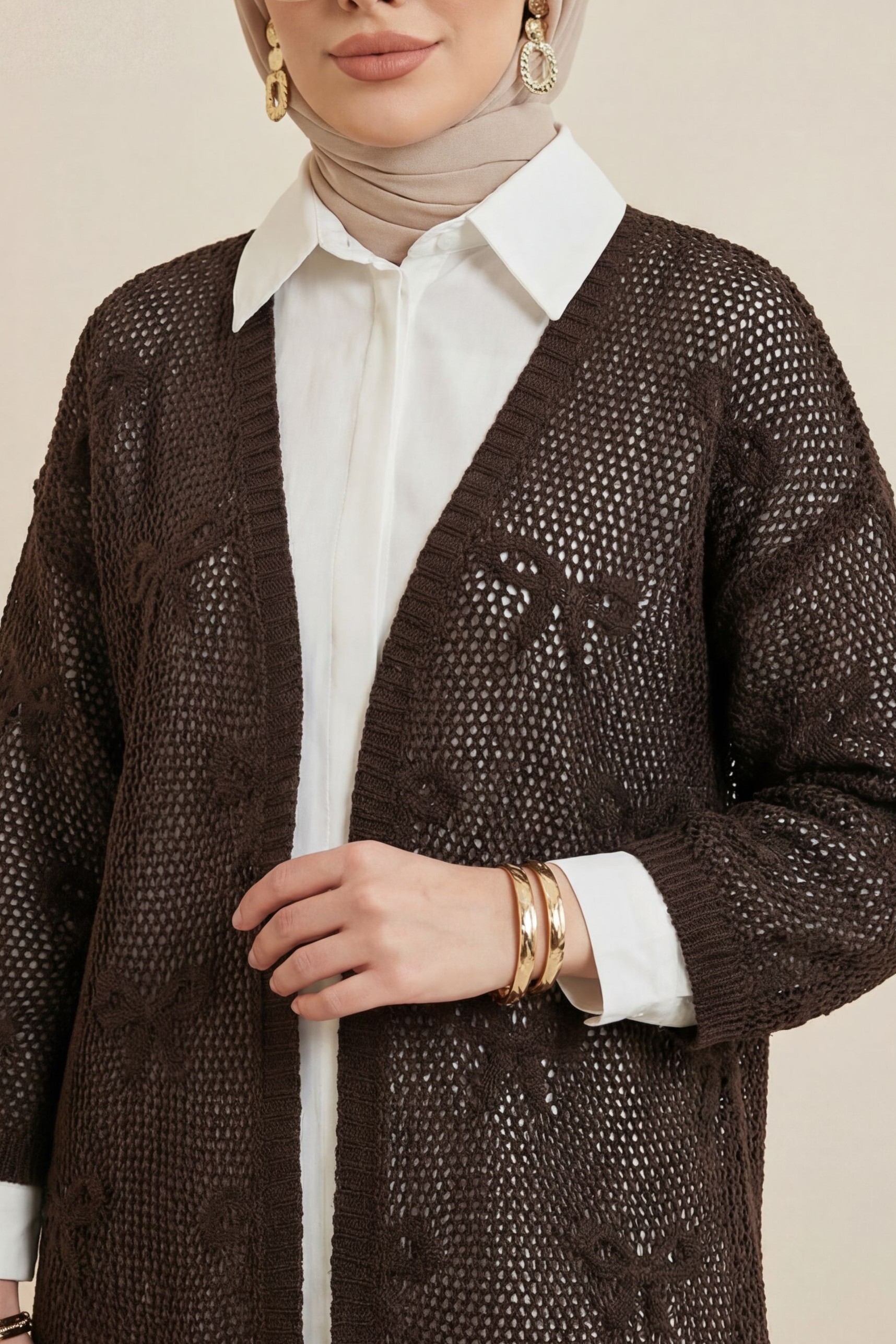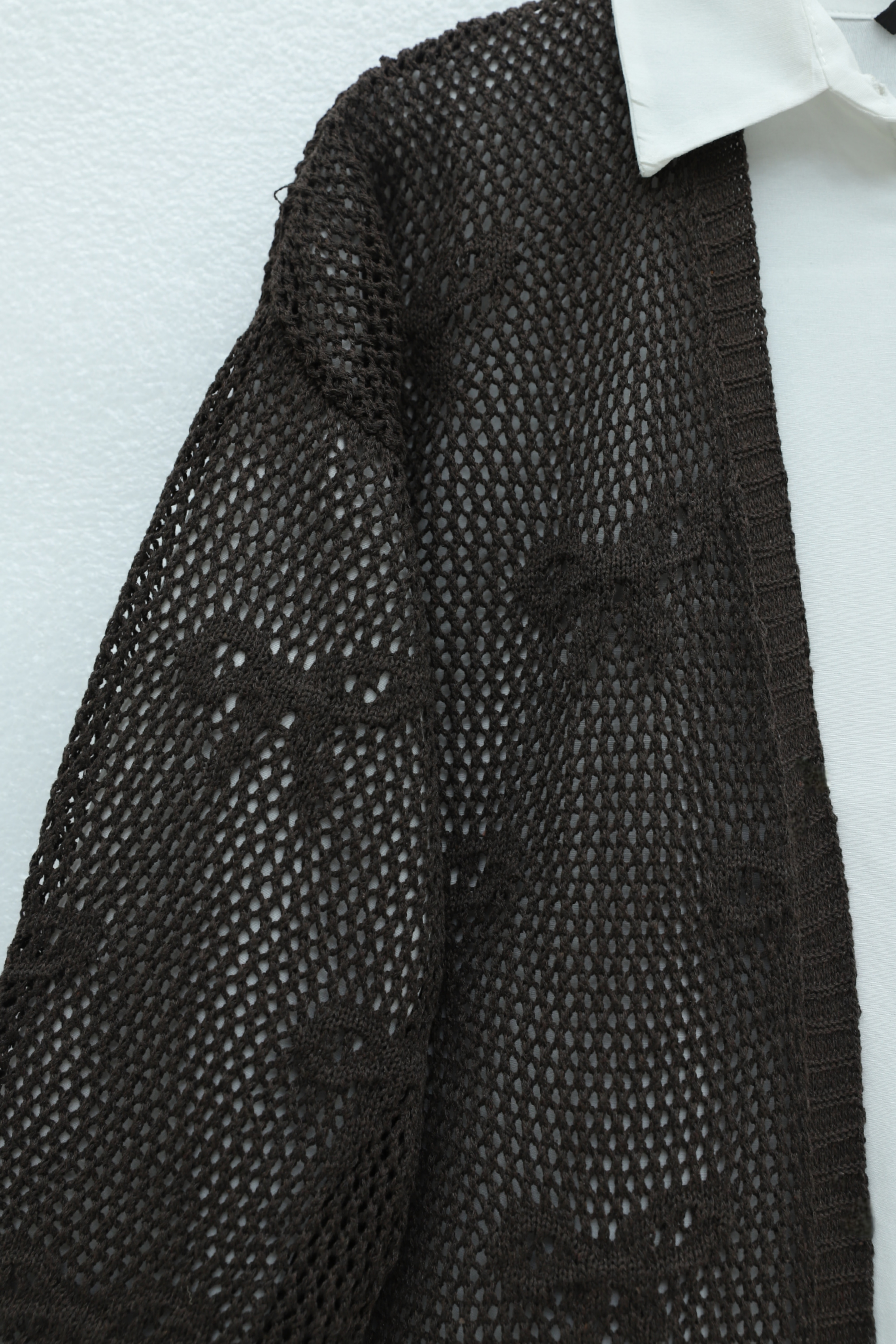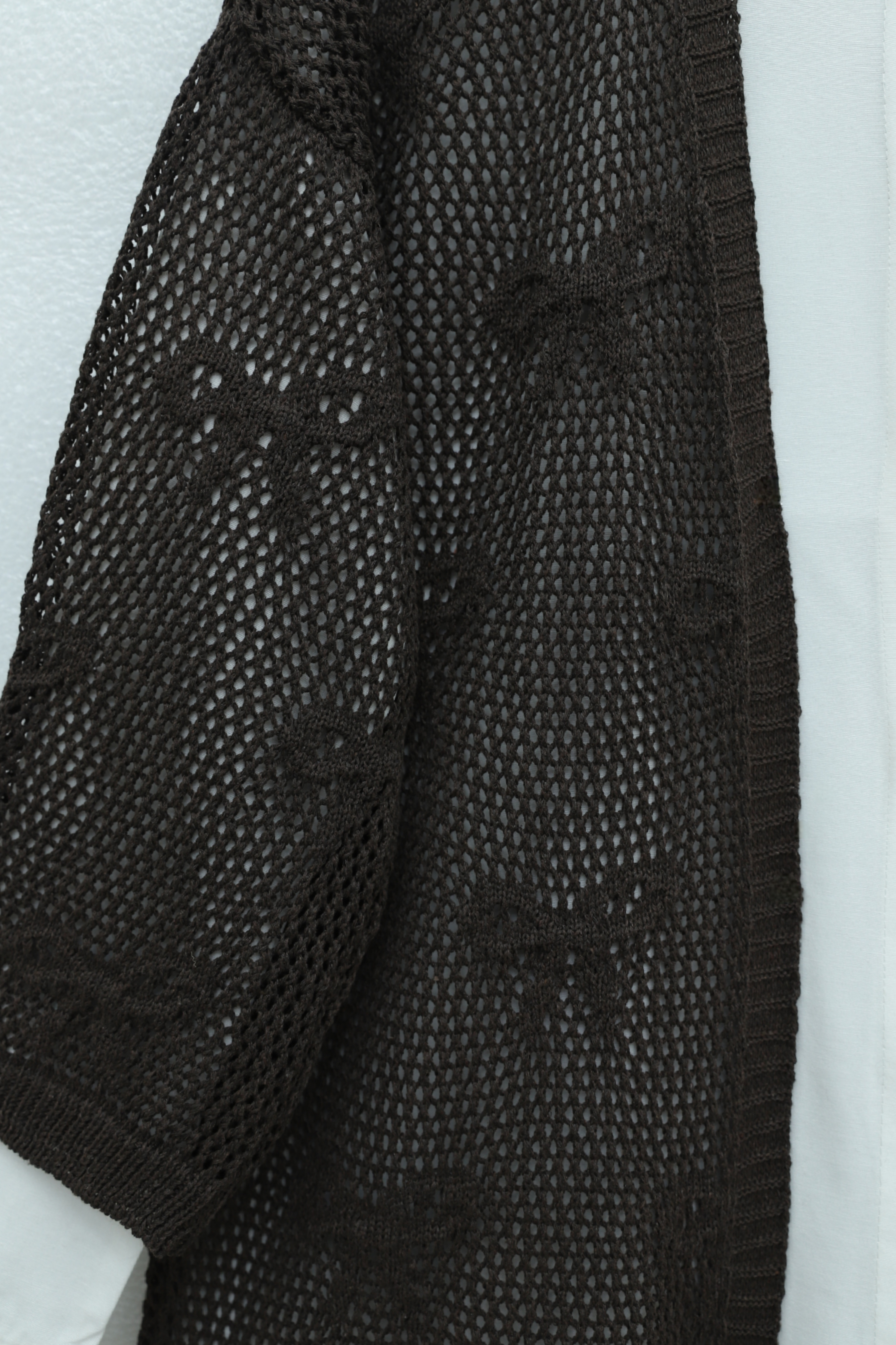 Bow Patterned Openwork Knit Cardigan -Dark Coffee