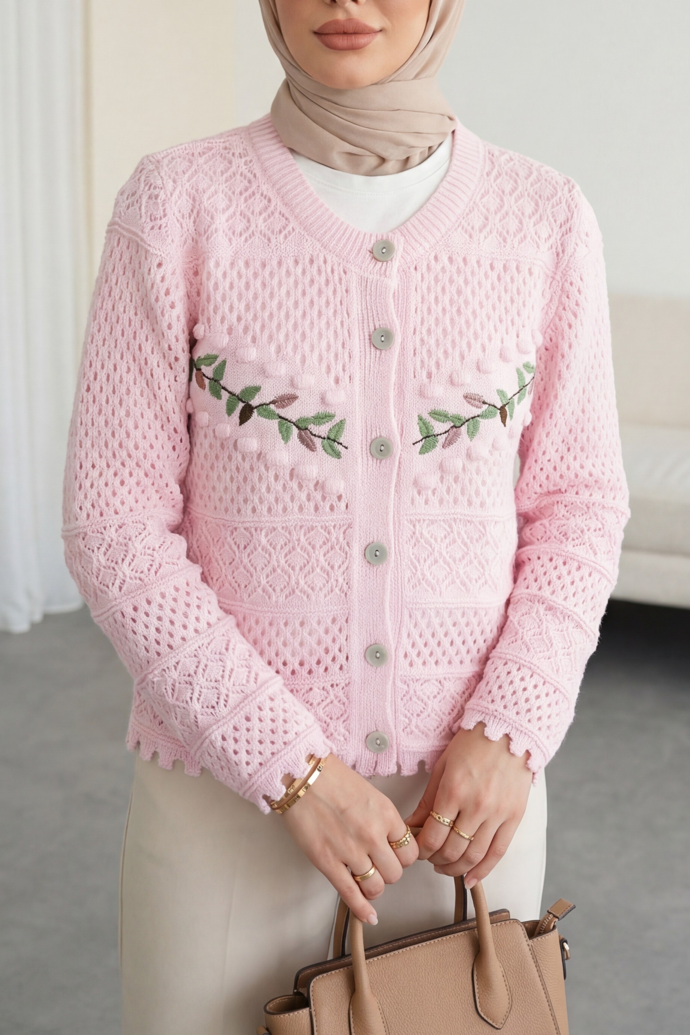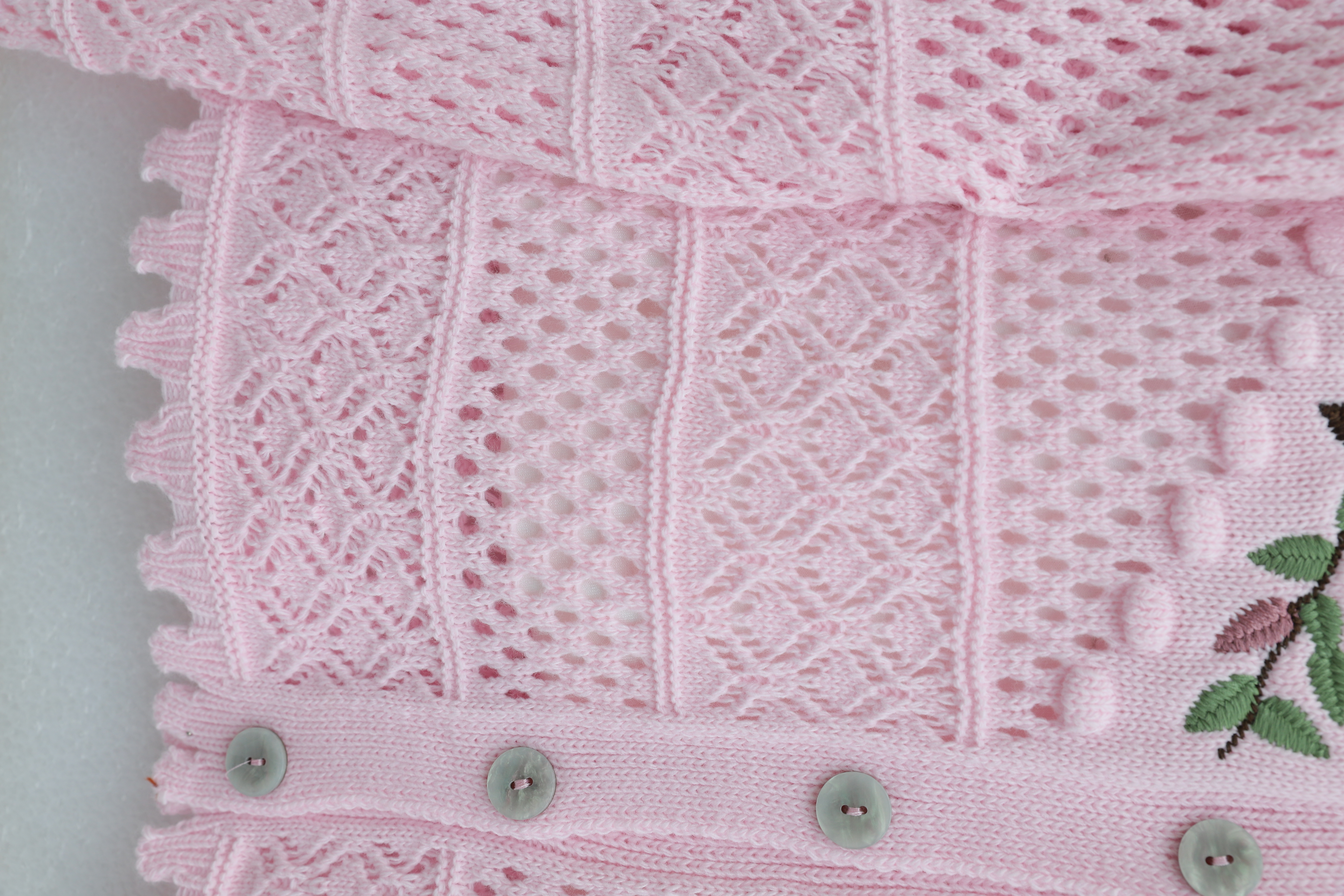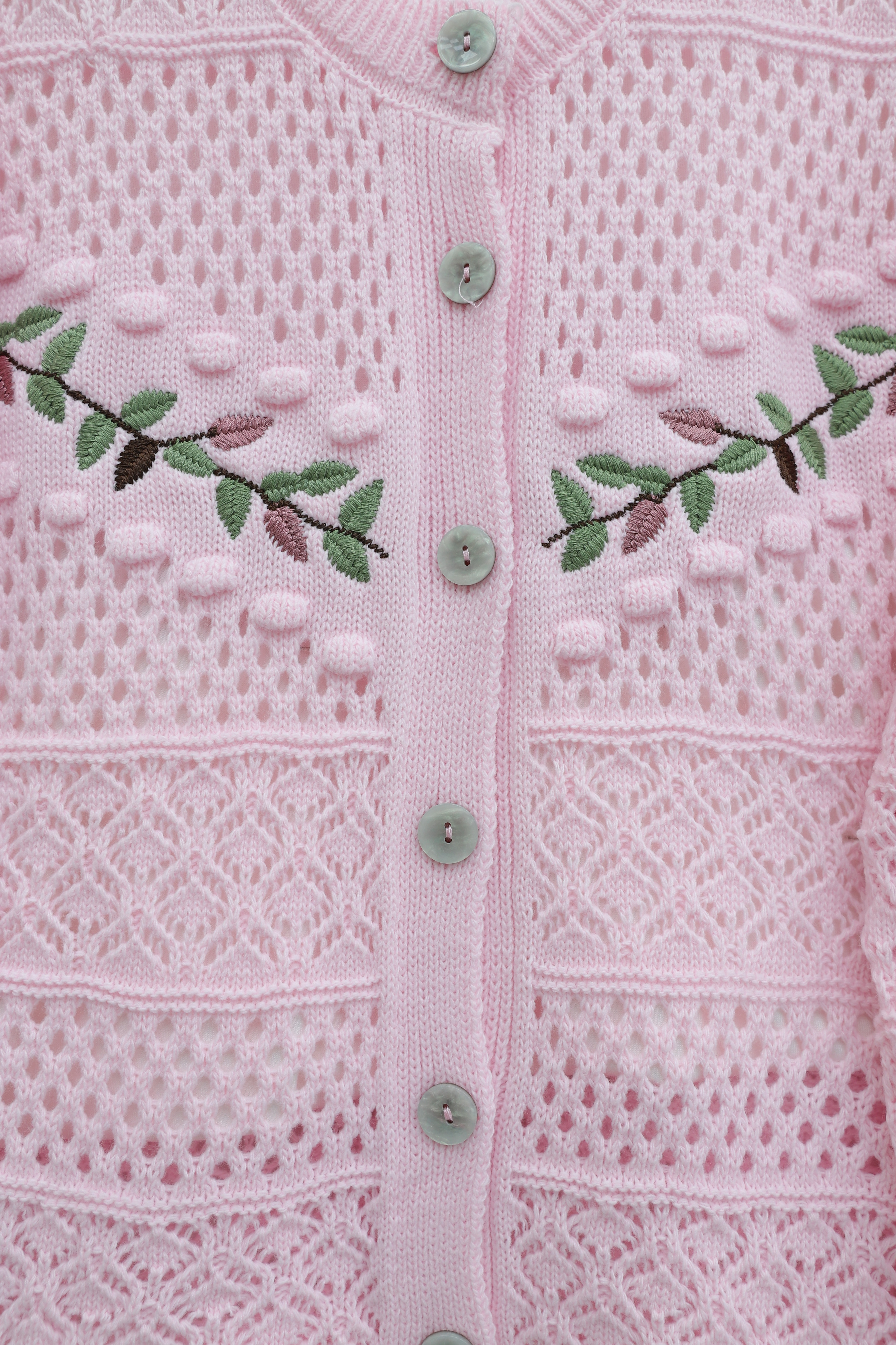 Buttoned Front Embroidered Openwork Knit Cardigan -Pink