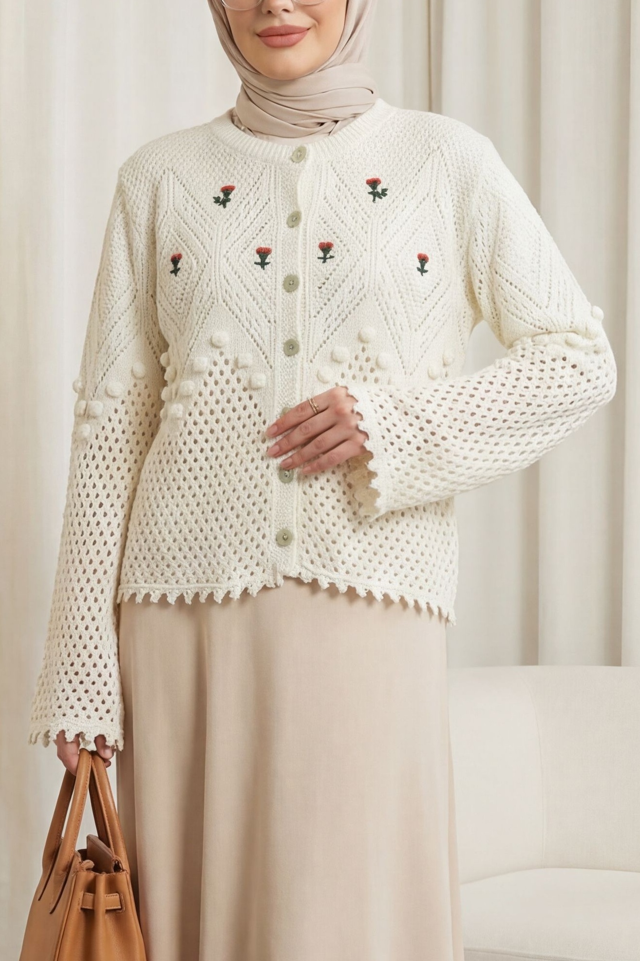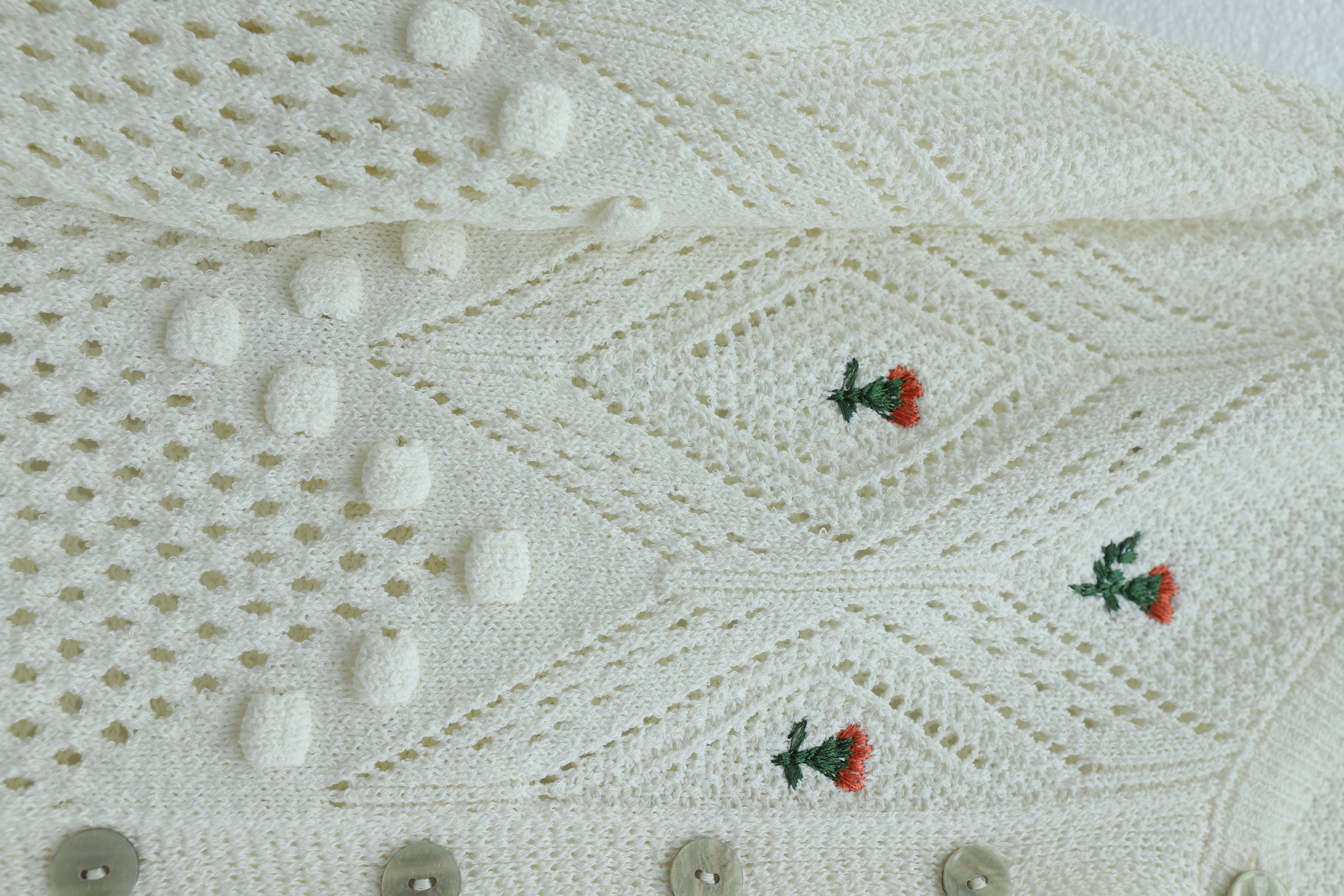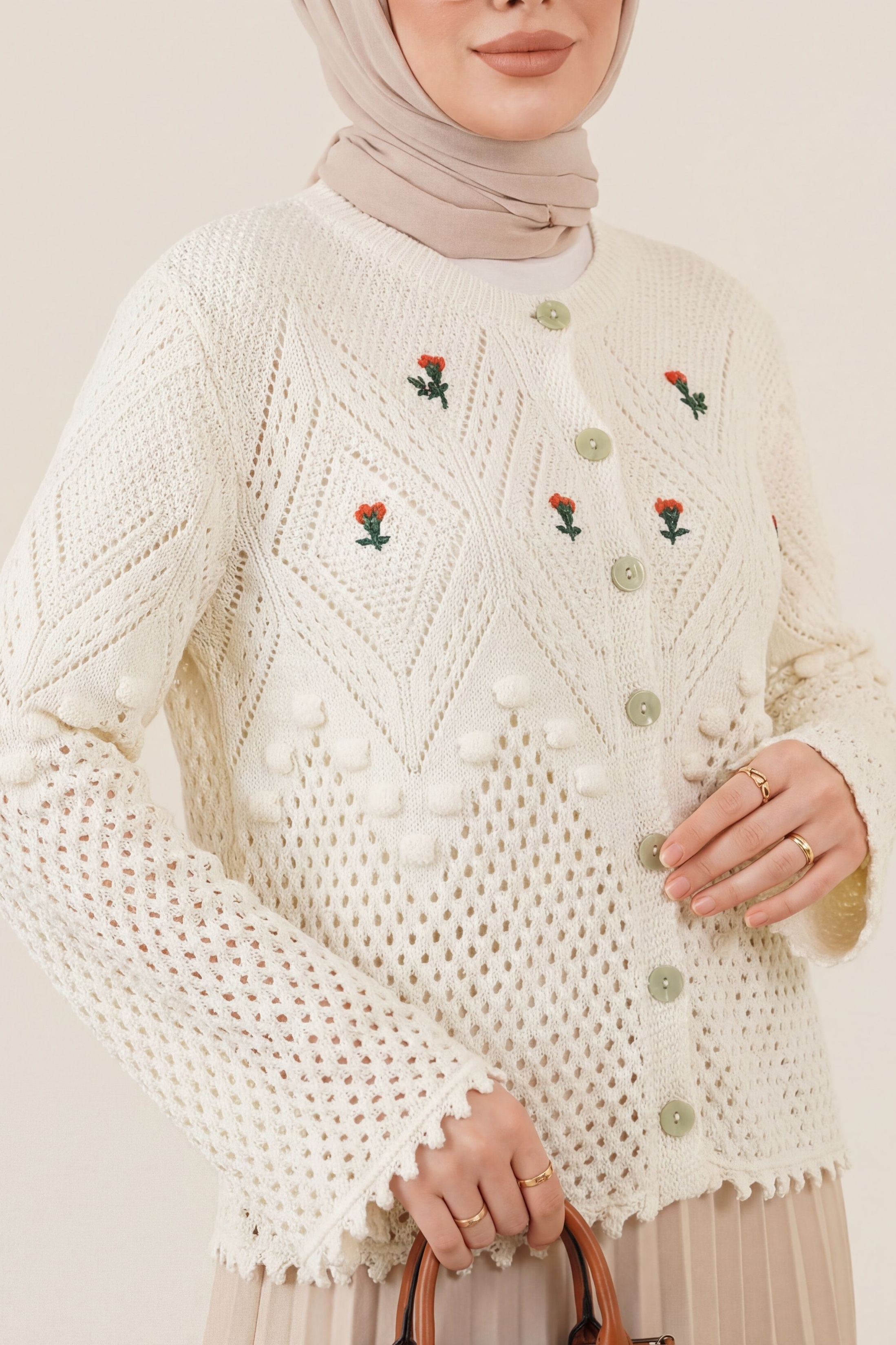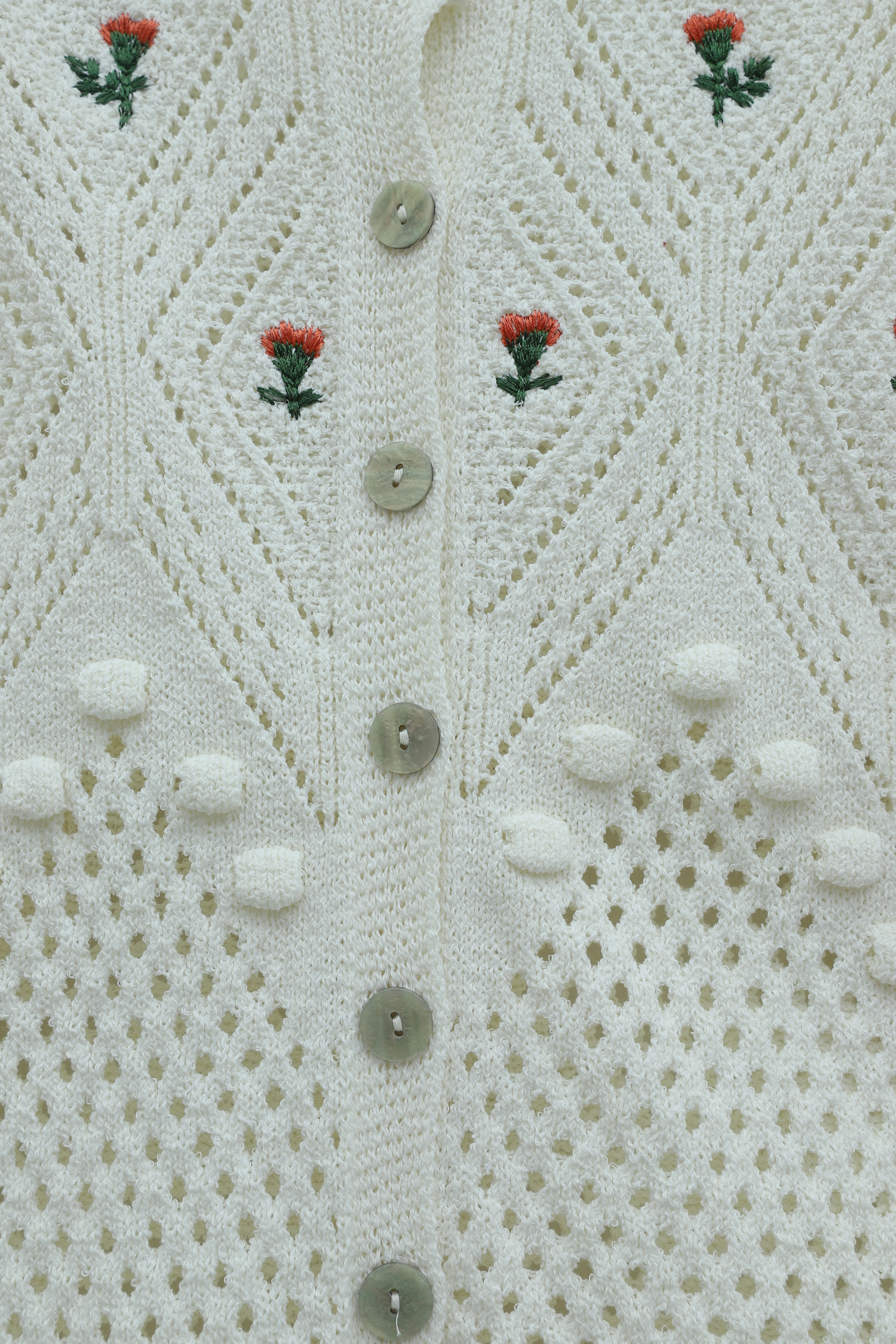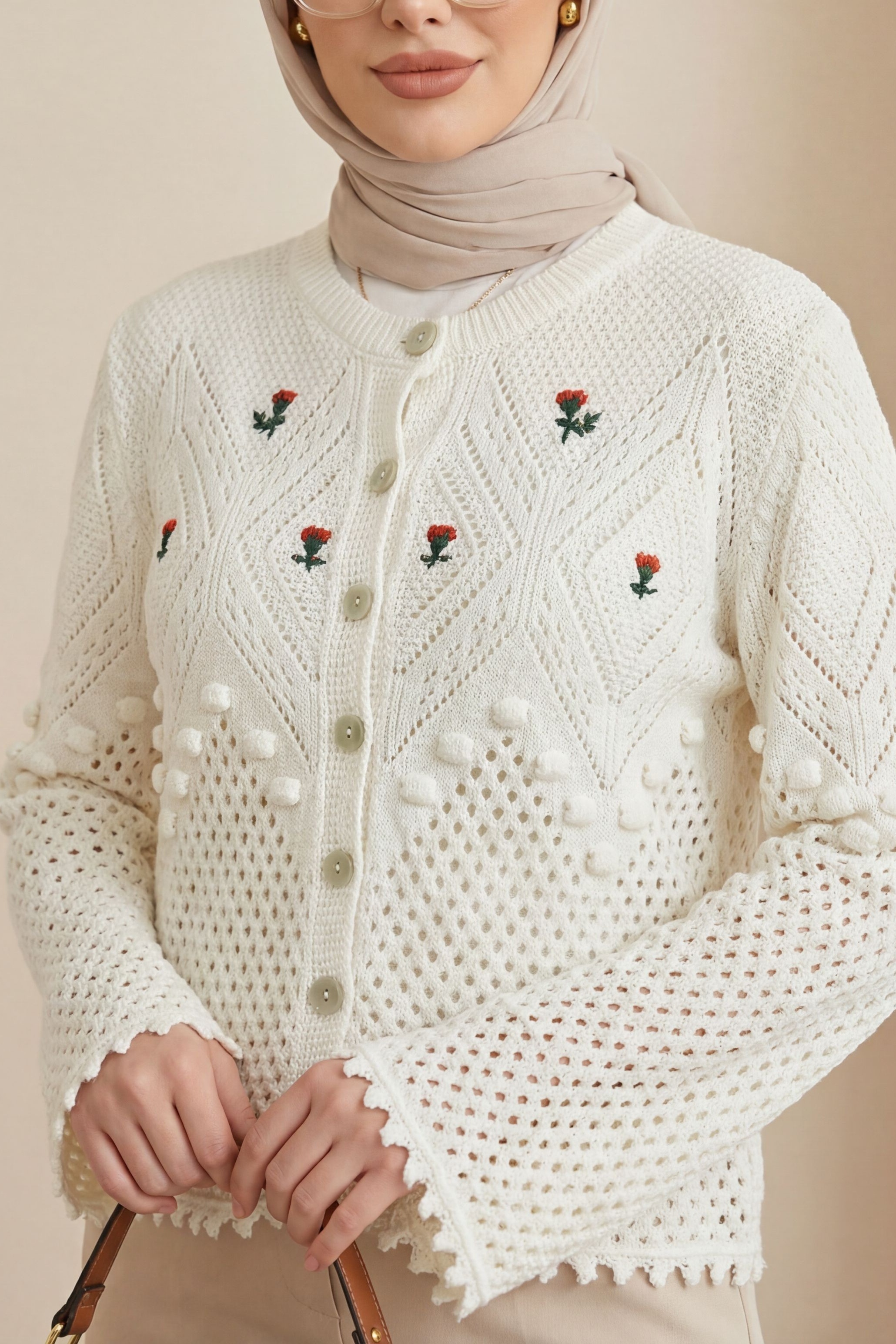 Buttoned Knit Cardigan with Pom-Pom Embroidered Flowers on Front and Sleeves -Ecru