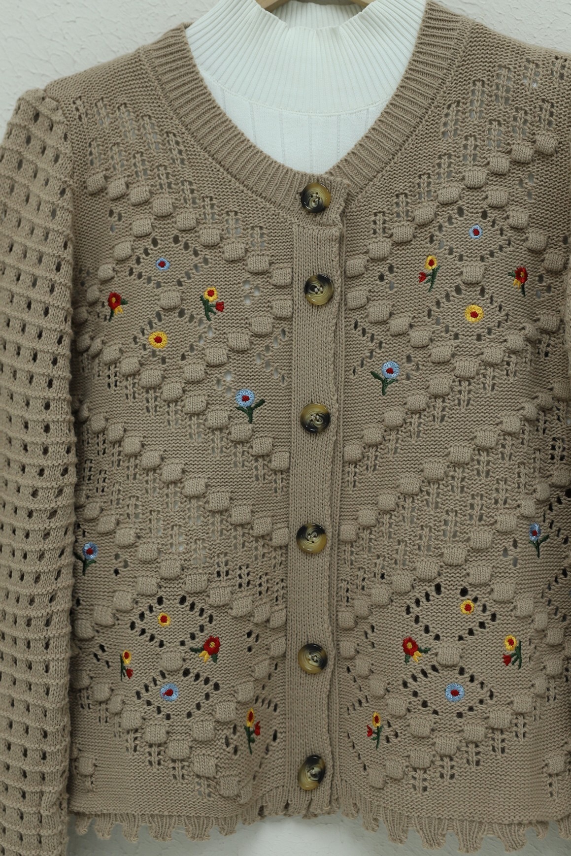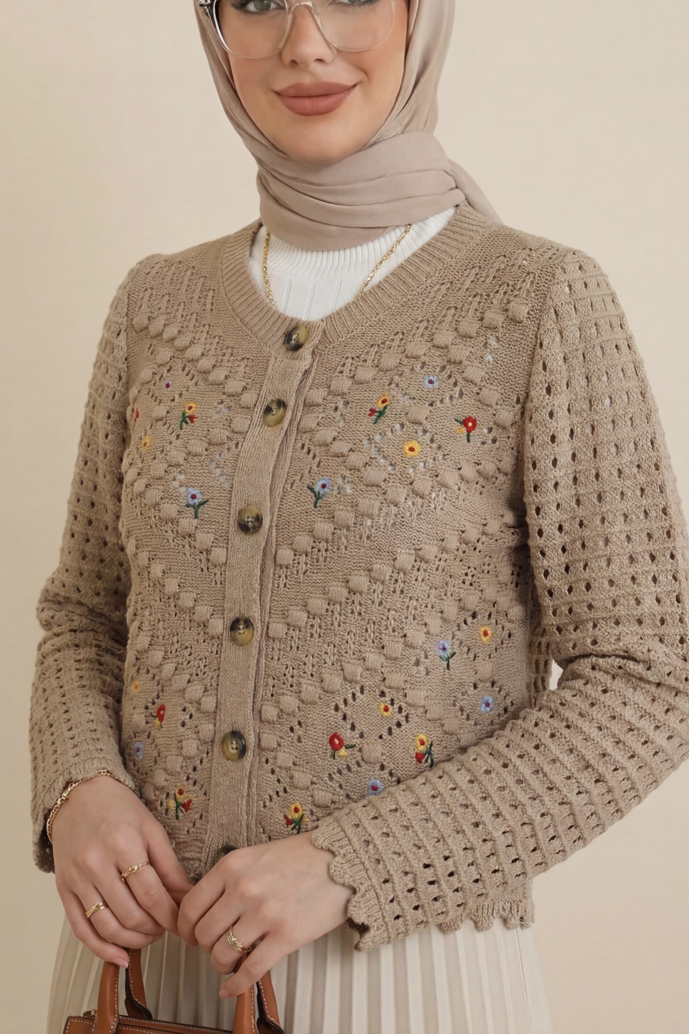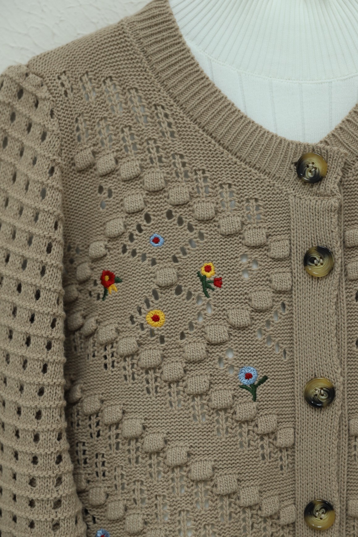 Floral Embroidered Pompom Openwork Knitted Cardigan -Mink color
