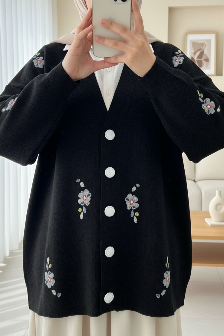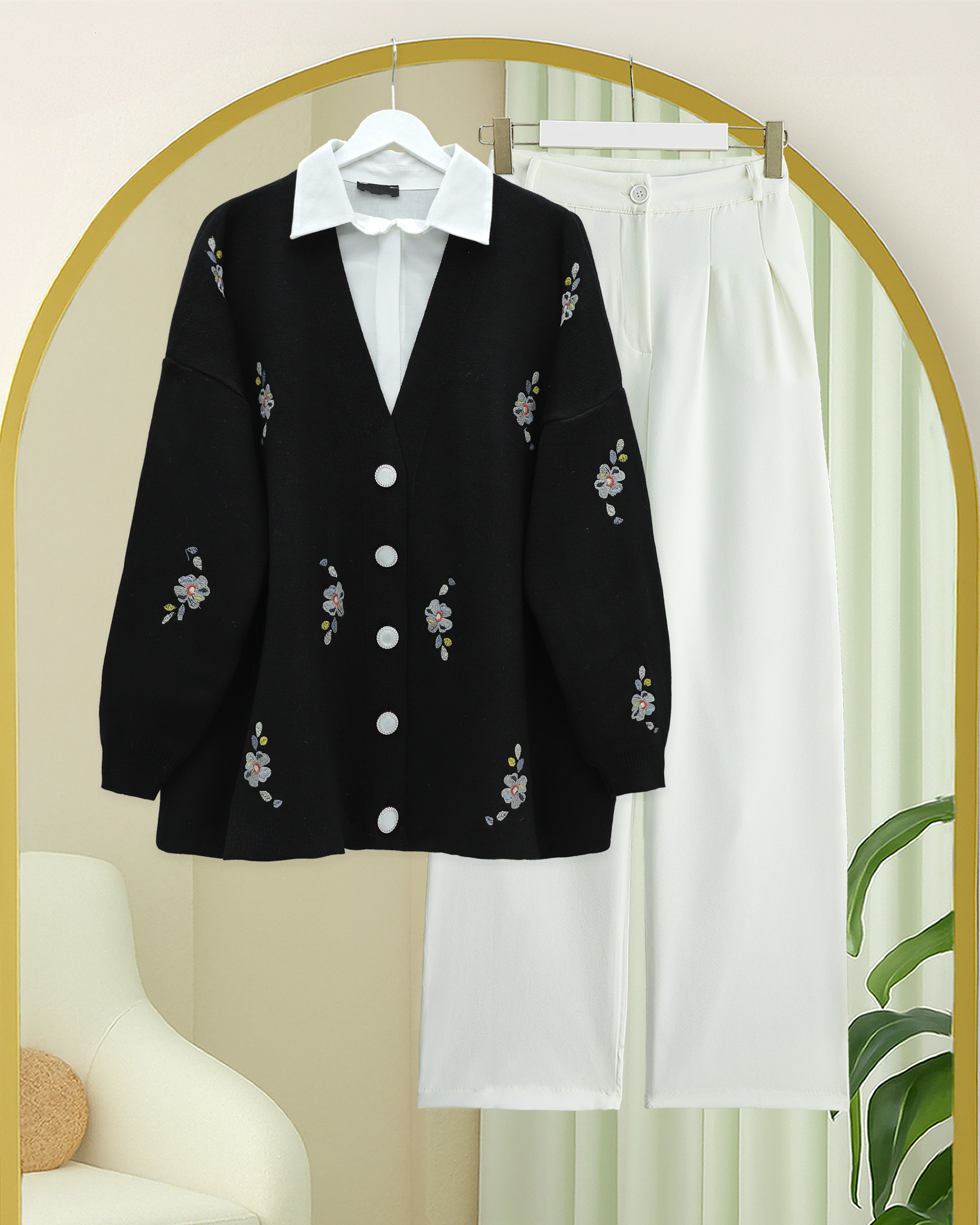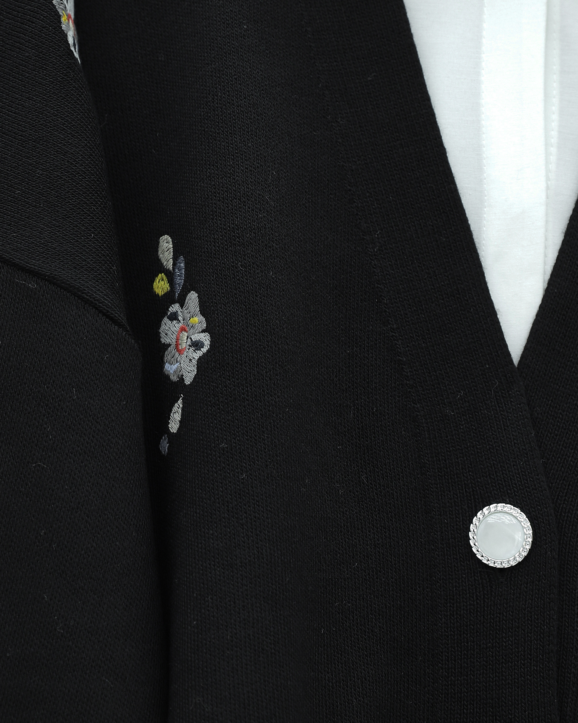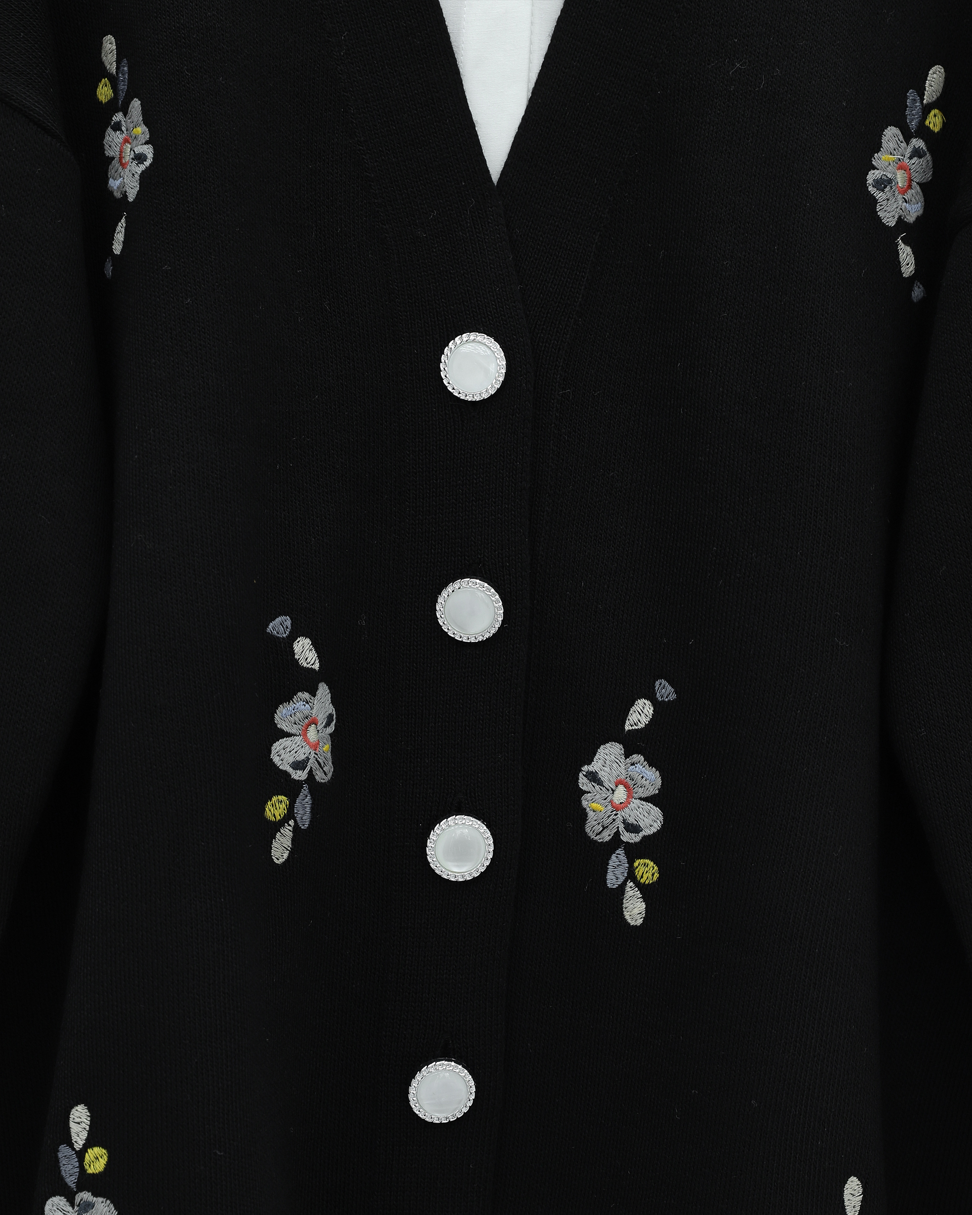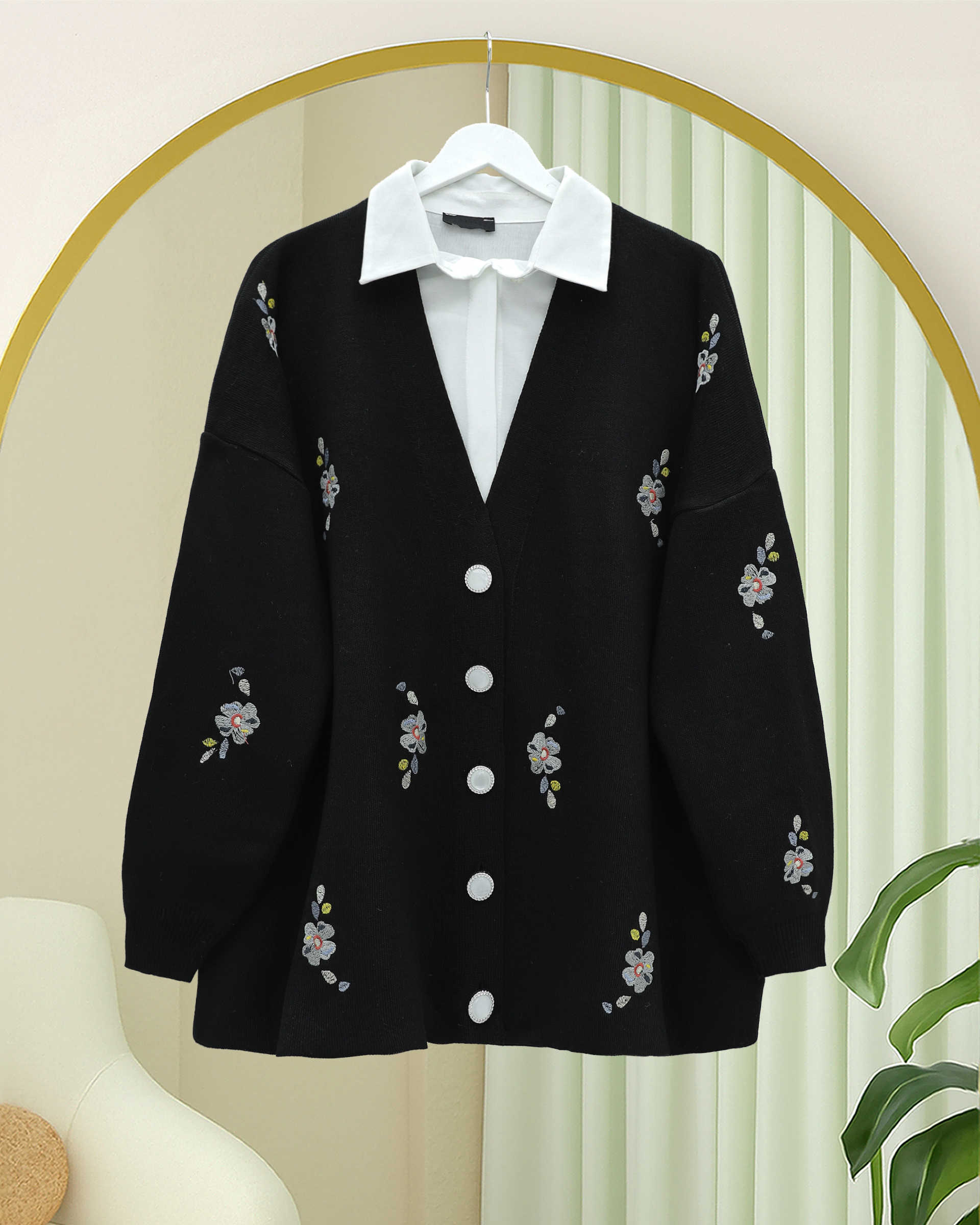 Floral Embroidered Shiny Buttoned Knit Cardigan -Black