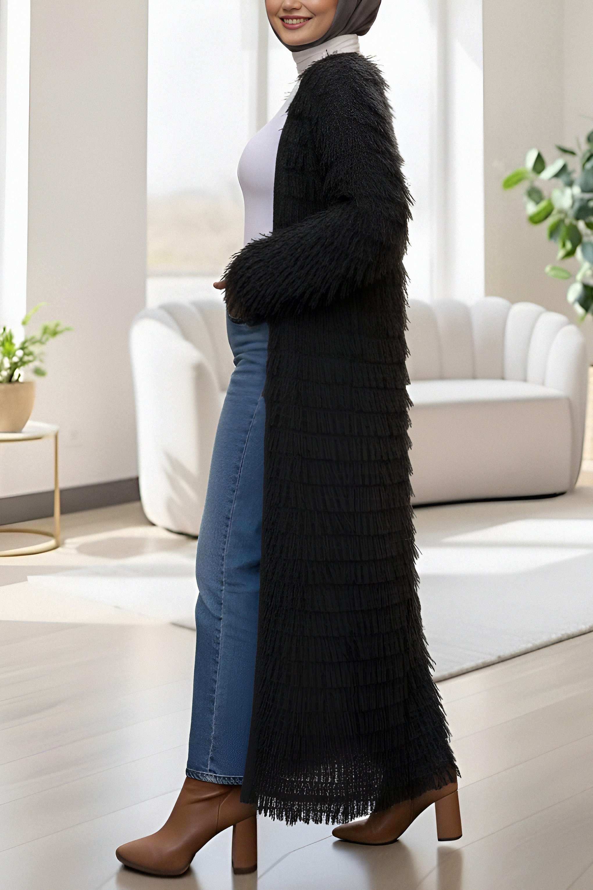 Fringed Long Knit Cardigan -Black