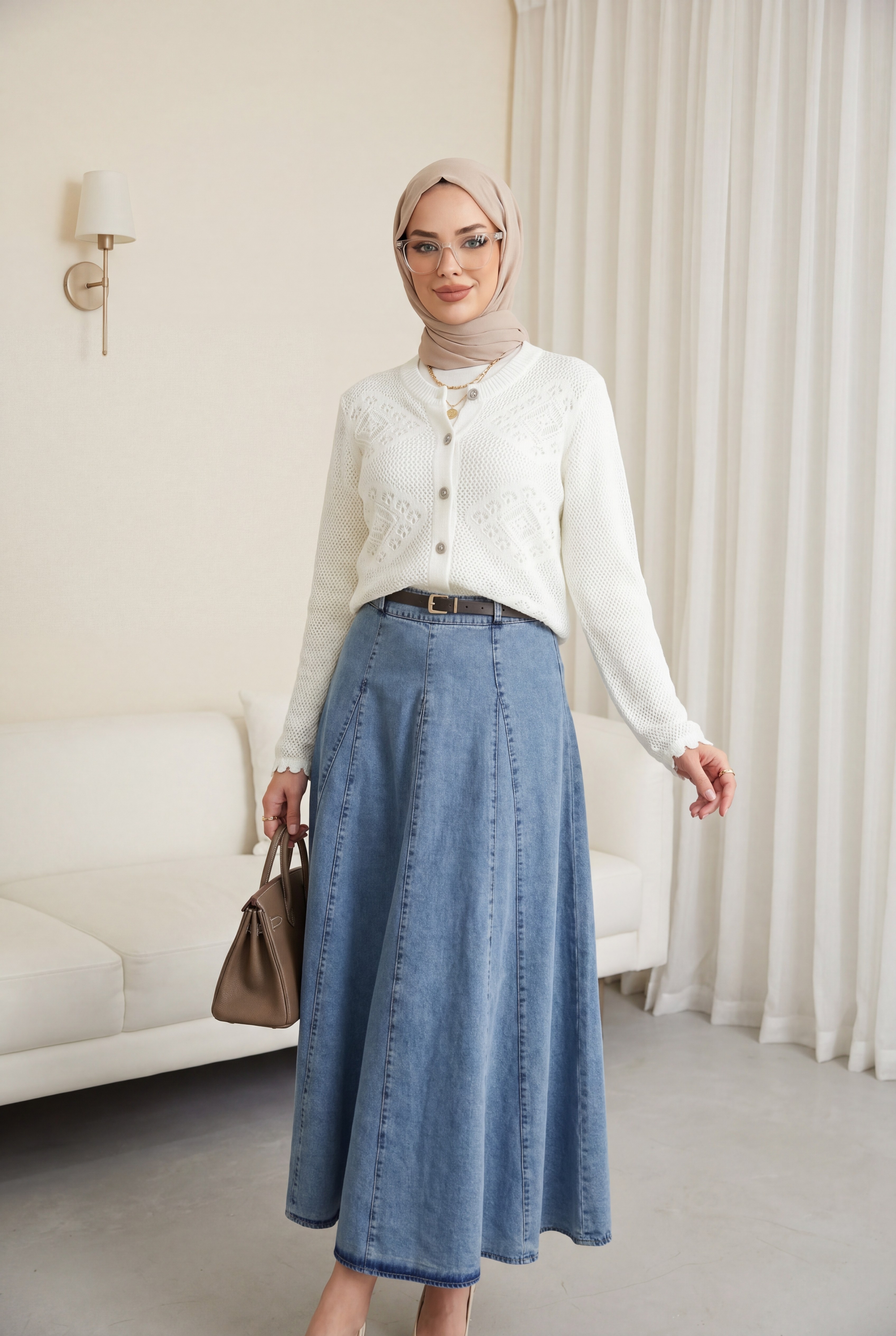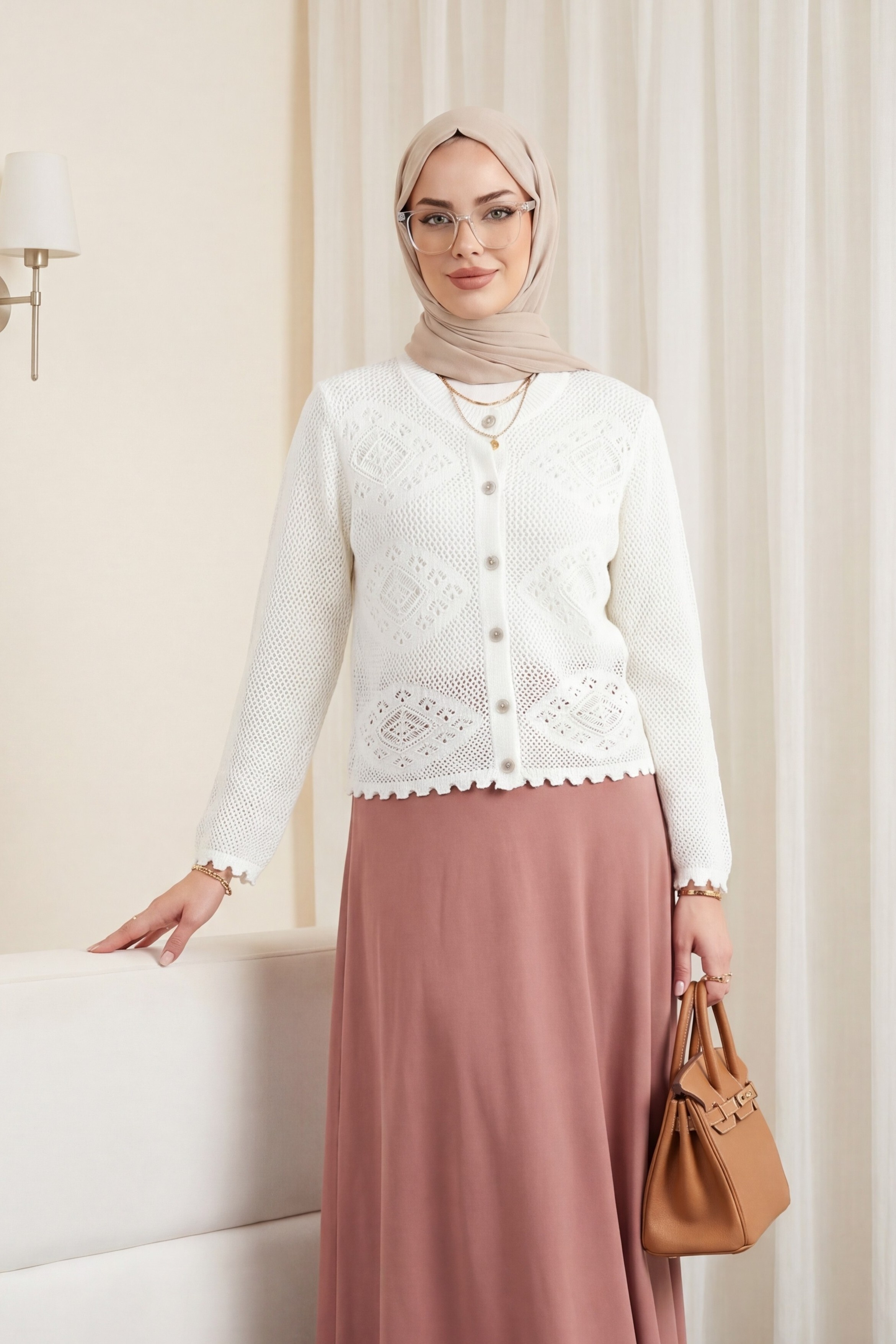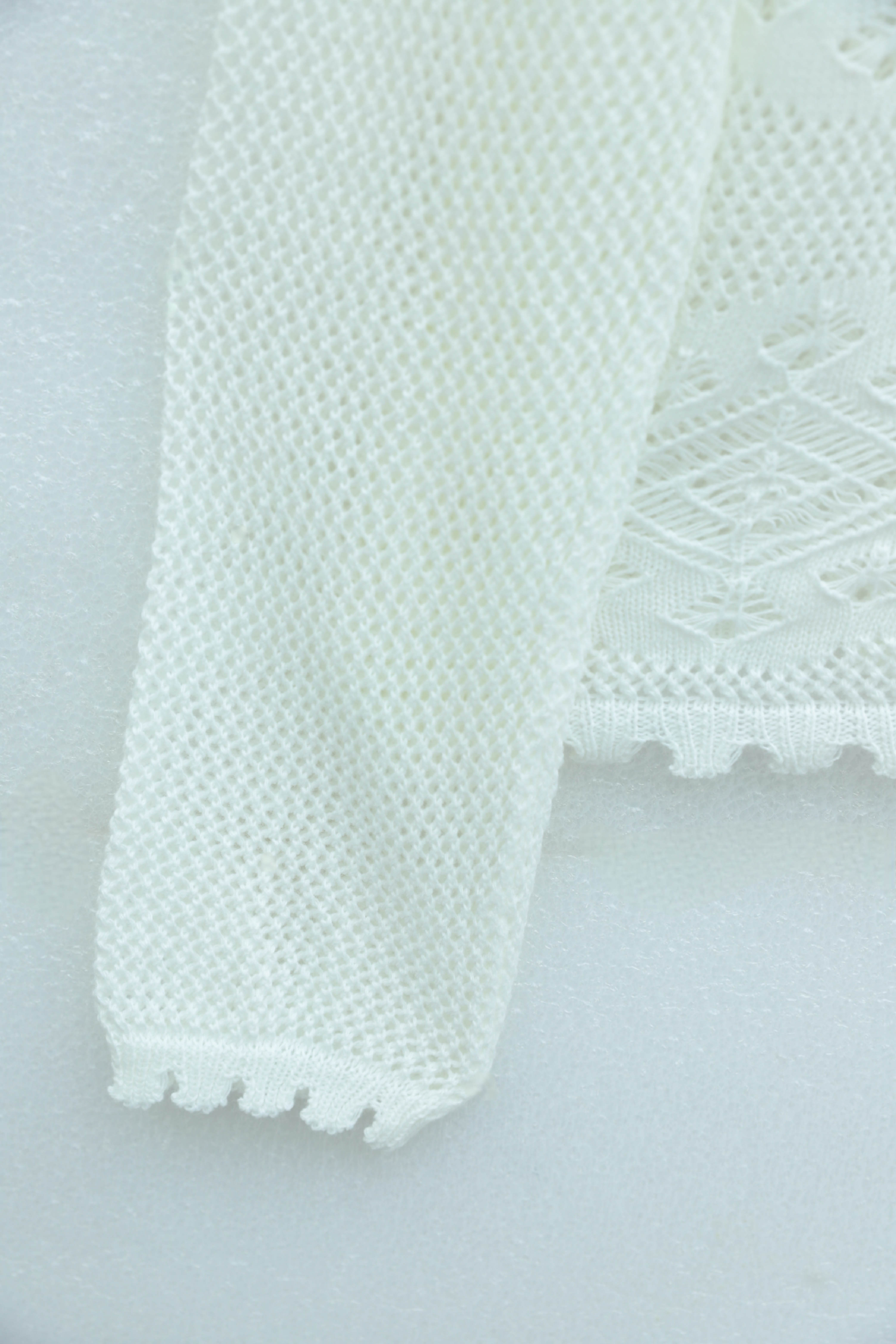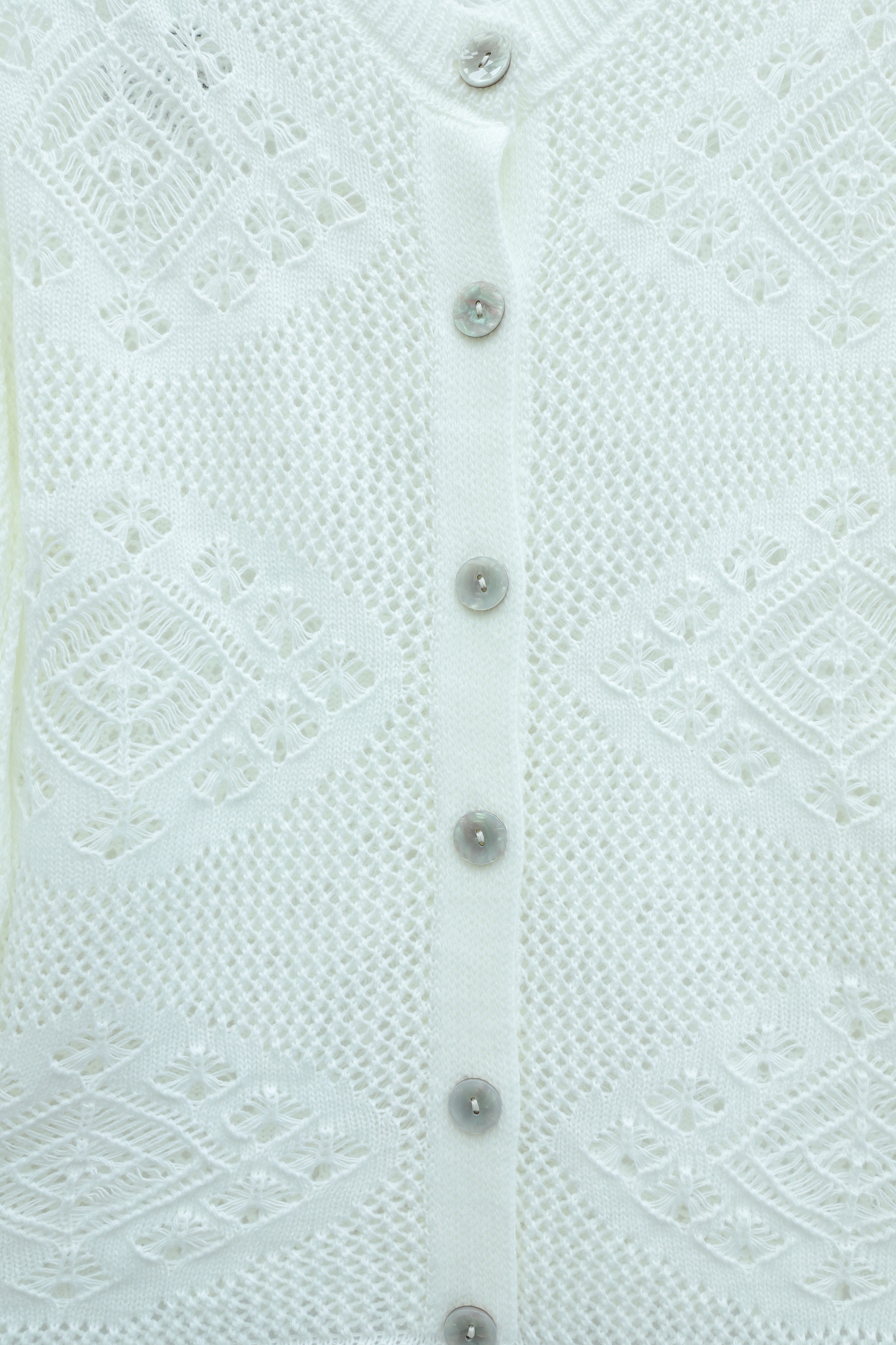 Geometric Patterned Openwork Buttoned Knit Cardigan -Ecru
