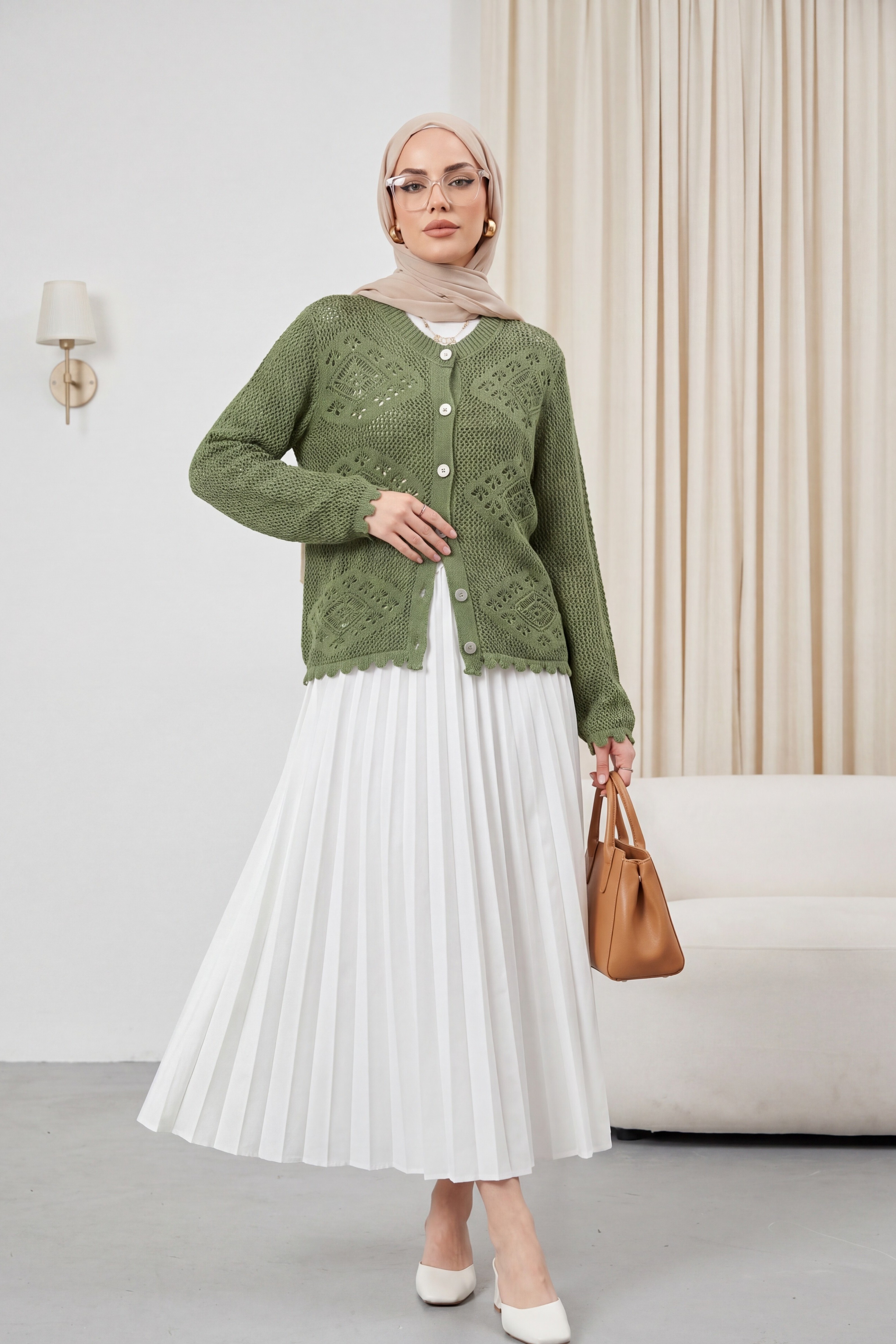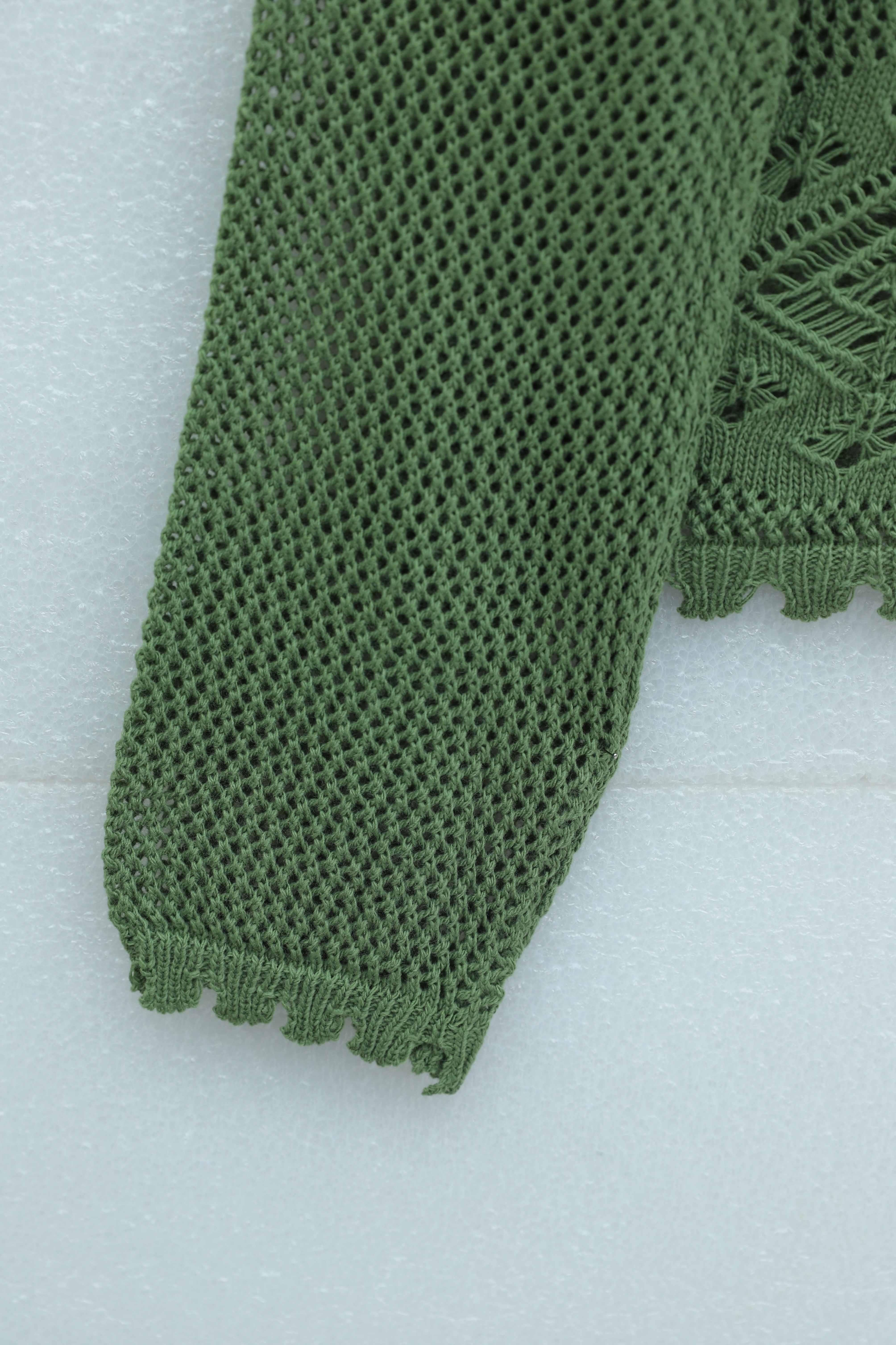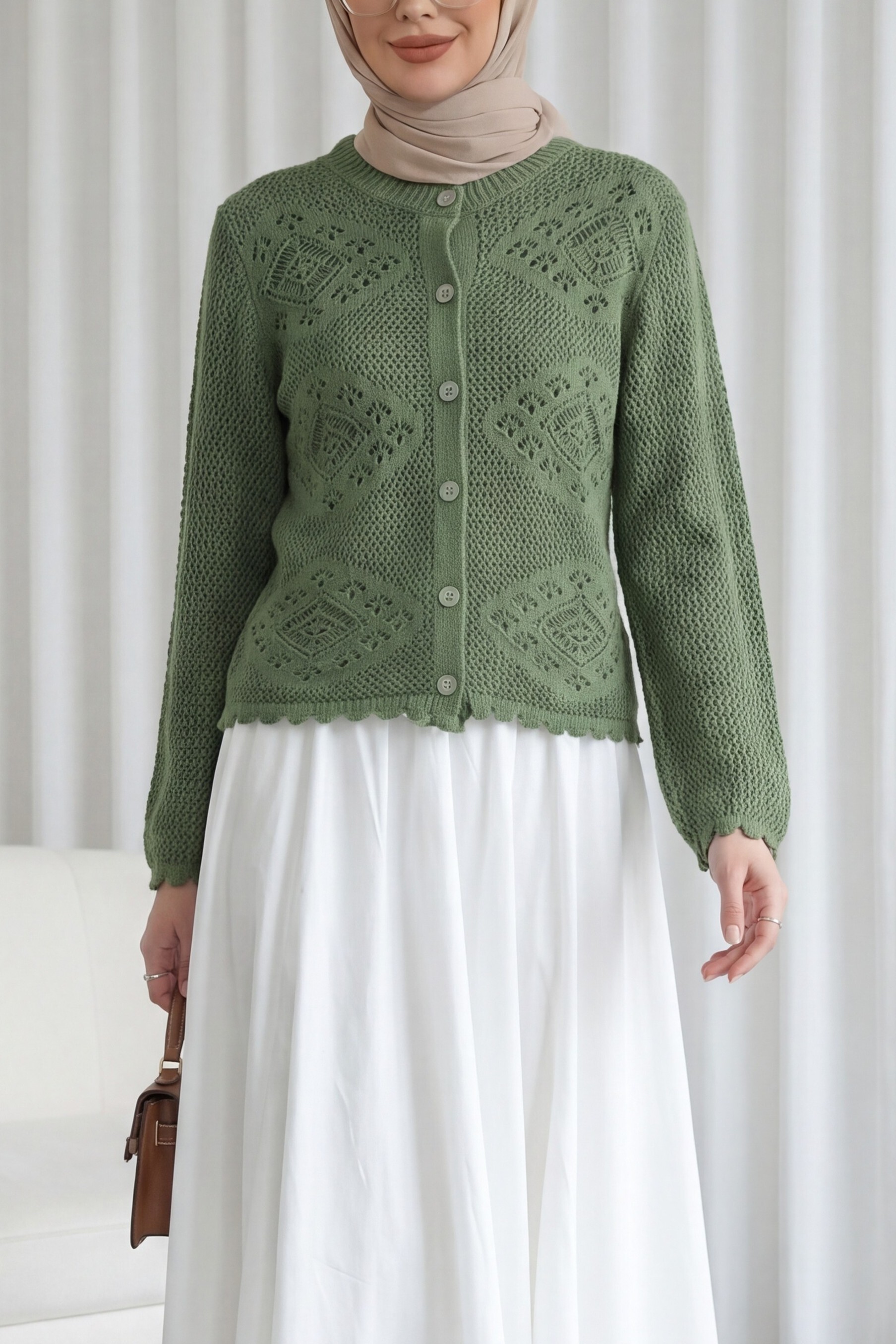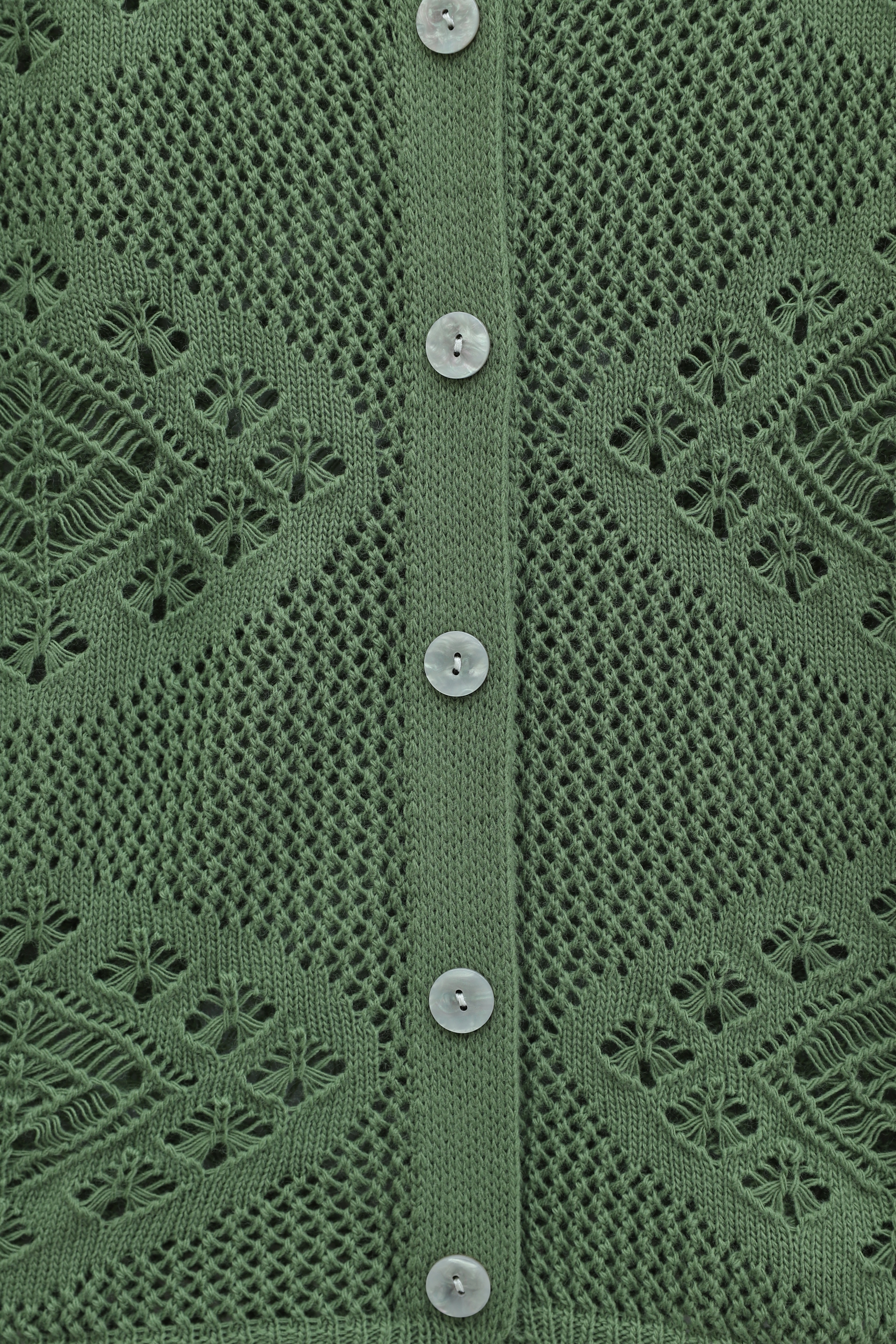 Geometric Patterned Openwork Buttoned Knit Cardigan -Green