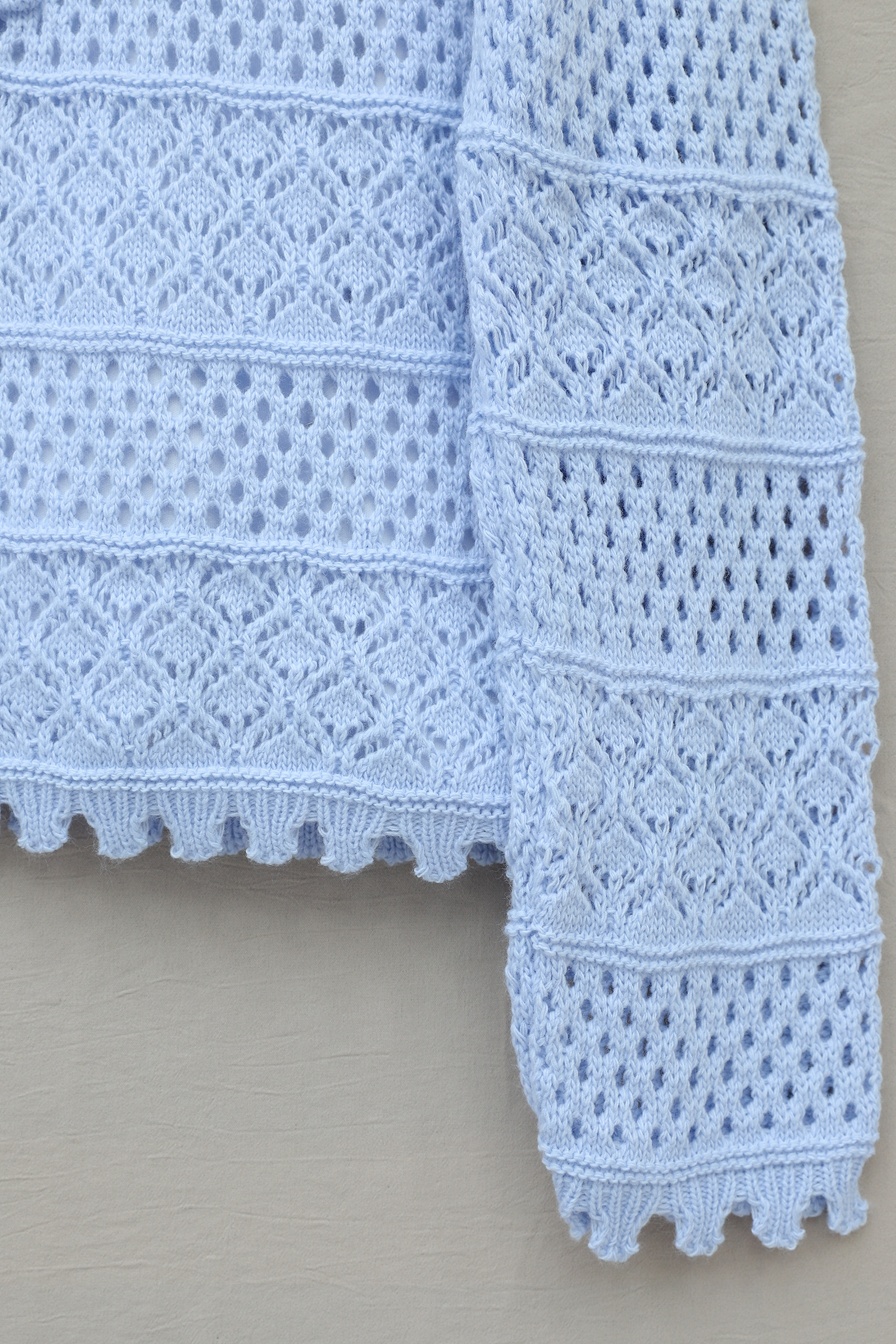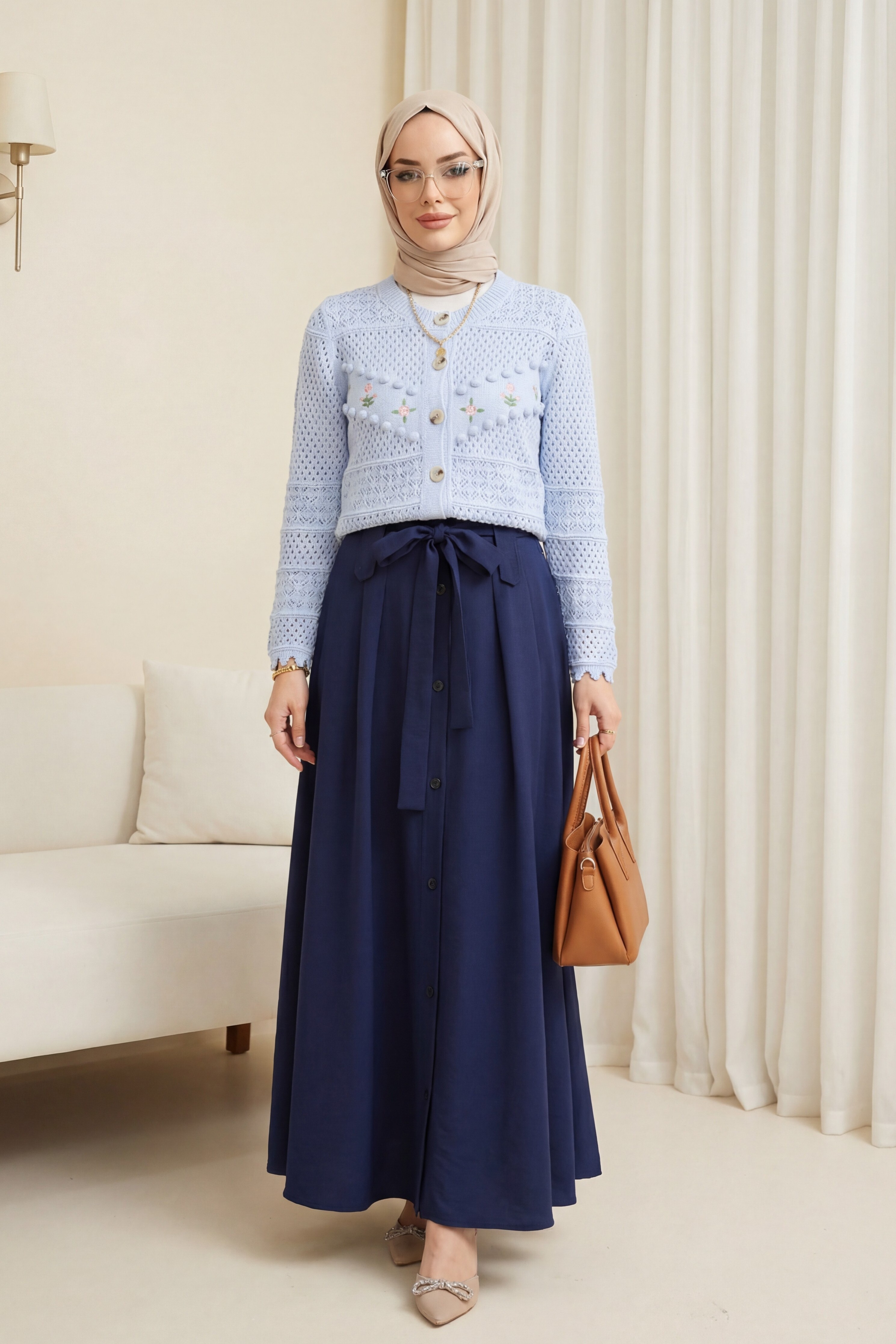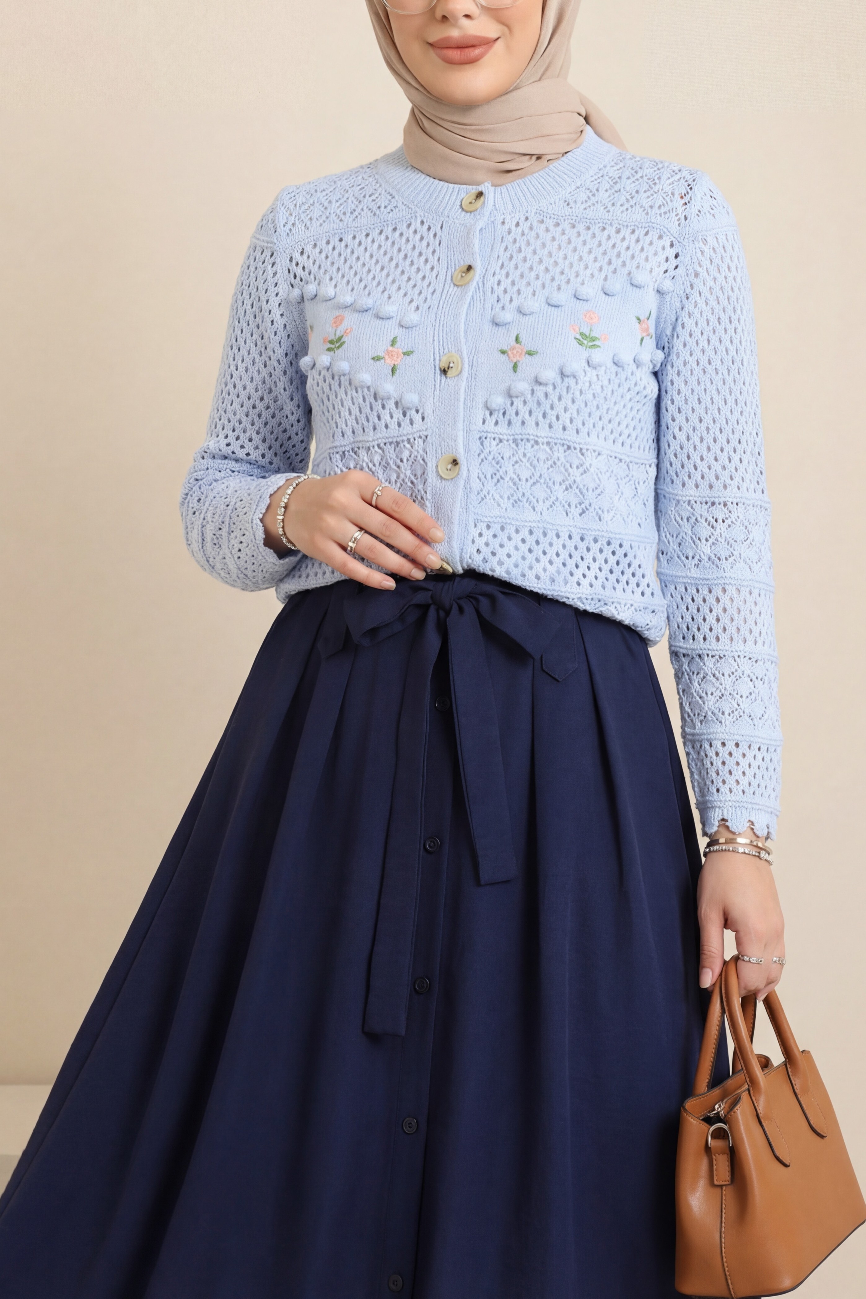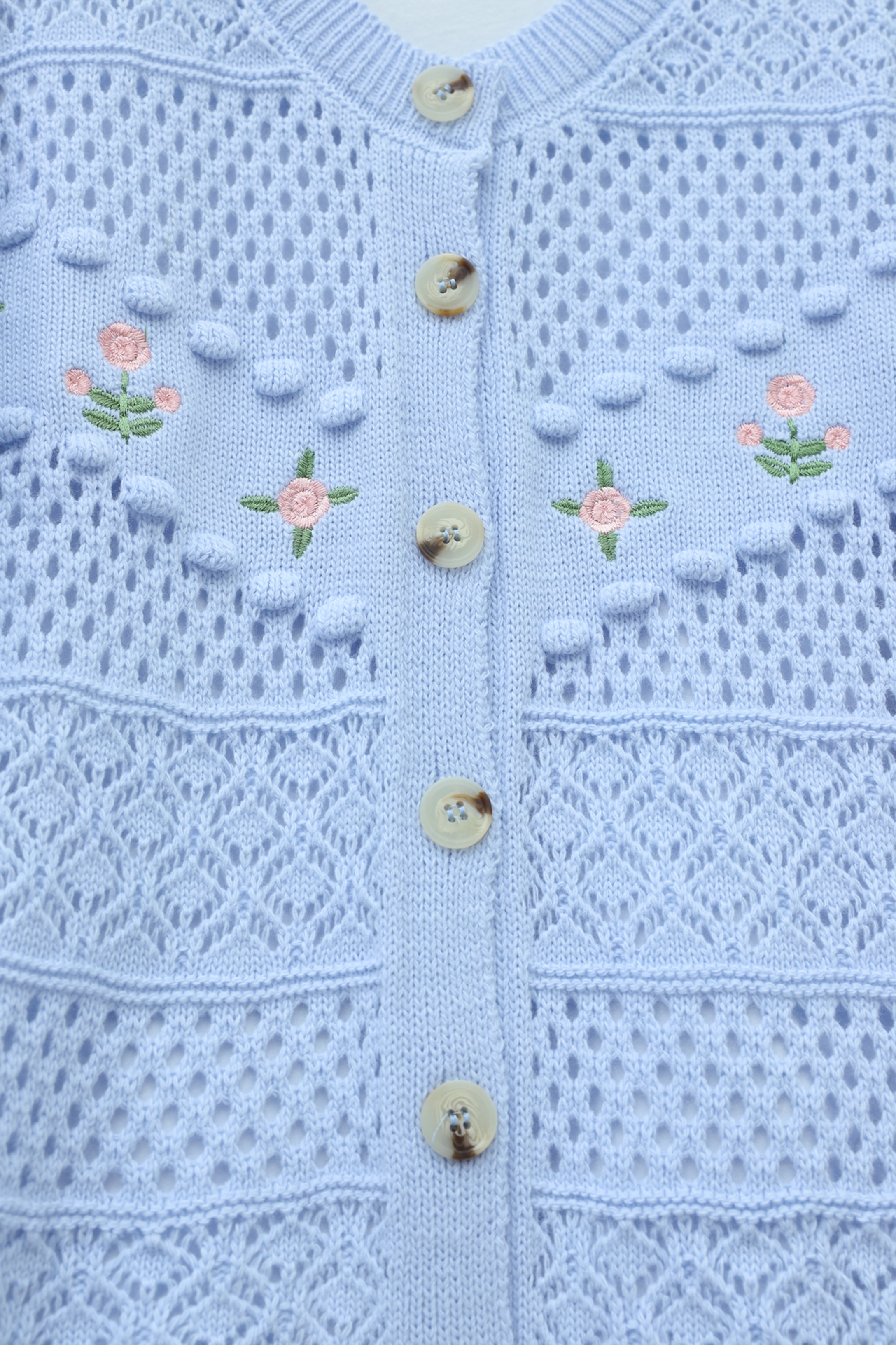 Knitted Cardigan with Floral Embroidery, Pom-Pom and Button Closure -Baby Blue