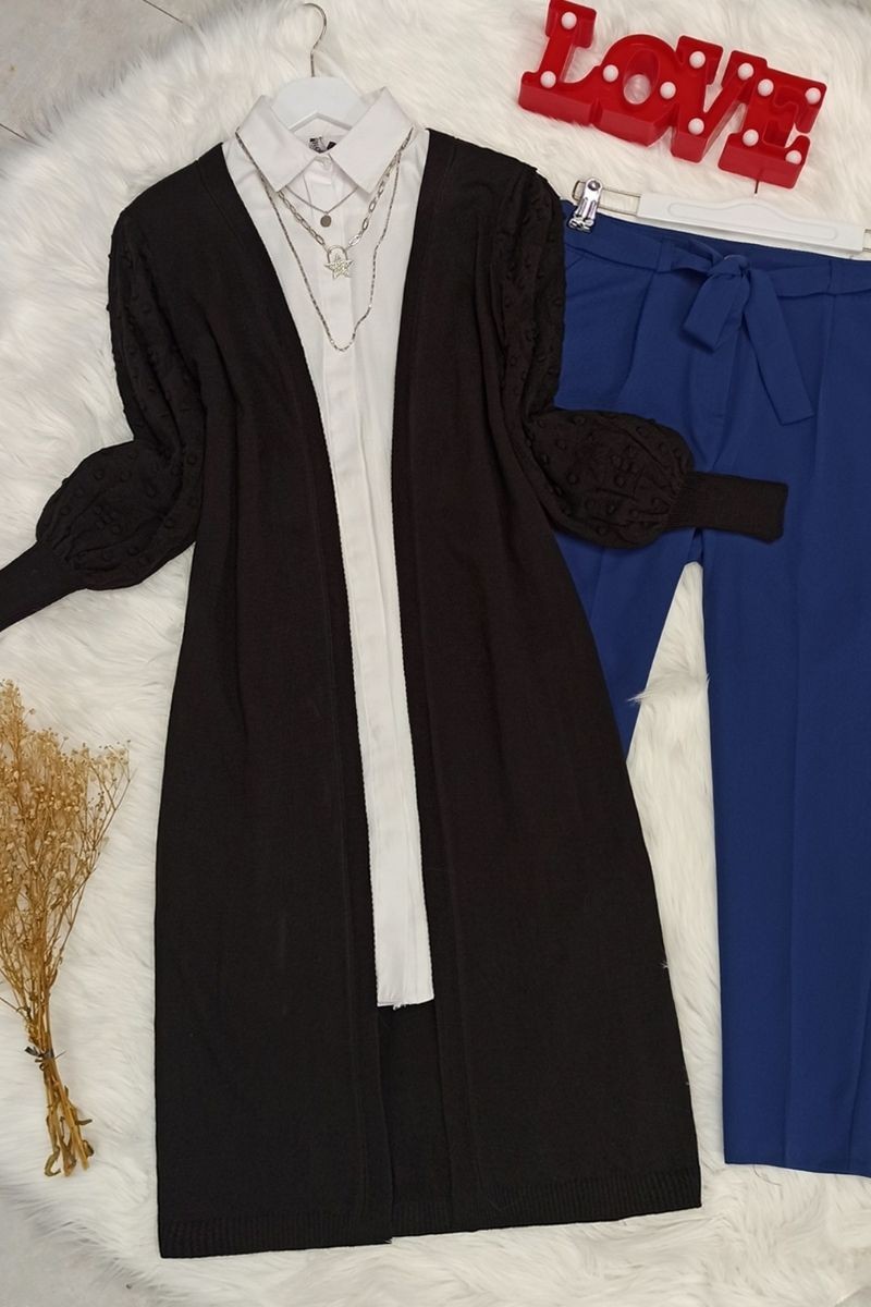 Our cardigan model with balloon sleeves, pompom shoulders and elastic cuffs is among the most preferred models.