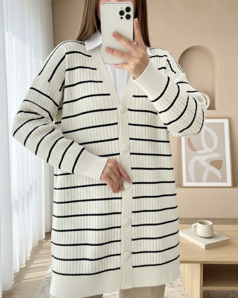 Depending on the user and region, this product can also be called comfortable knitwear cardigan, hijab knitwear cardigan, daily knitwear cardigan, seasonal knitwear cardigan, winter knitwear cardigan, hijab knitwear cardigan models, knitwear cardigan, striped cardigan.
