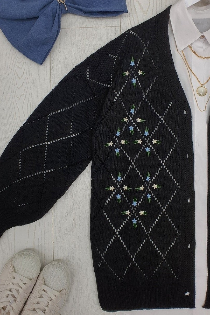 Openwork Floral Embroidered Buttoned Knitwear Cardigan -Black