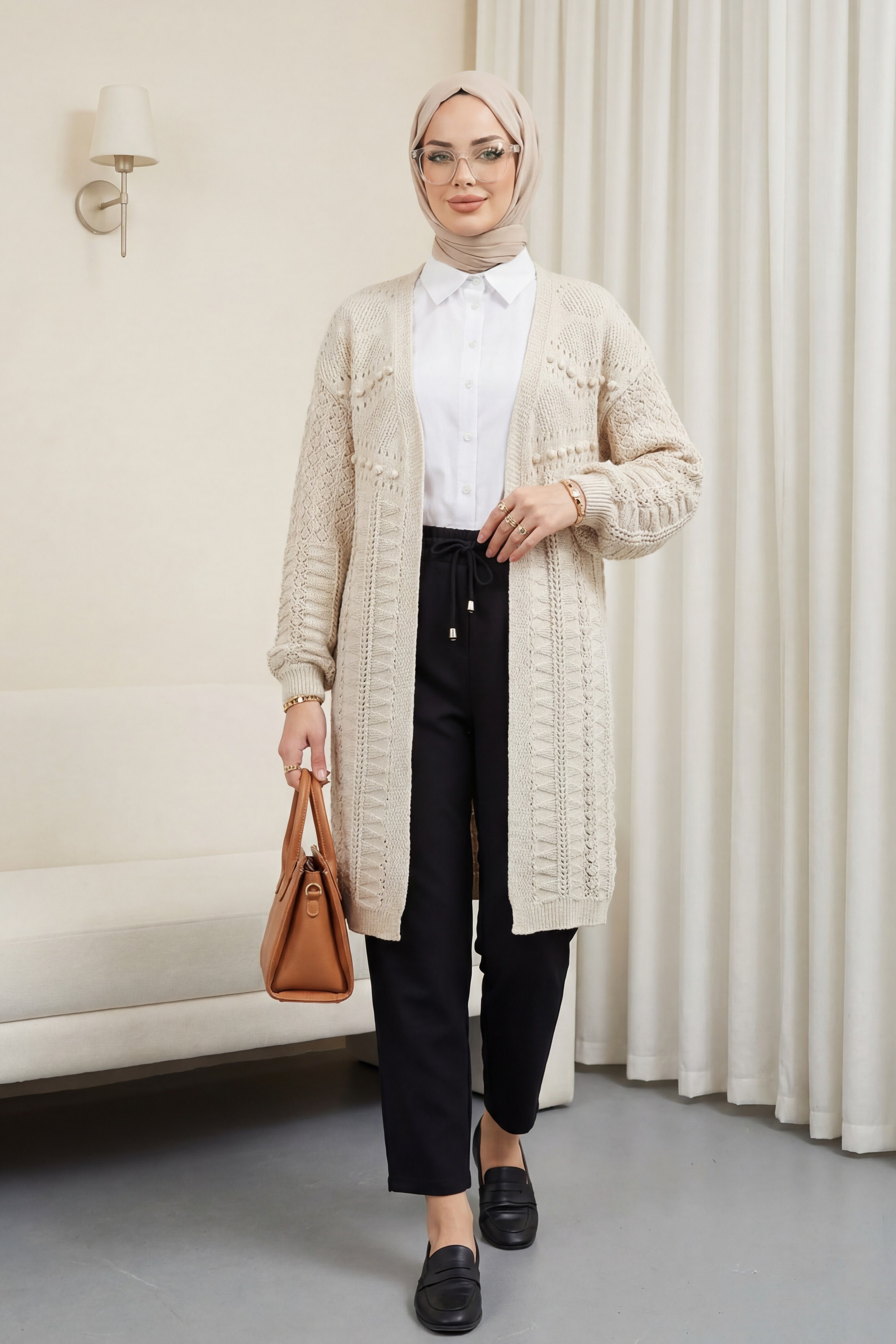 Pom-pom embellished mixed pattern mid-length knitted cardigan -Stone