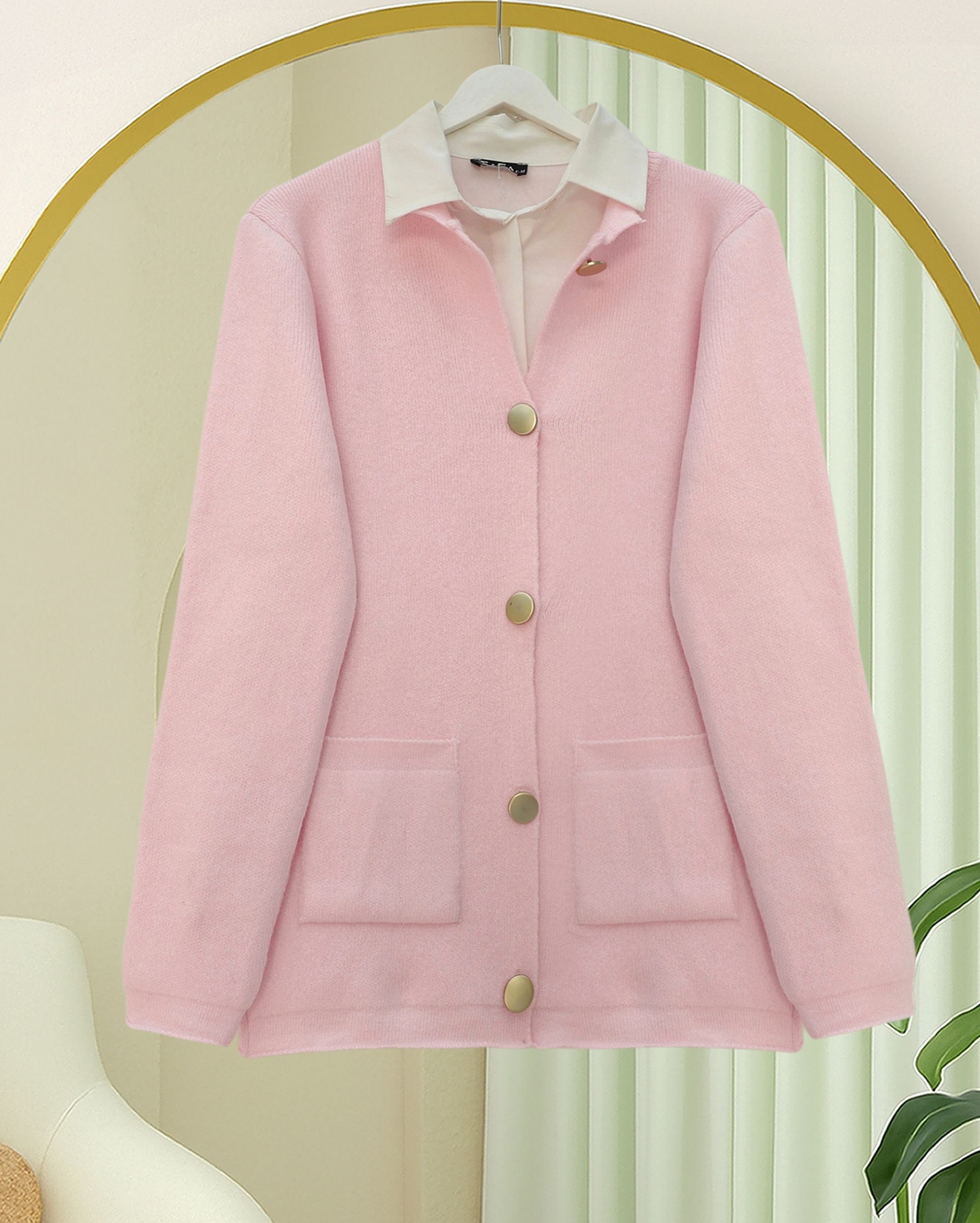 Soft Knit Cardigan with Buttoned Front and Double Pockets -Powder