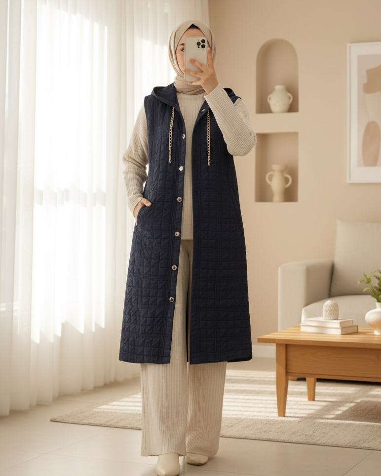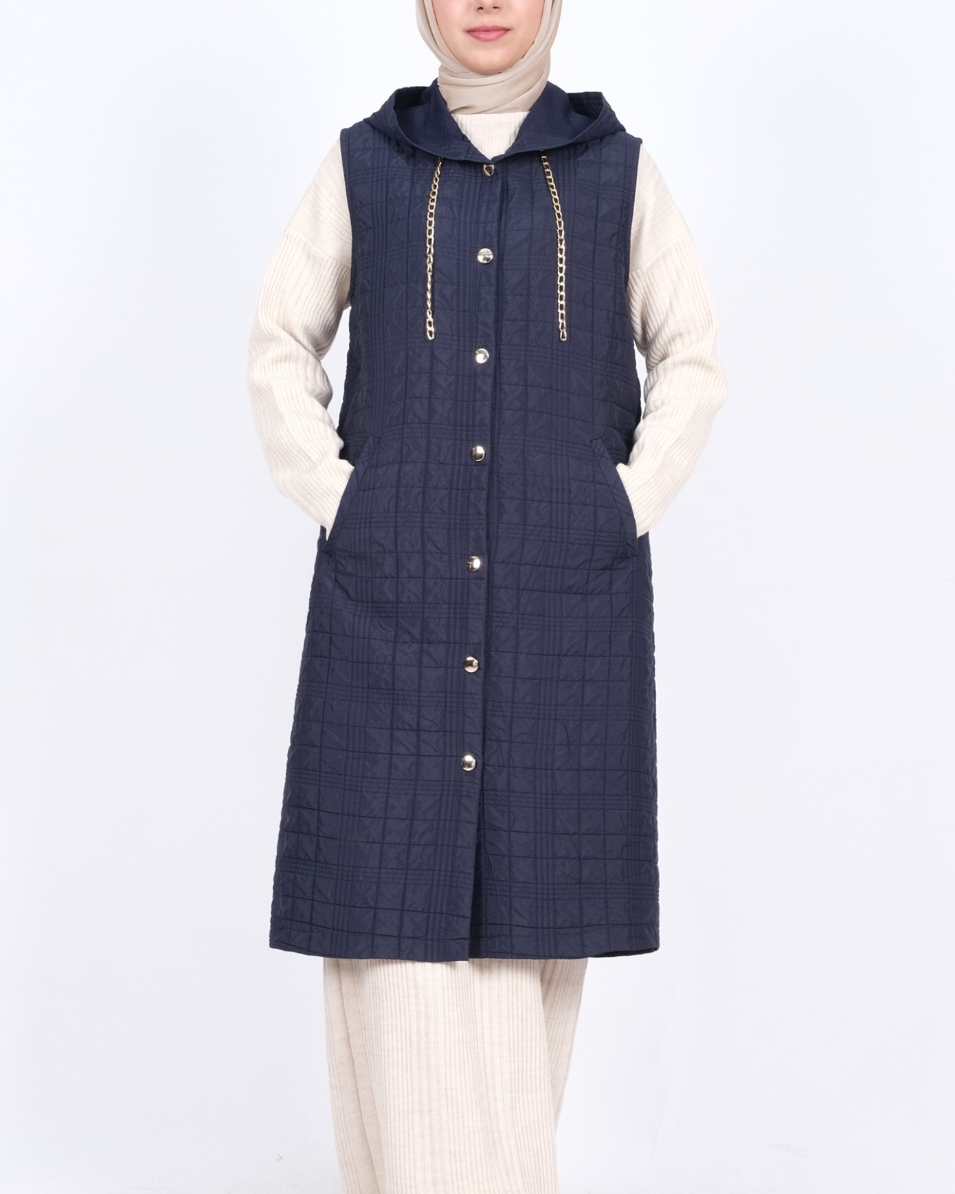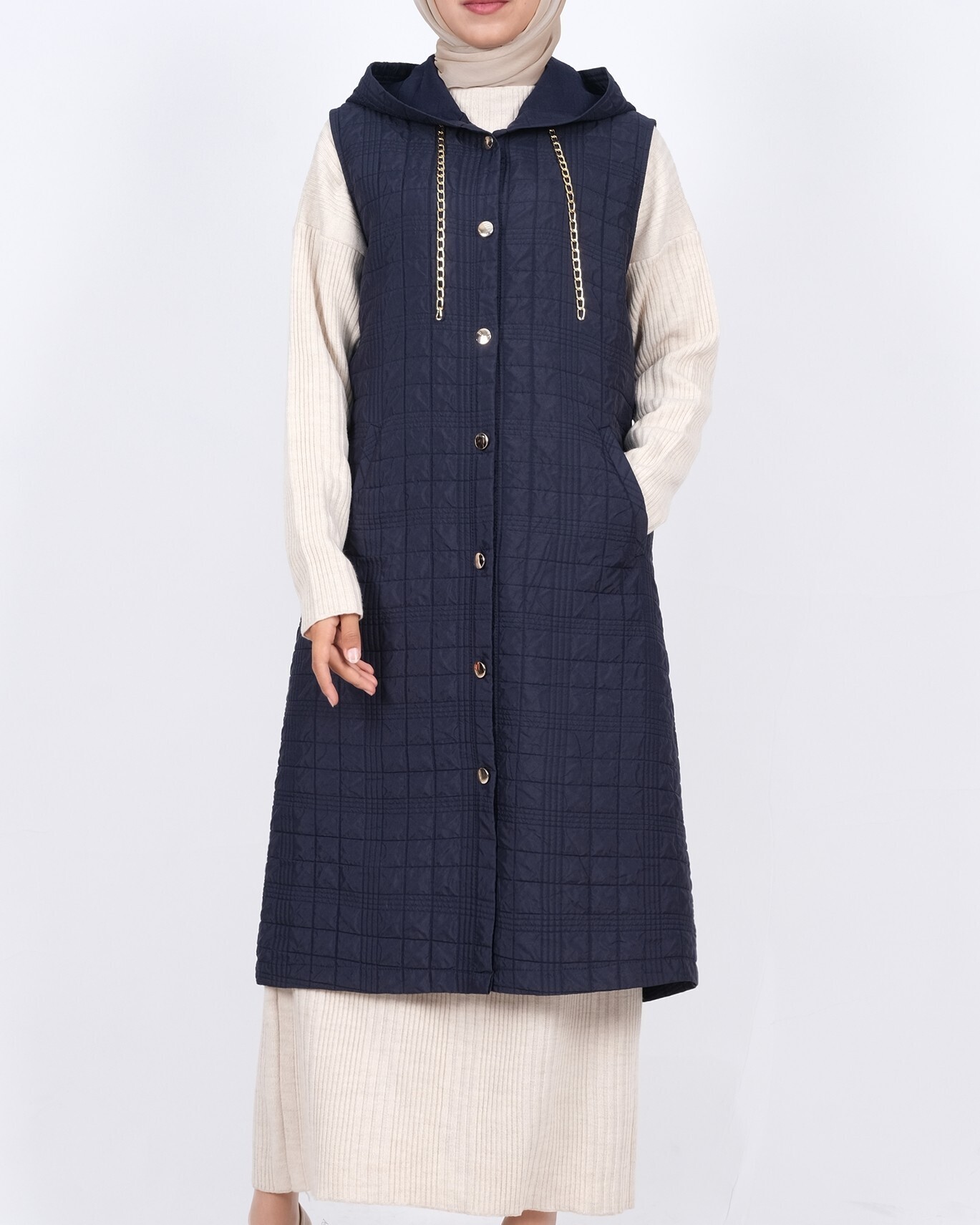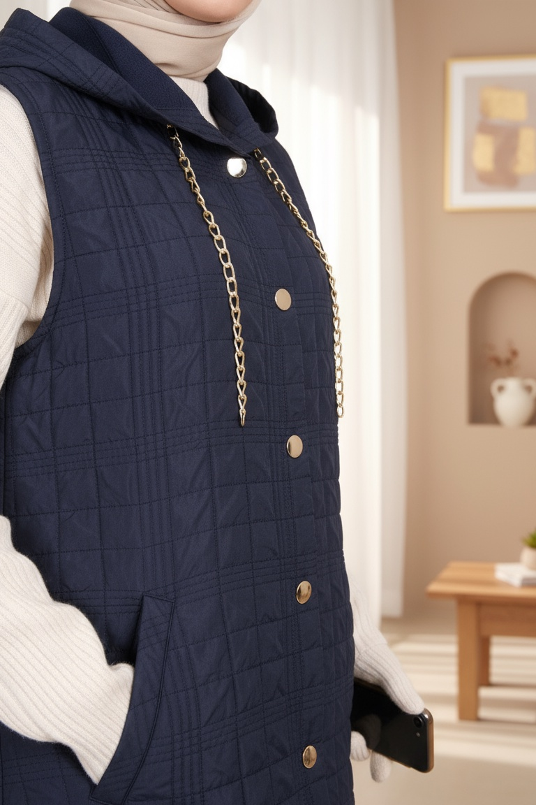 Hooded Chain Detailed Quilted Vest with Pockets -Navy blue