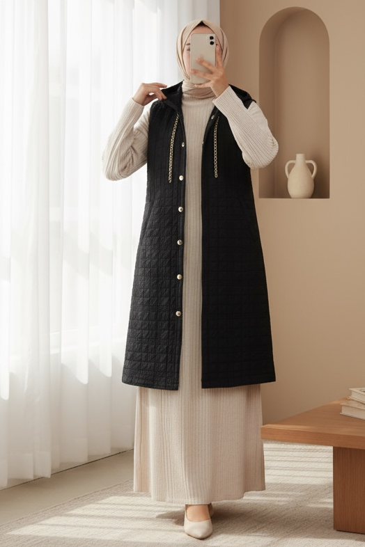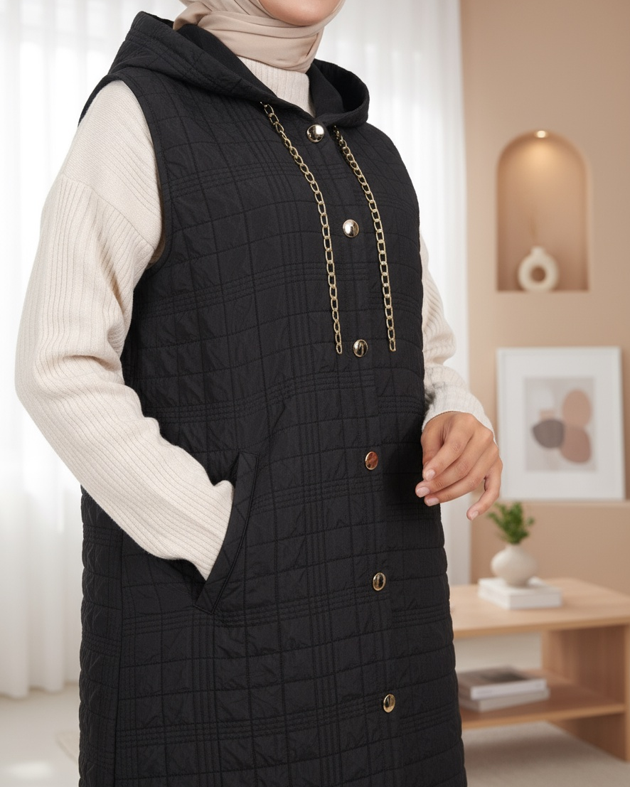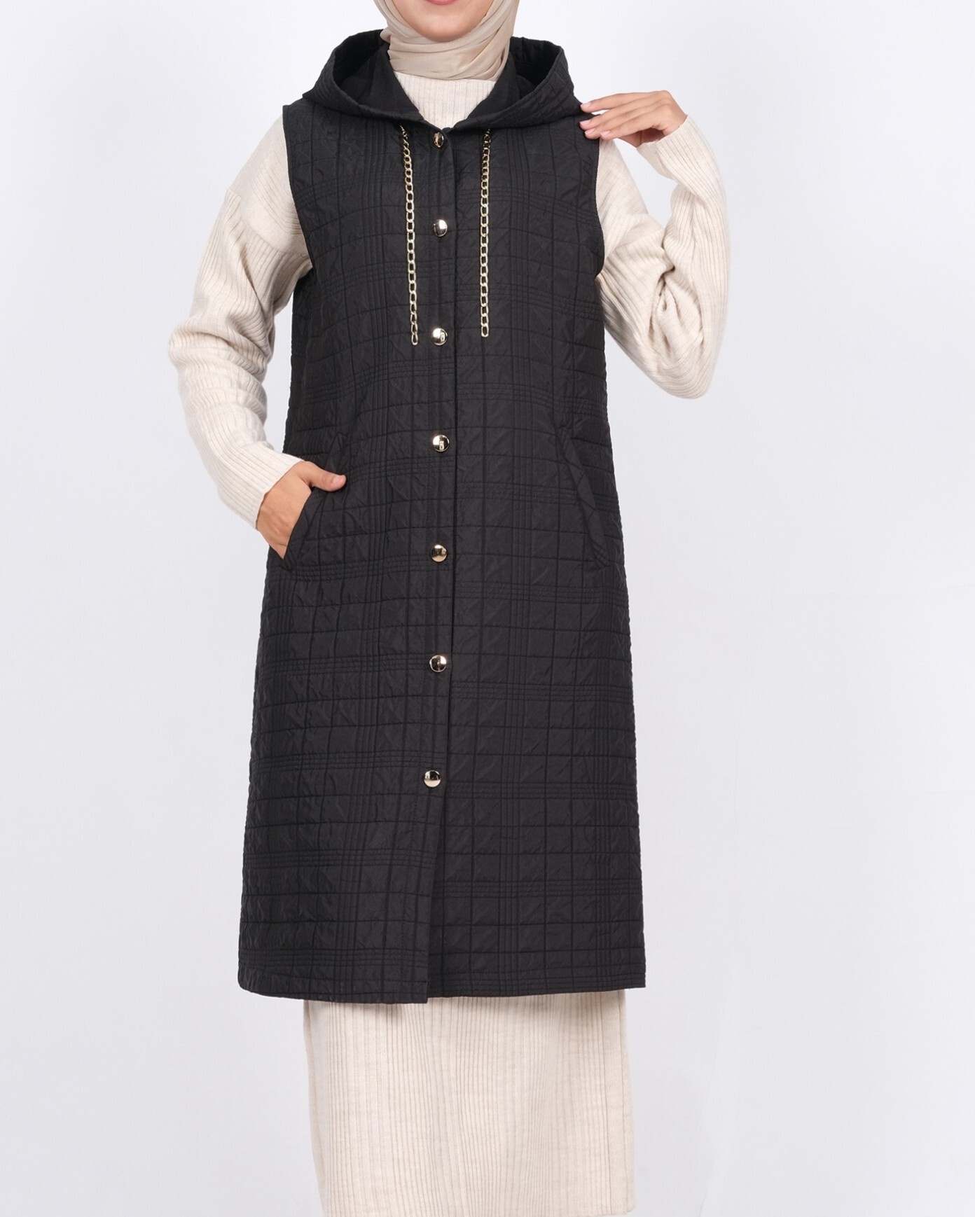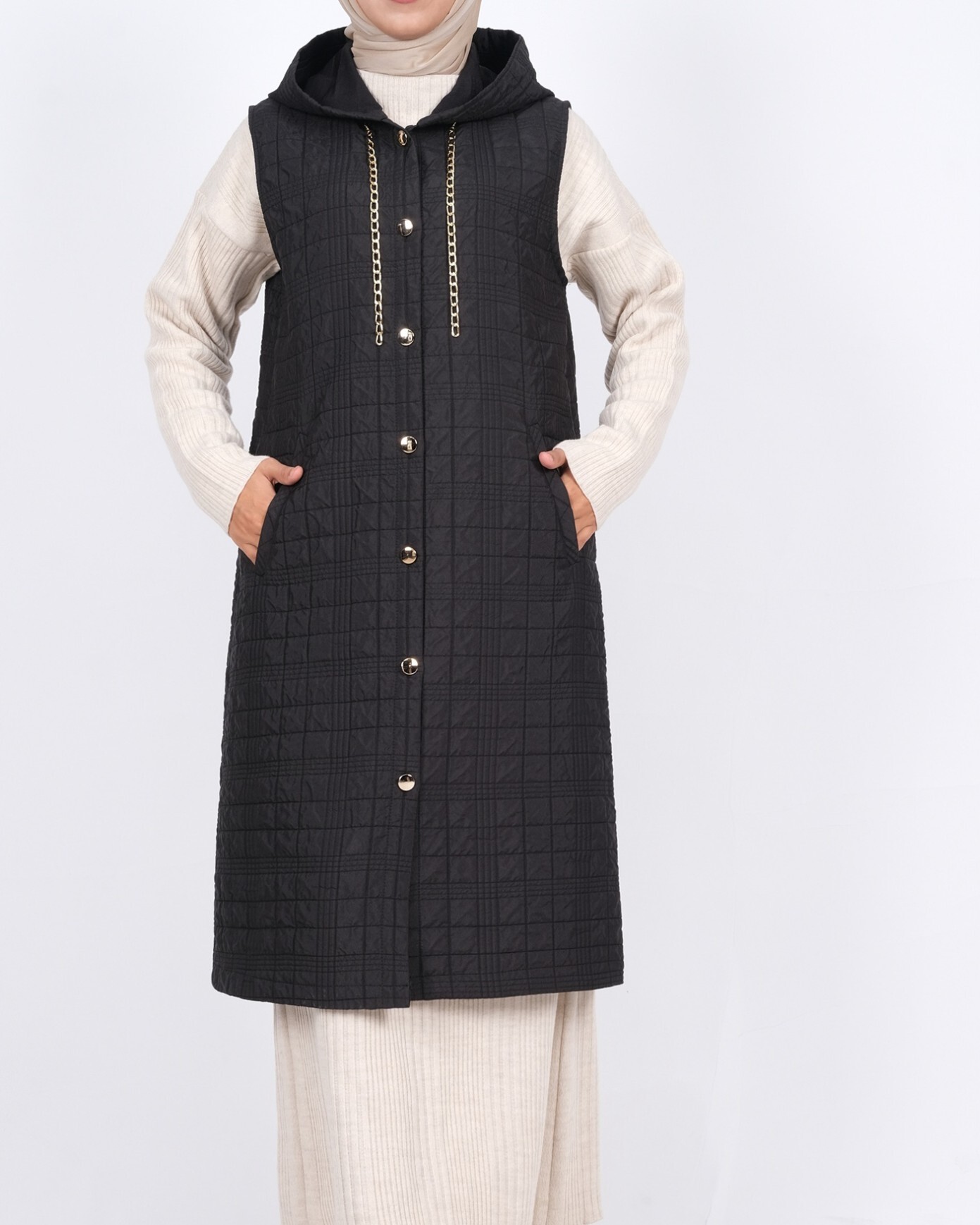 Hooded Chain Detailed Quilted Vest with Pockets -Black