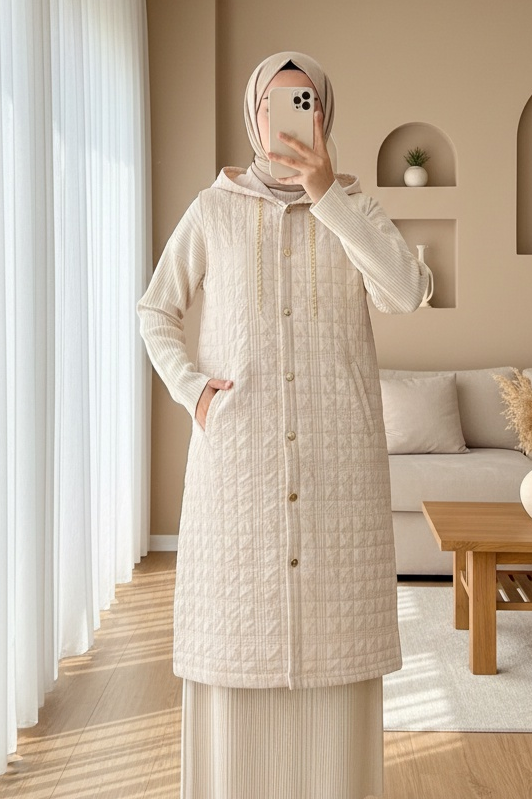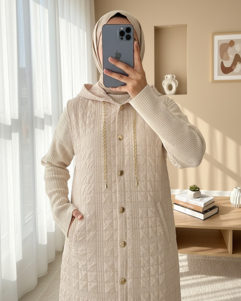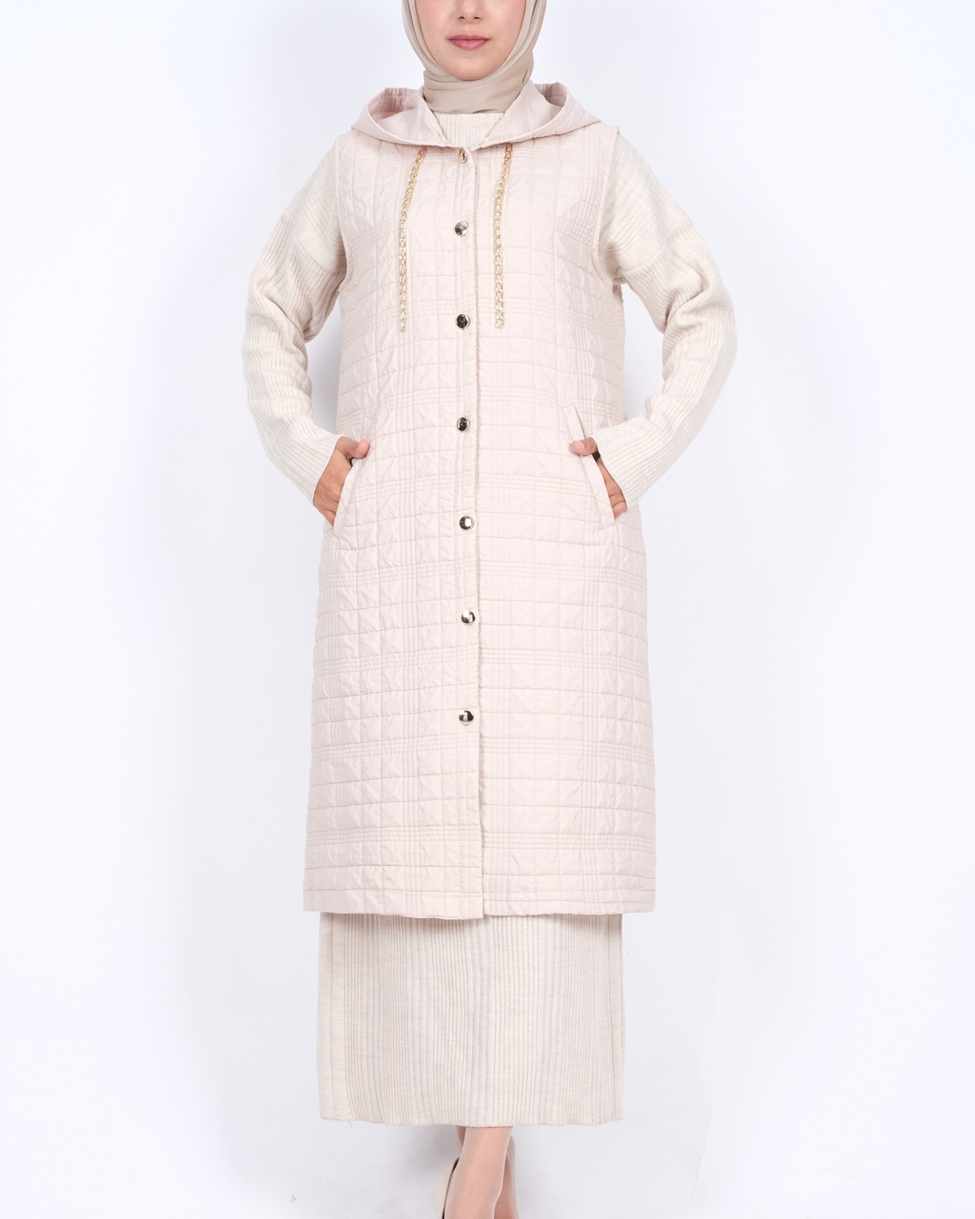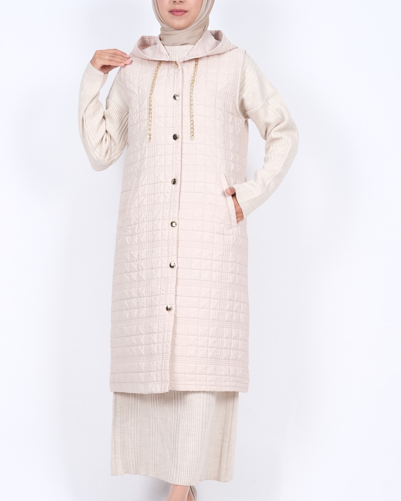 Hooded Chain Detailed Quilted Vest with Pockets -Stone