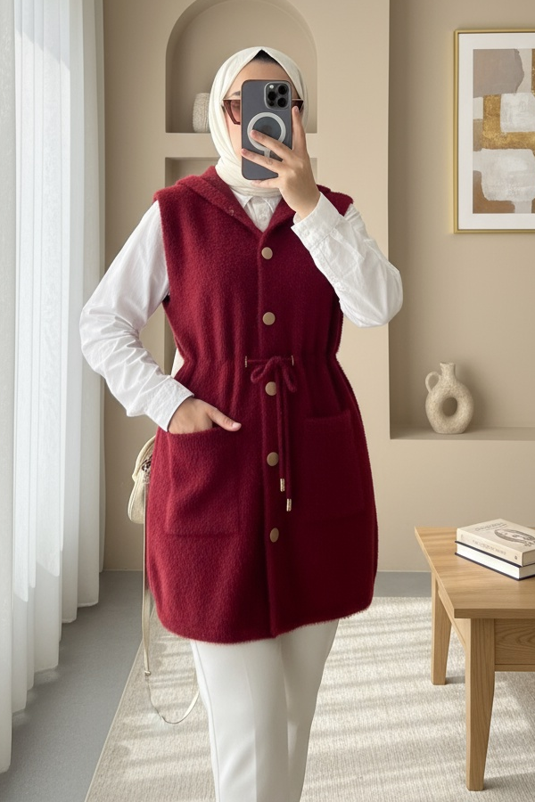 Hooded Pocket Waist Tie Bearded Vest -Maroon