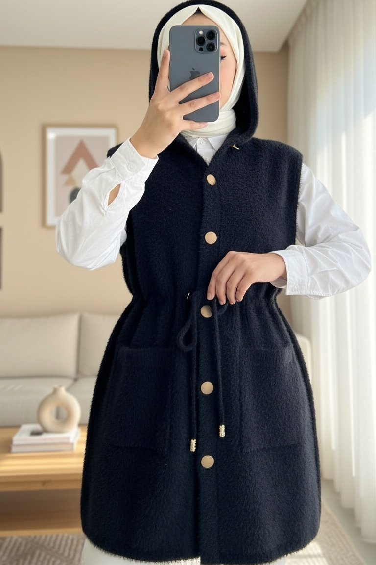 Hooded Pocket Waist Tie Bearded Vest -Black