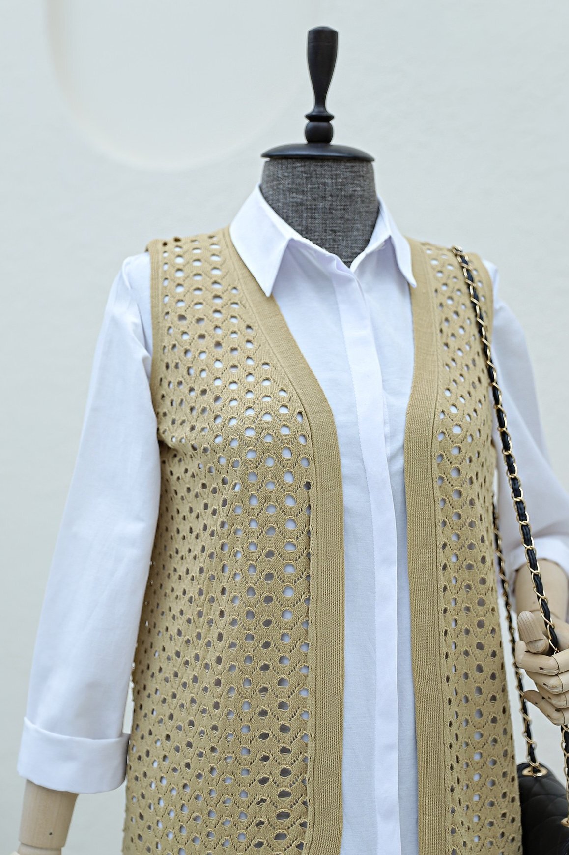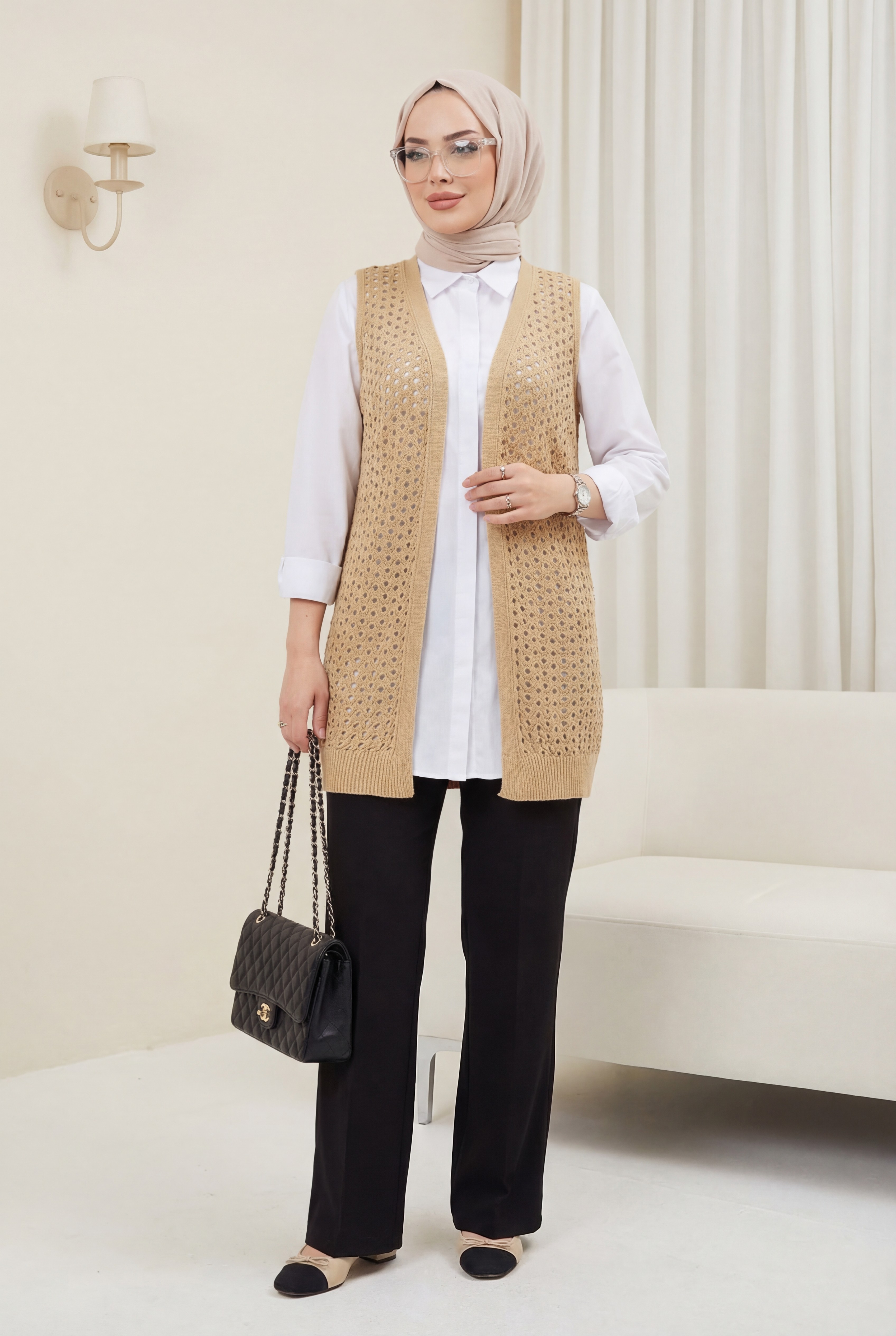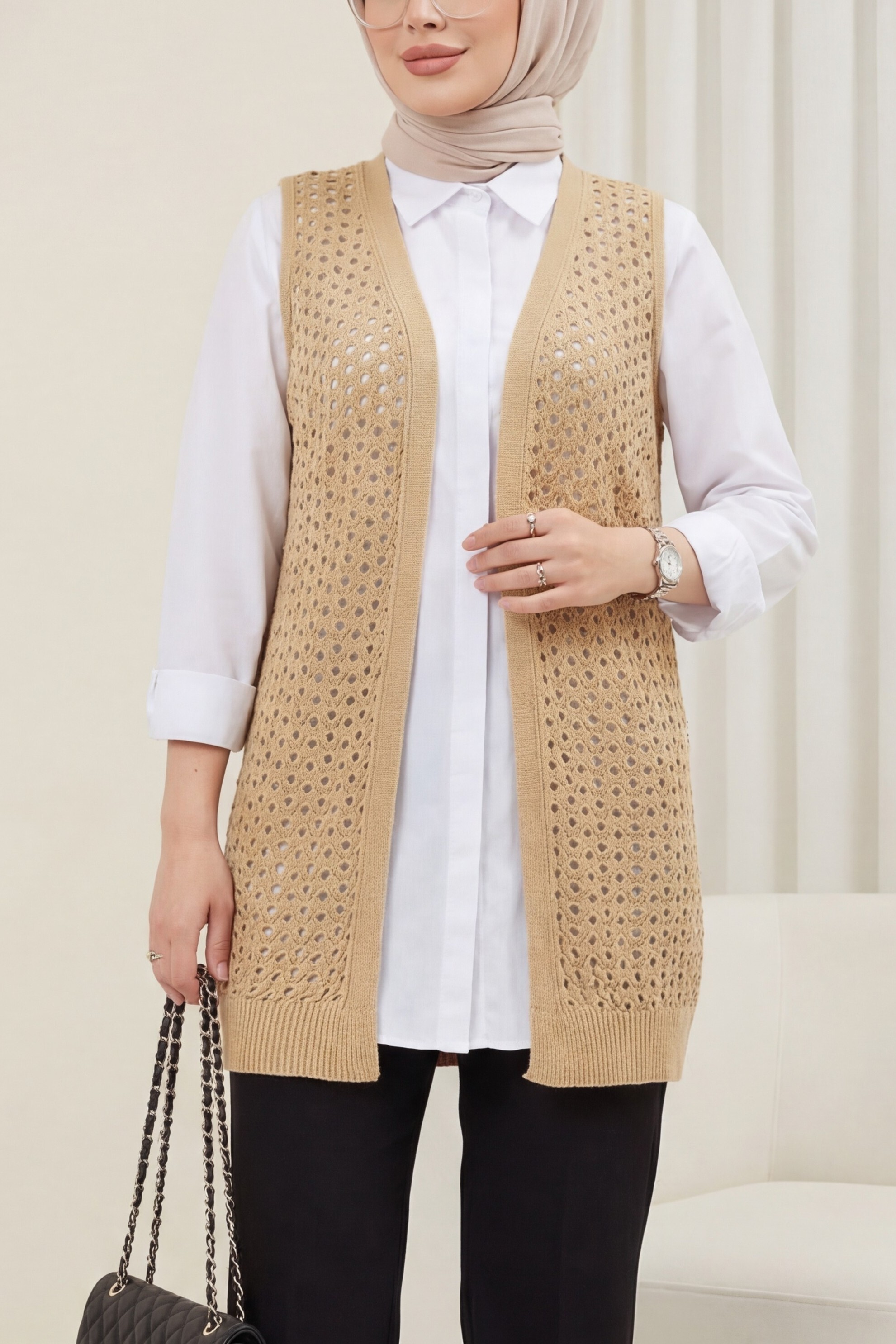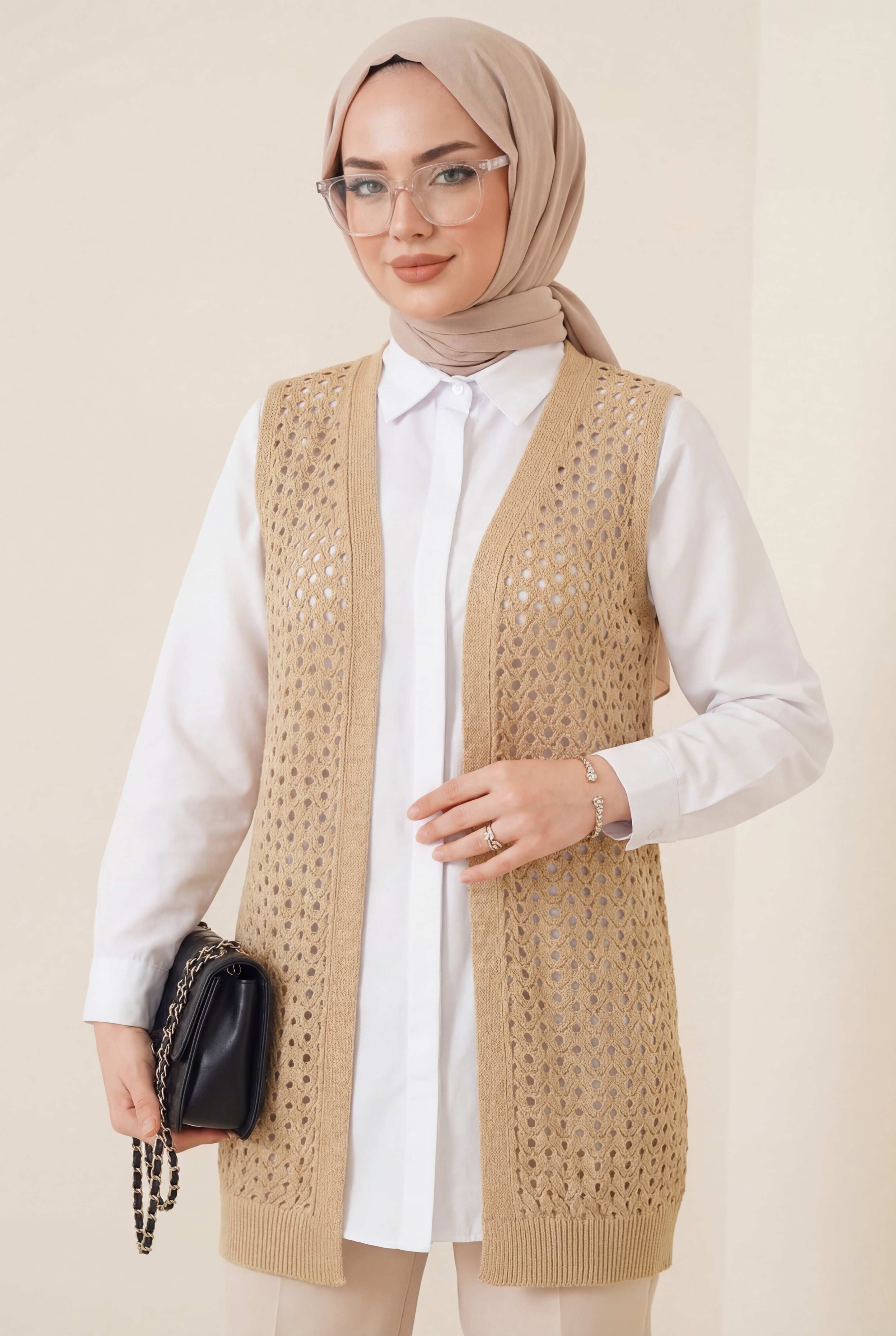 According to the user and the region, this product can also be called as comfortable knit vest, hijab knit vest, daily knit vest, seasonal knit vest, hijab knit vest models, knit vest, openwork vest.