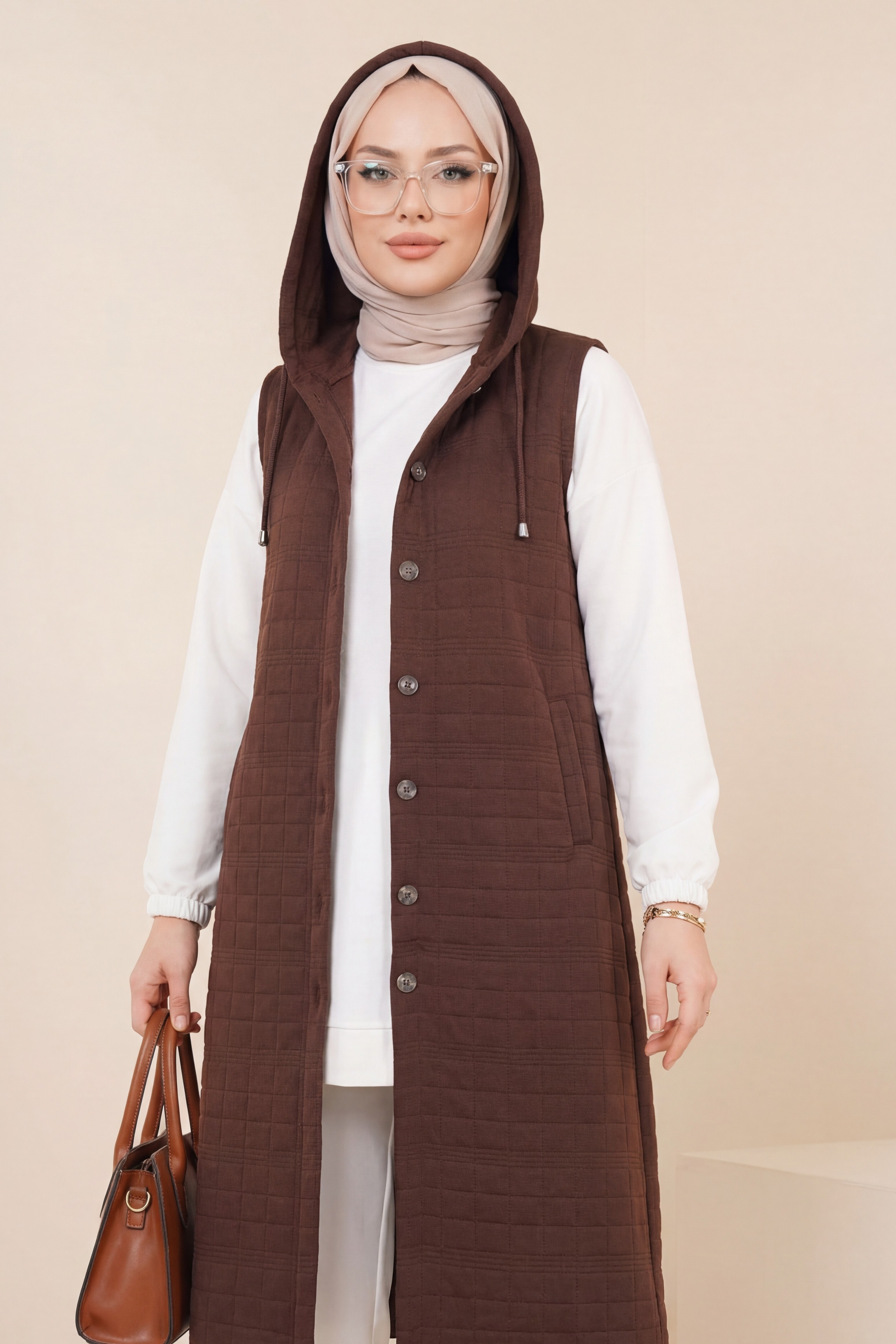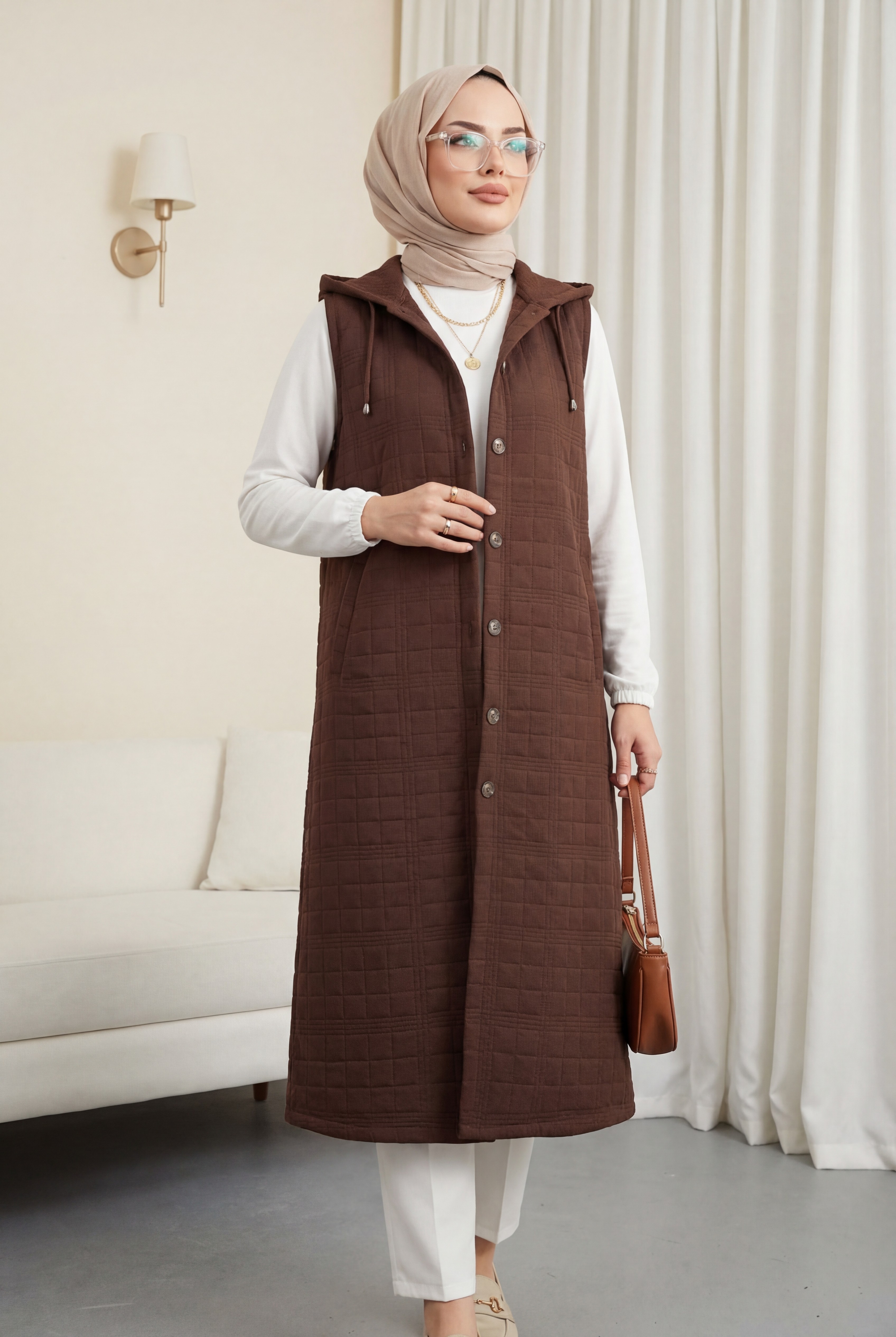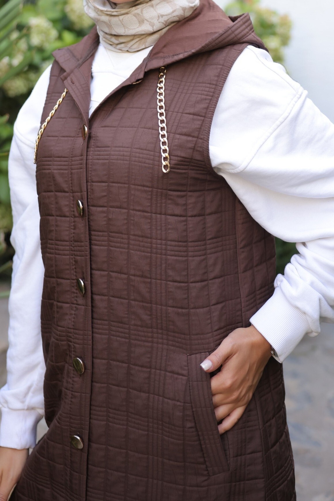 Quilted Vest with Buttoned Front and Chain Detailed Hood -Brown