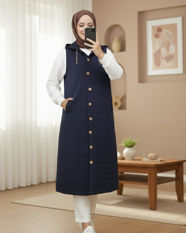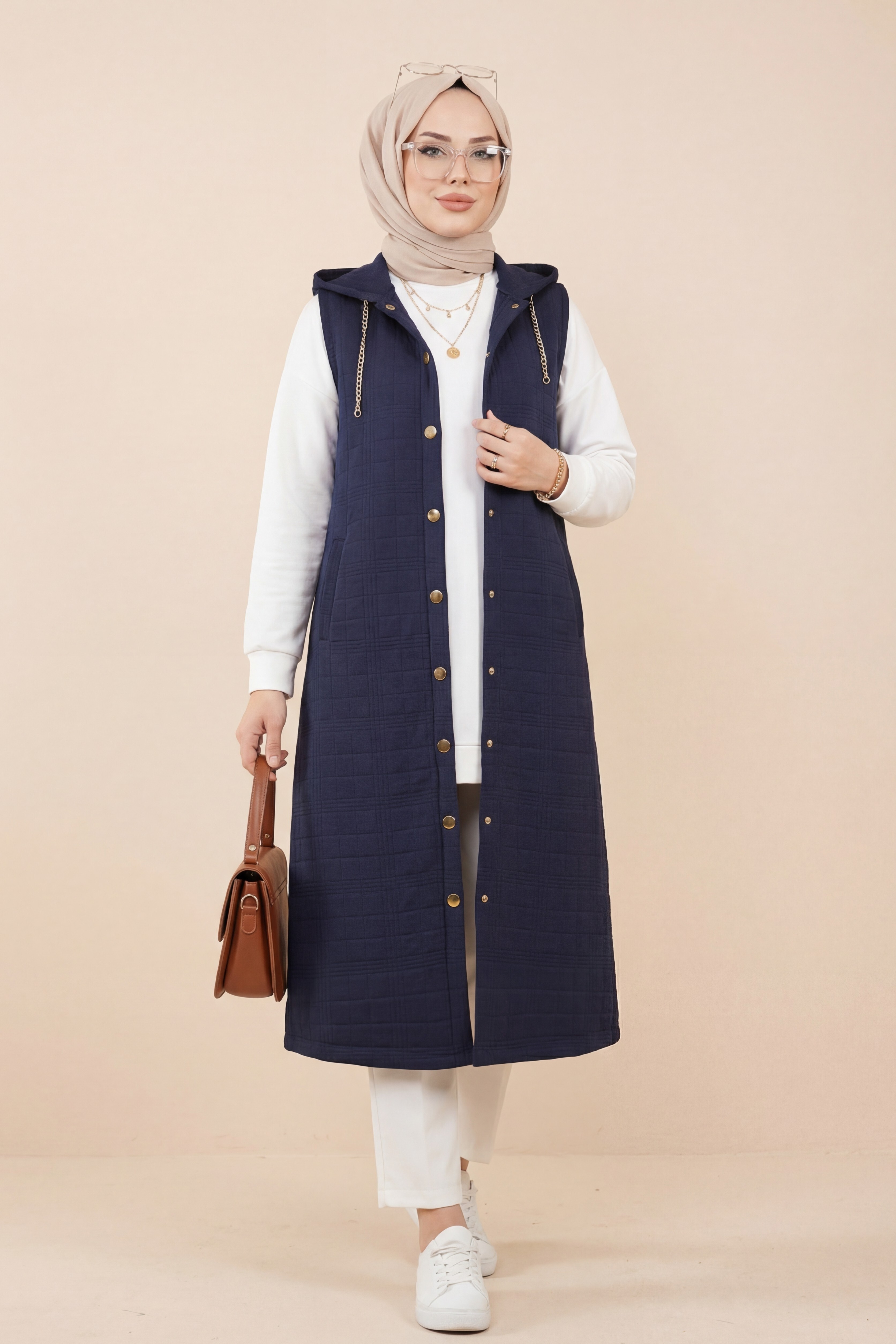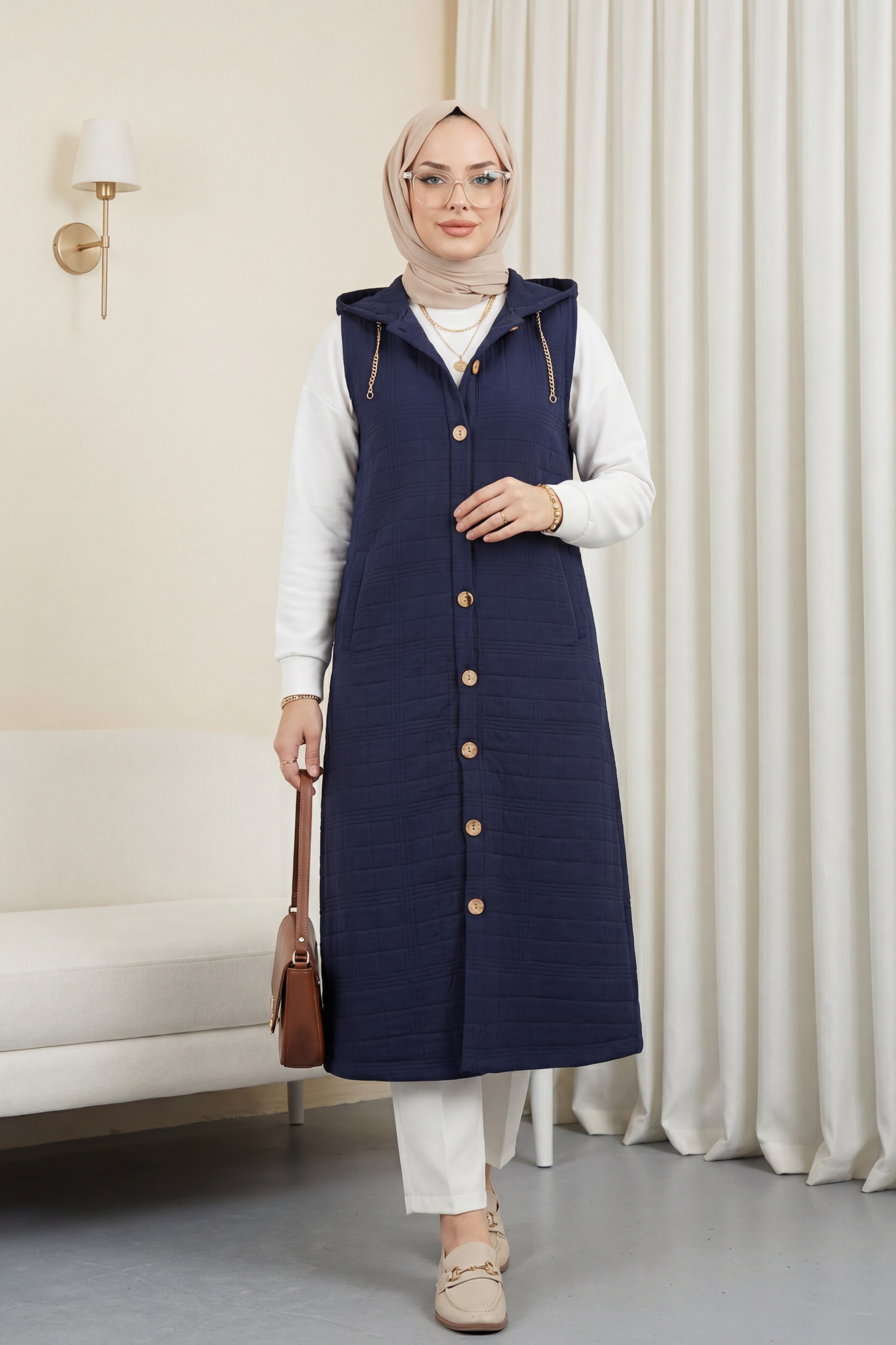 Quilted Vest with Buttoned Front and Chain Detailed Hood -Navy blue