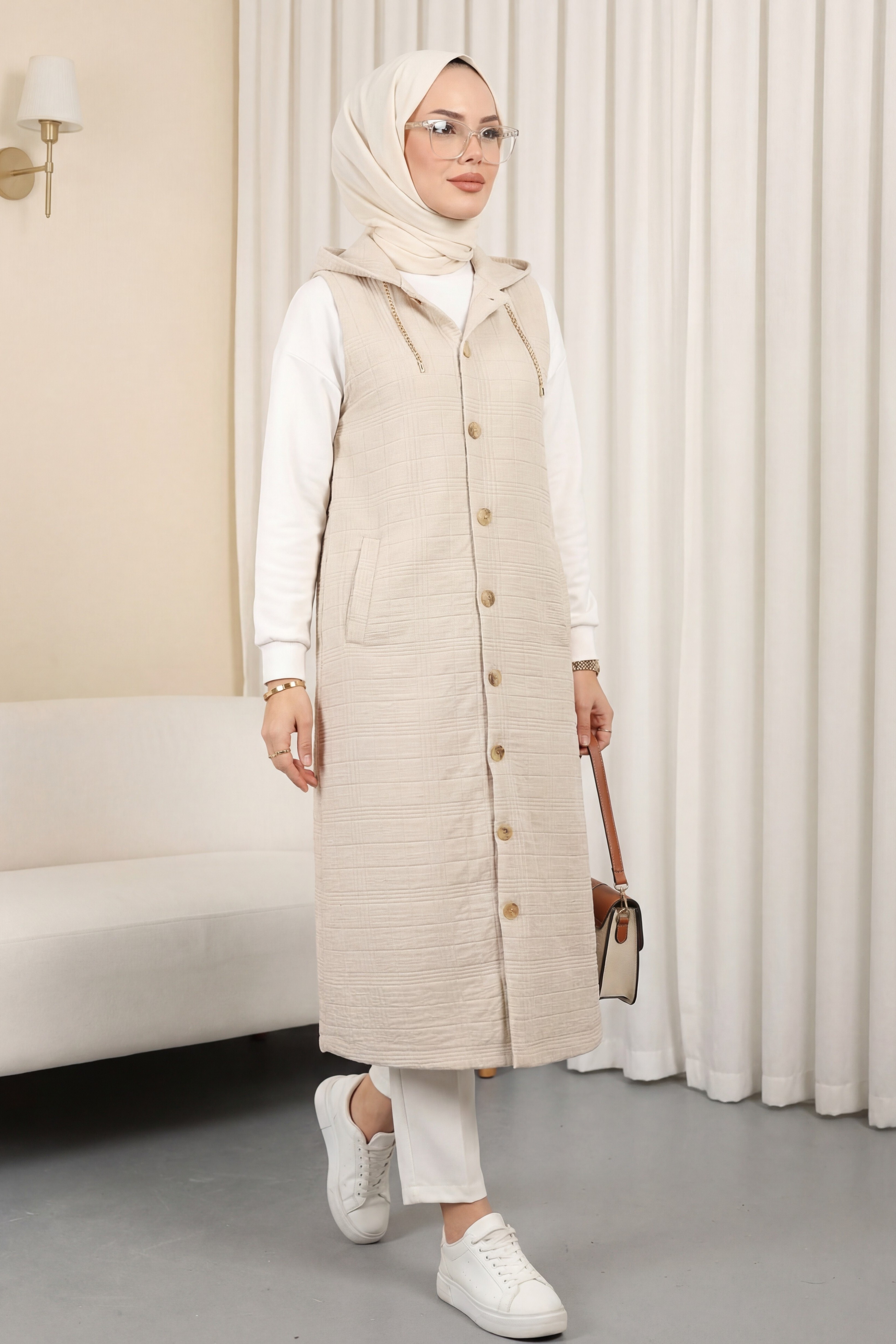 Quilted Vest with Buttoned Front and Chain Detailed Hood -Stone
