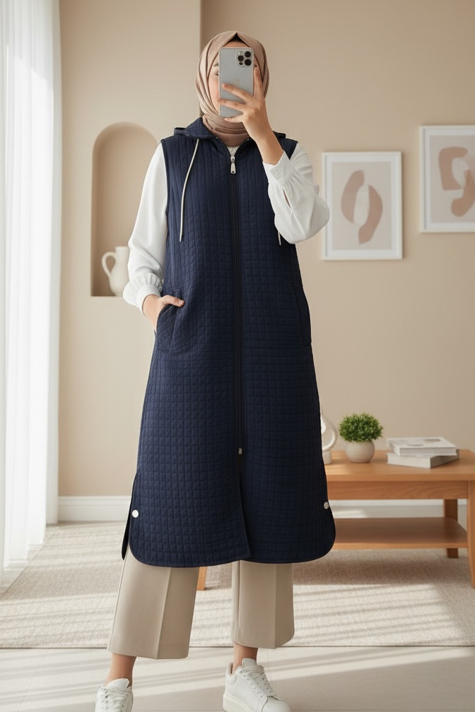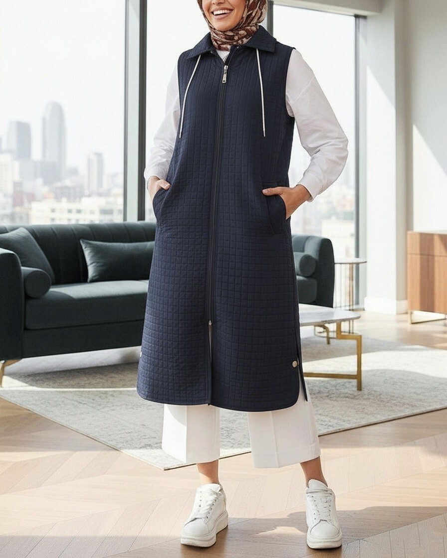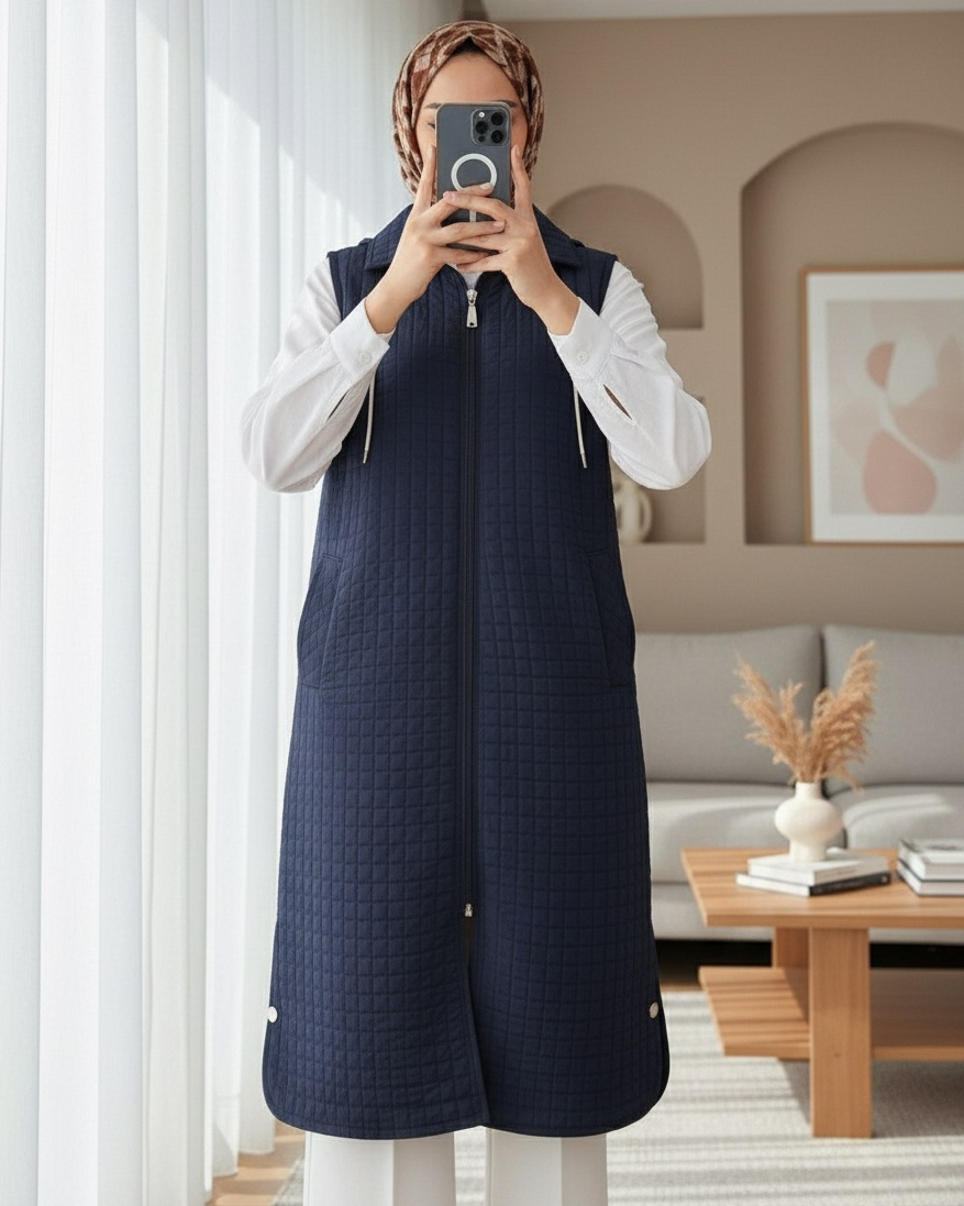Zippered Hooded Long Quilted Vest with Pockets -Navy blue