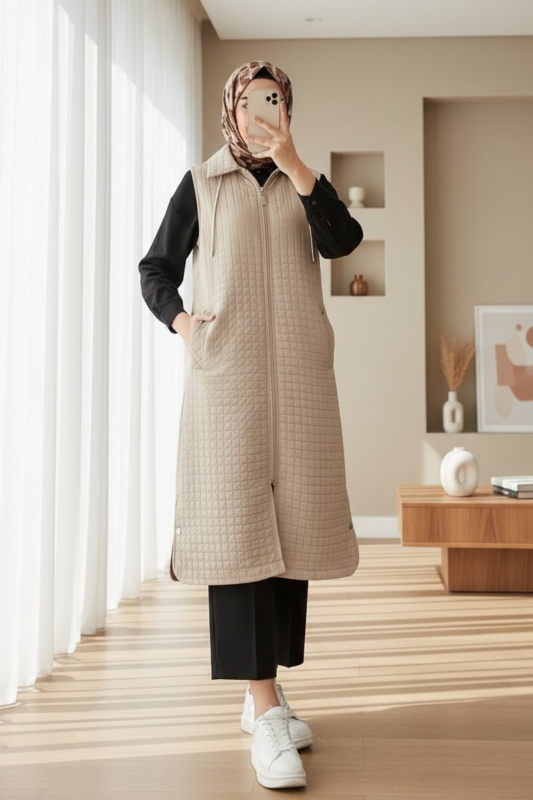 Zippered Hooded Long Quilted Vest with Pockets -Stone