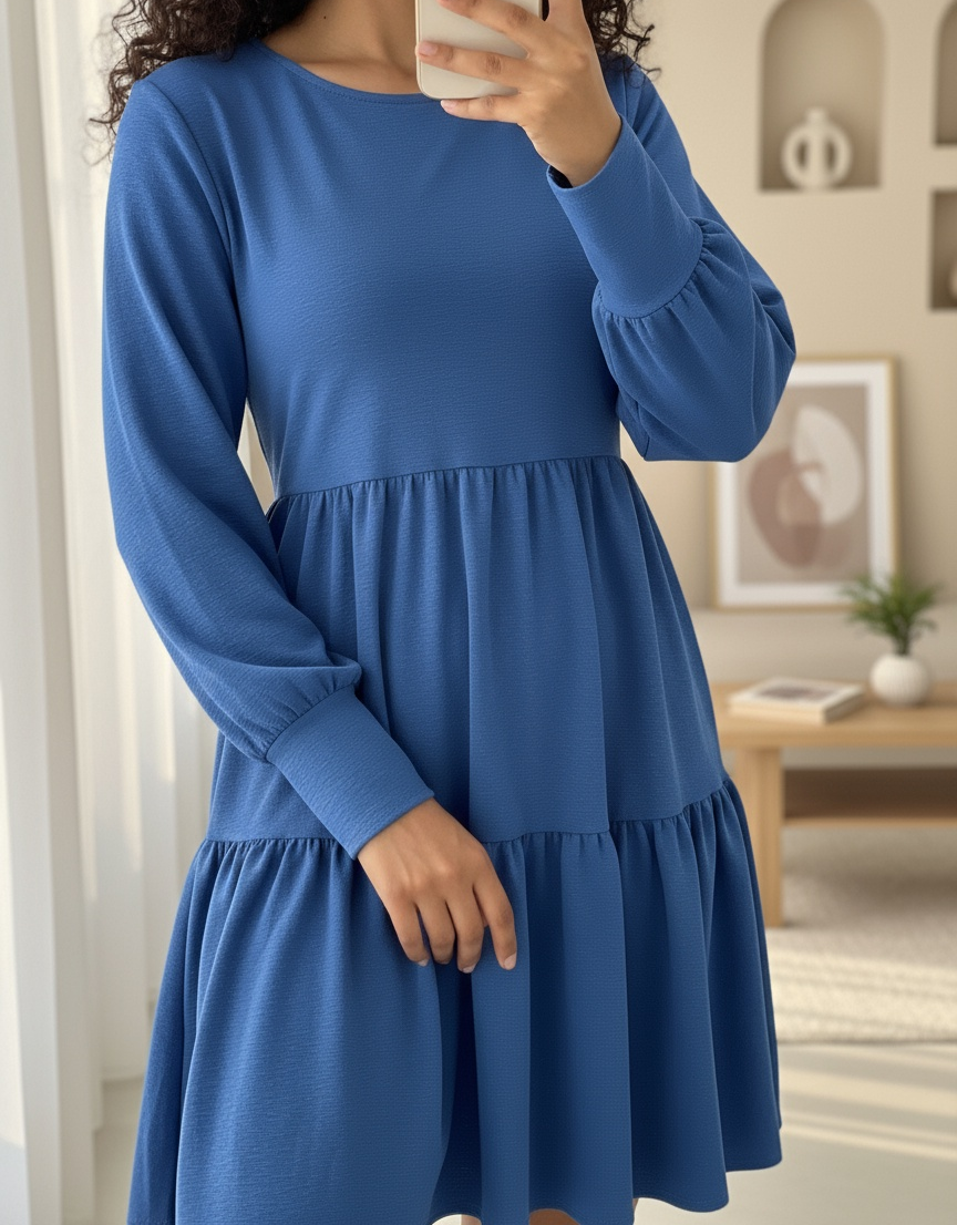 Round Neck Elastic Waist Elastic Skirt Layered Ayrobin Dress -İndigo
