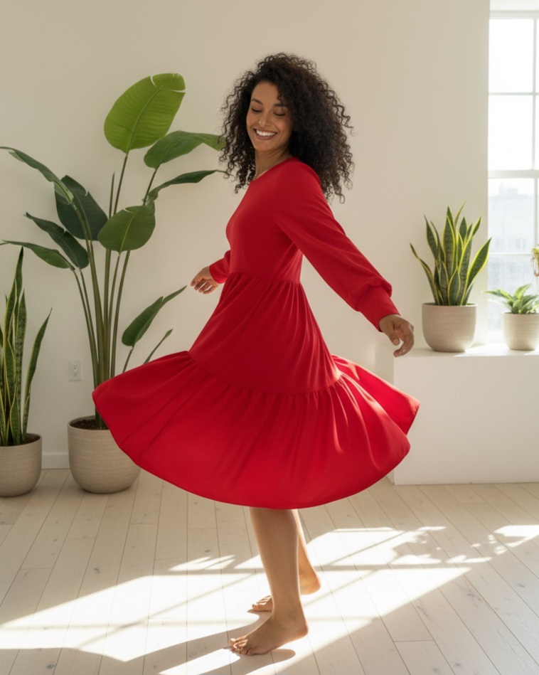 Round Neck Elastic Waist Elastic Skirt Layered Ayrobin Dress -Red