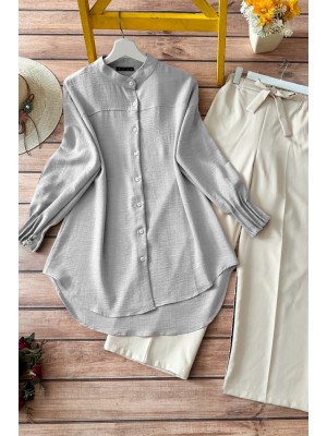 Sleeve Cuff Draped Oval Cut Shirt -Grey