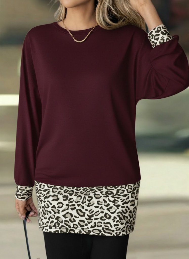 Women's Long Sleeve Crew Neck Top, Viscose Two-Thread Bottom, Leopard Print Mini Dress