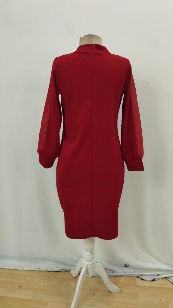 Women's Long Sleeve Semi Turtleneck Tulle and Pearl Detailed Short Imported Crepe Midi Dress