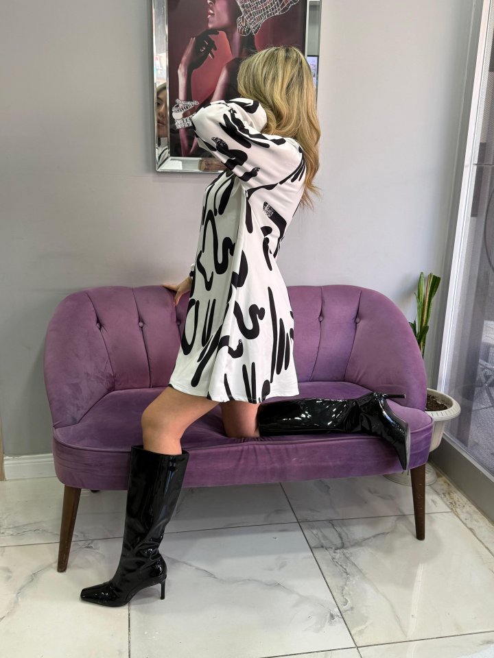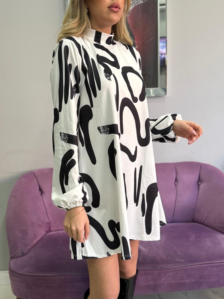 Women's Long-Sleeved Semi-Turtleneck Patterned Short Scuba Dress