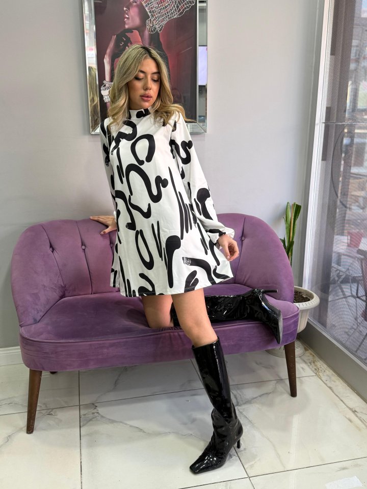 Women's Long-Sleeved Semi-Turtleneck Patterned Short Scuba Dress Stock Code: 140539