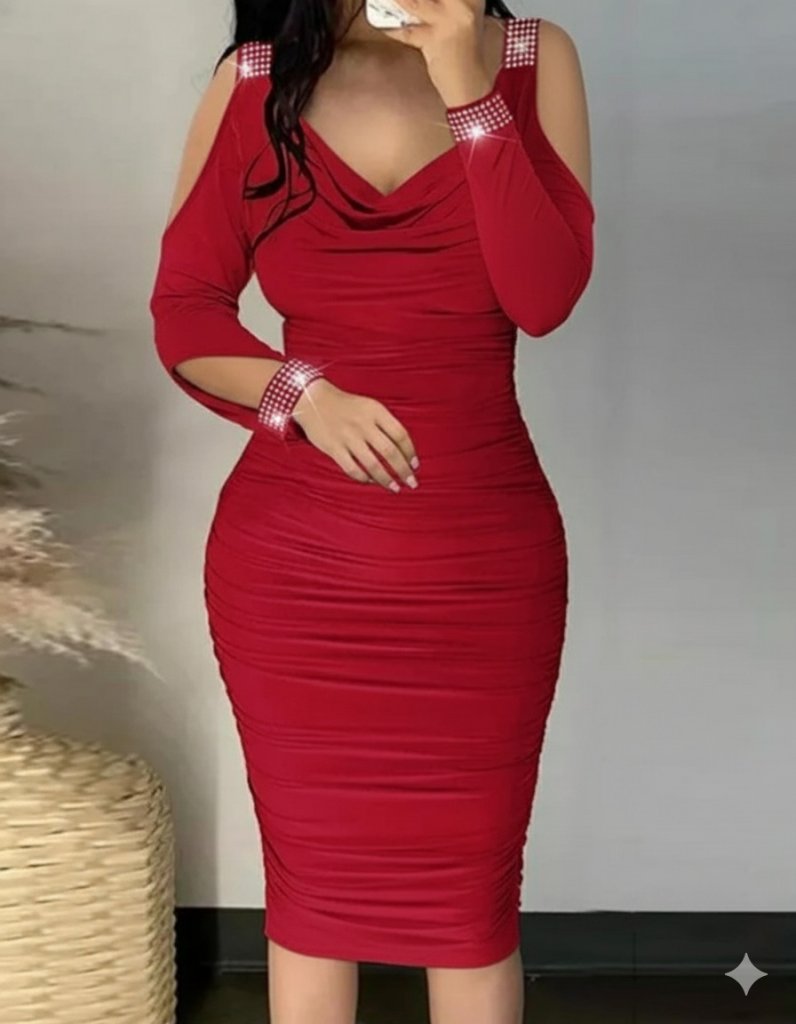 Women's Off-the-Shoulder Long Sleeve Stoned Cowl Neck Sandy Midi Dress Stock Code: 179130