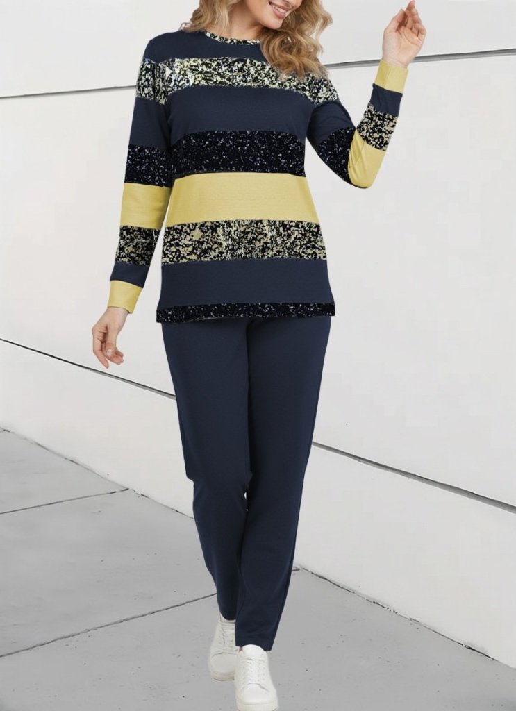 Women's Long Sleeve Crew Neck Striped Pattern Two Thread Blouse and Trousers Set Stock Code: 176663