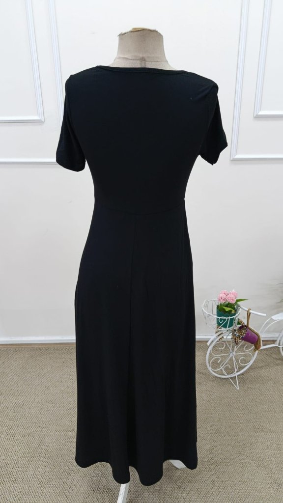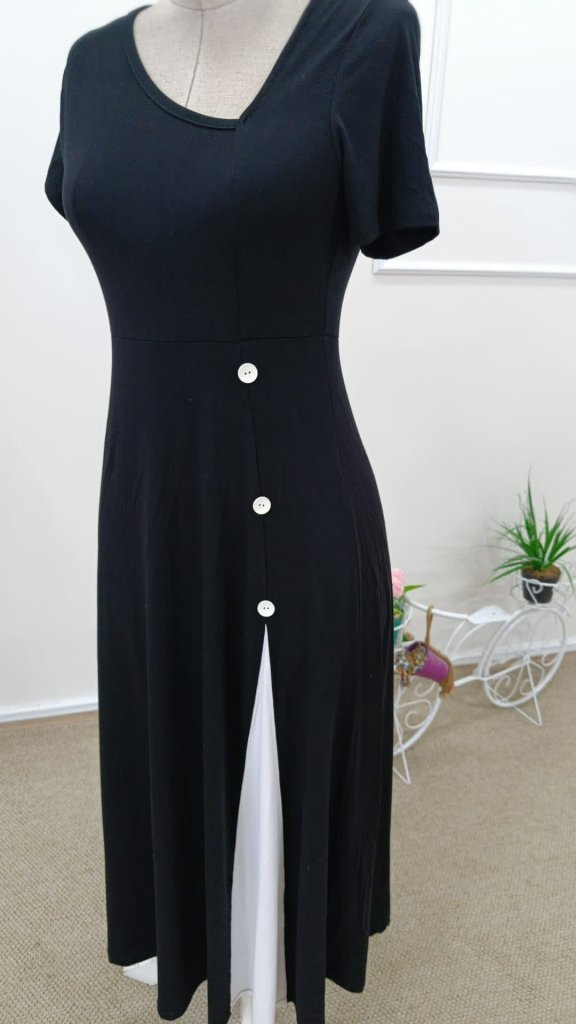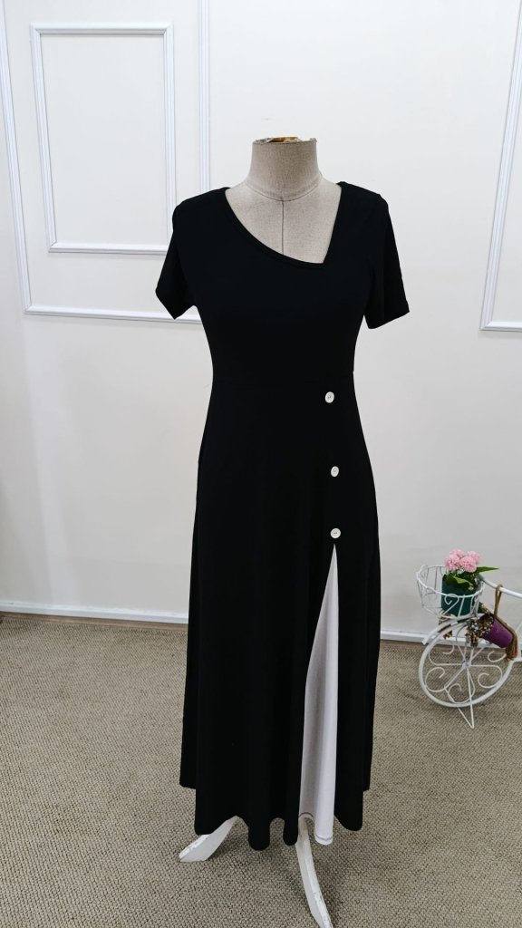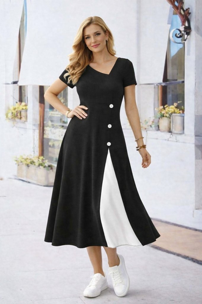 Women's Short-Sleeved Asymmetrical Neckline Button Detail Midi Viscose Dress