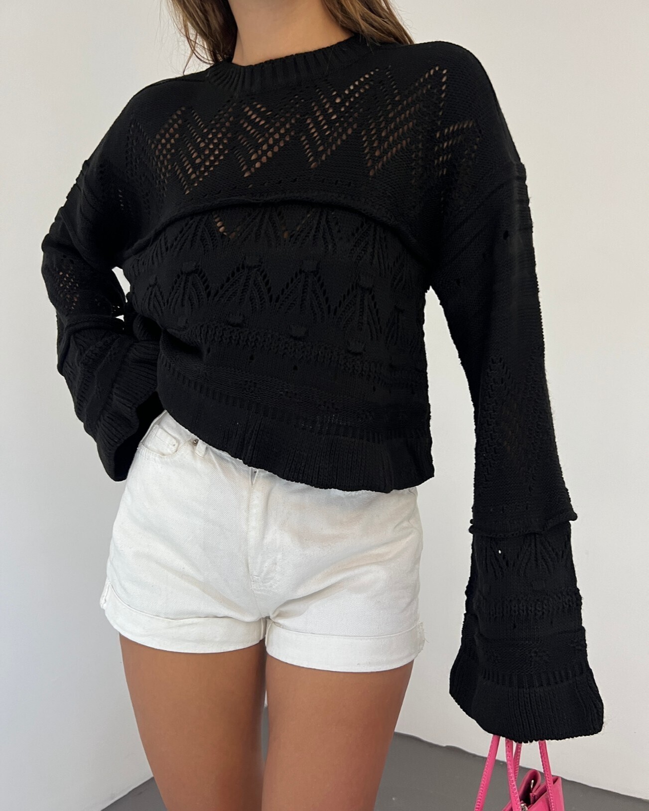 Openwork Pompom Long Sleeve Knitwear Sweater -Black