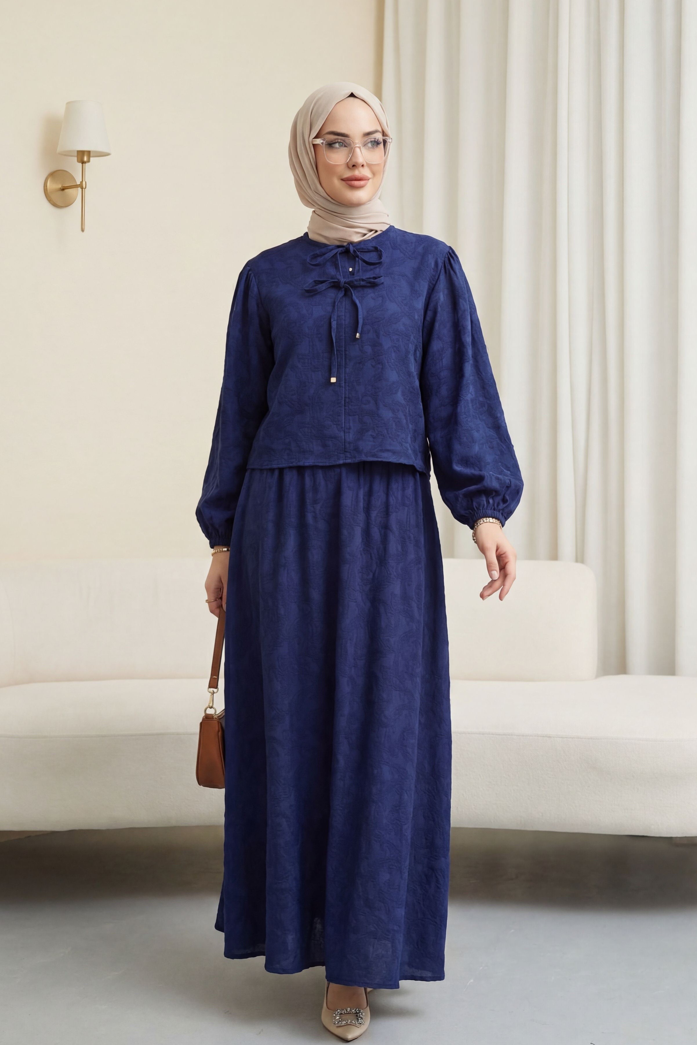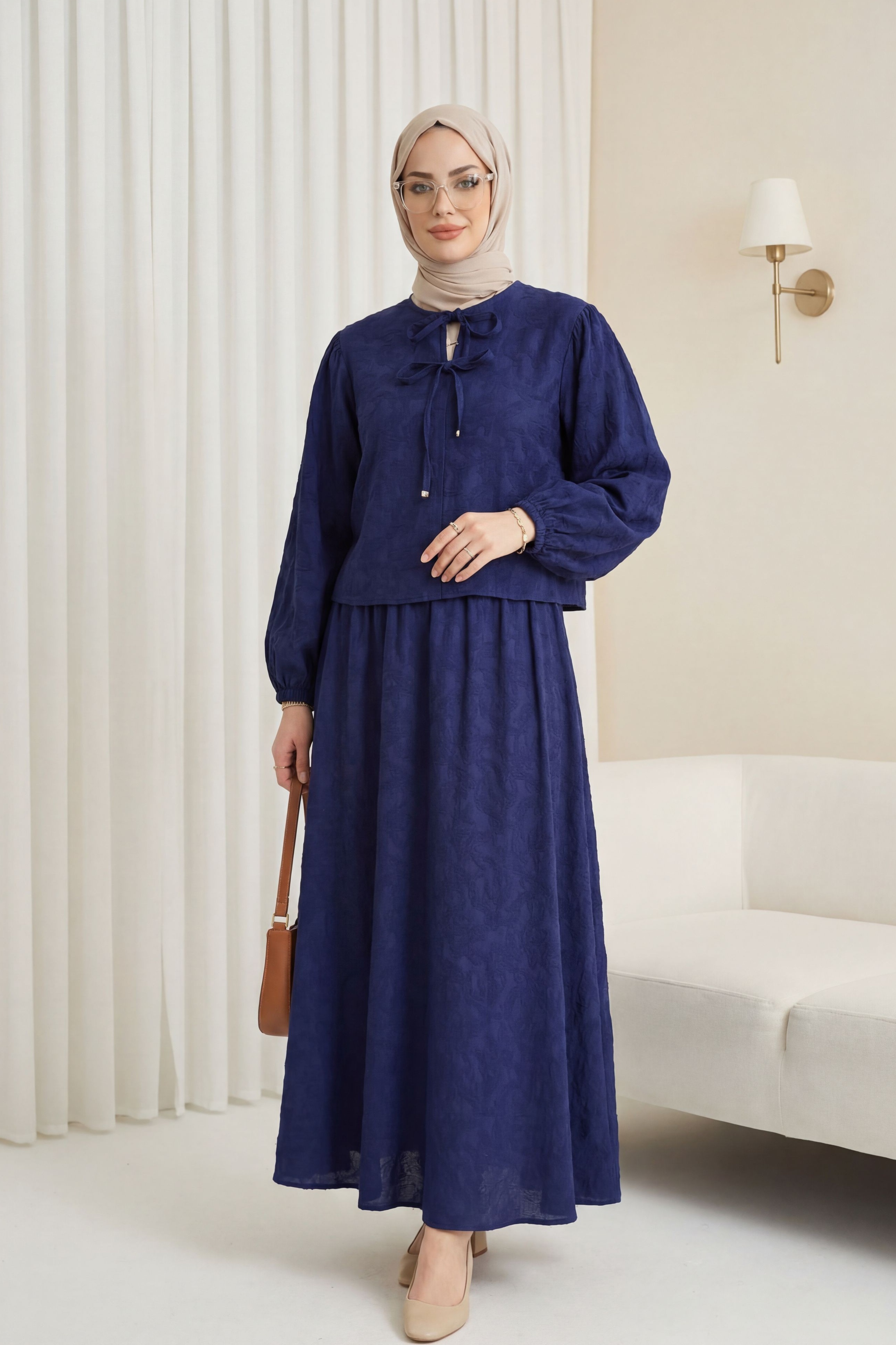 Kolu Lastikli Yakası Bağlamalı Etekli Jakar Takım, zarif ve modern bir stil sunar. Yaka bağlama detayı feminen bir dokunuş katarken, kol lastikleri konfor sağlar. Jakar kumaşı dokulu ve şık bir görünüm sunar. Etekli tasarımı dengeli ve zarif bir siluet oluşturur.