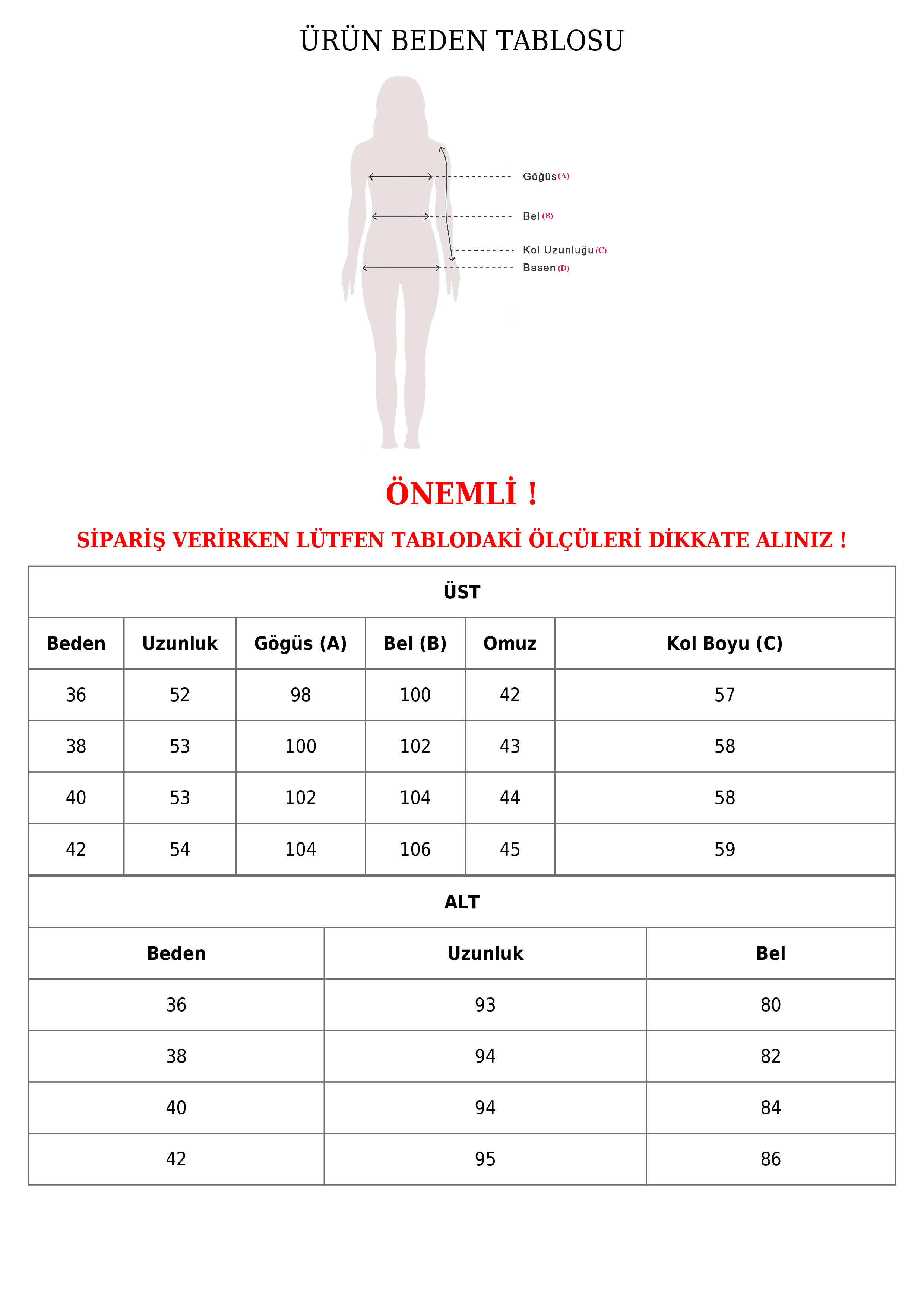 | Beden | Uzunluk | Göğüs | Bel | Omuz | Kol Boyu | |