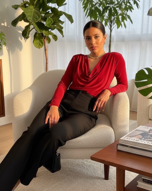 Not: Ürün içeriği bluzdan oluşmaktadır. (Pantolon, ayakkabı, şal, çanta ve takılar dekor amaçlı kullanılmaktadır.)