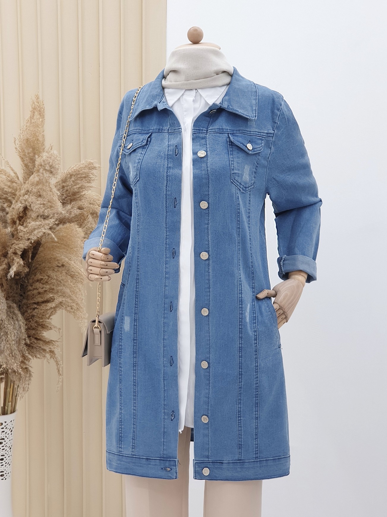Önden düğme detaylı, eskitme tarzı kot kumaşlı, çift cepli, manşetleri düğmeli olan kot ceket modelimiz en çok tercih edilen modeller arasında yer almaktadır.