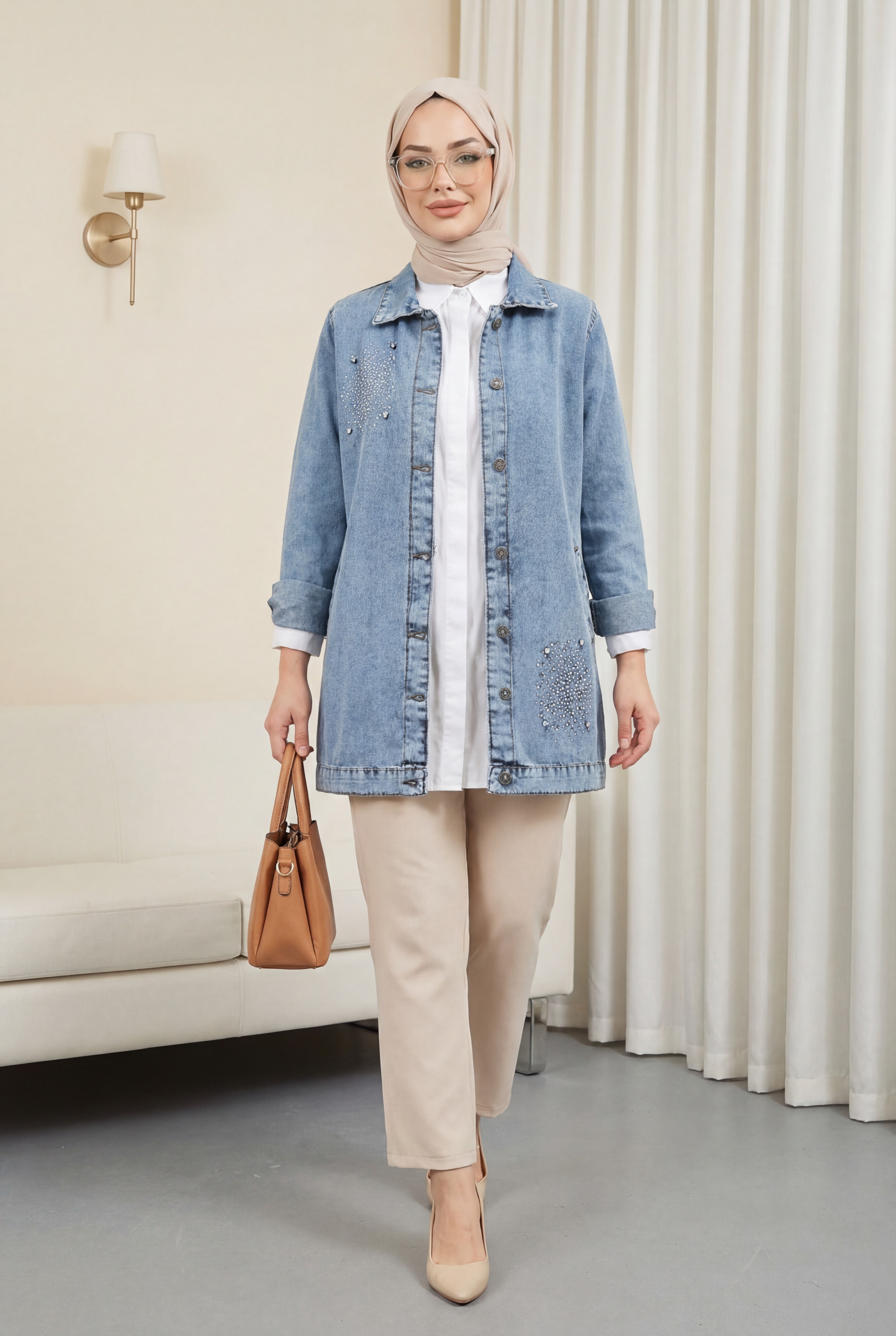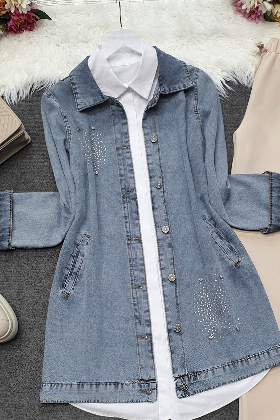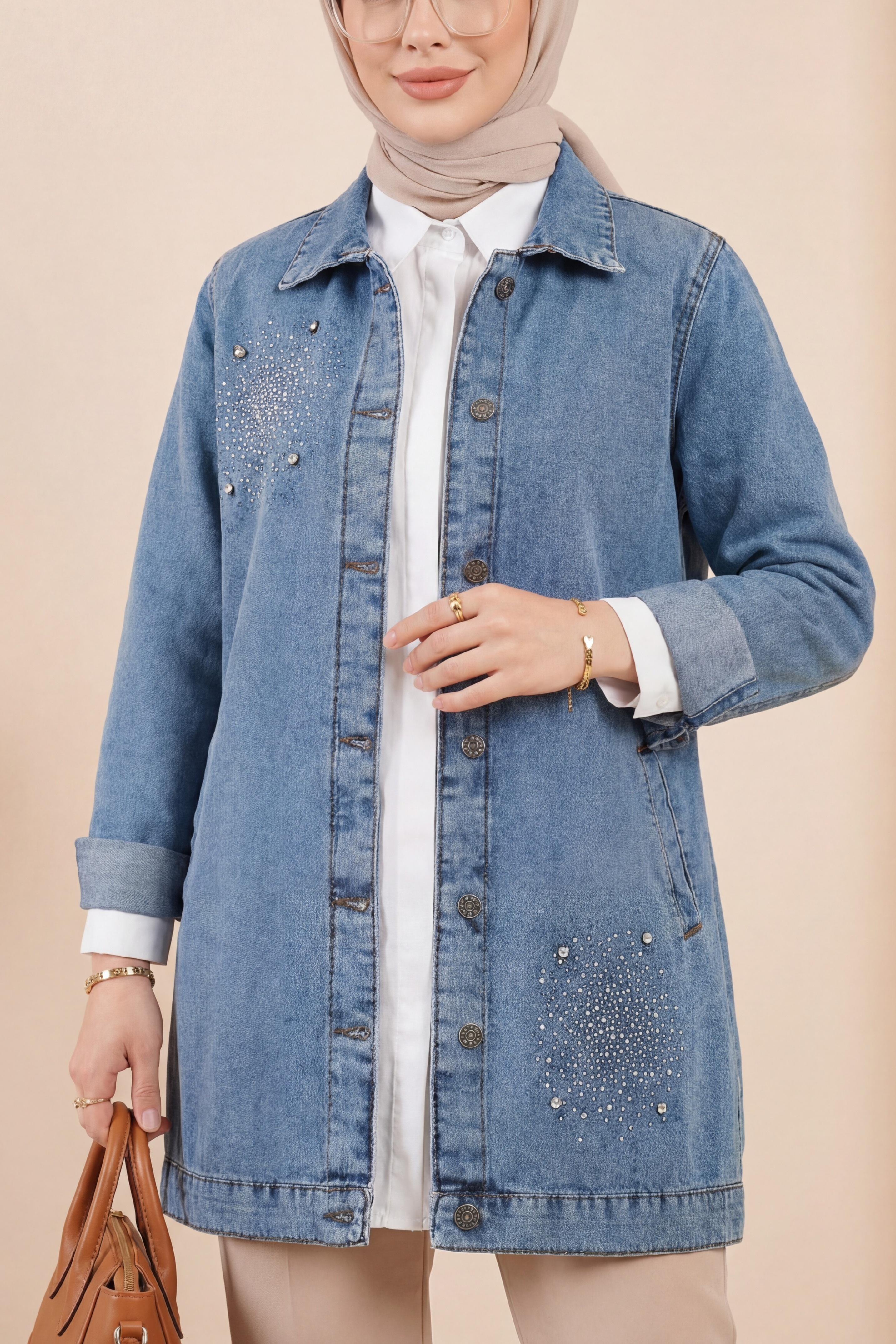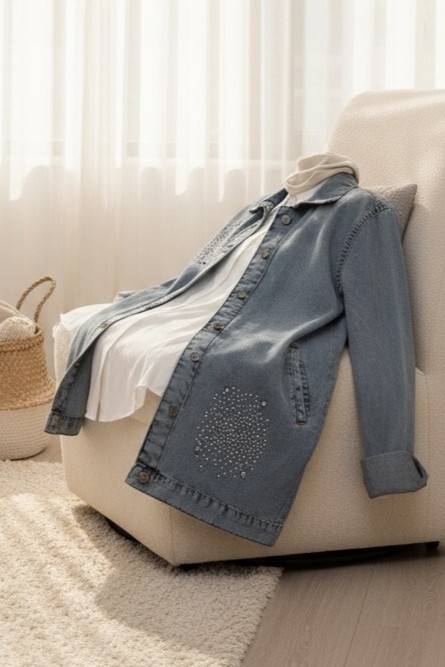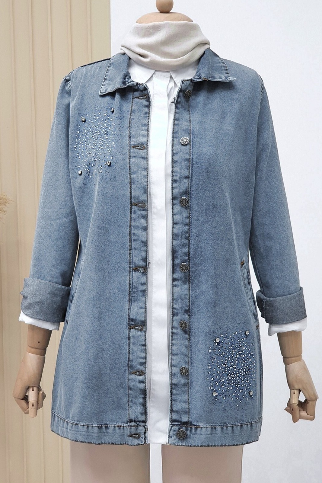 Önden düğmeli, önü taş detaylı, 2 cepli, kol manşeti düğmeli kot ceket modelimiz yeni sezonun en çok sevilen modelleri arasında yer almaktadır.