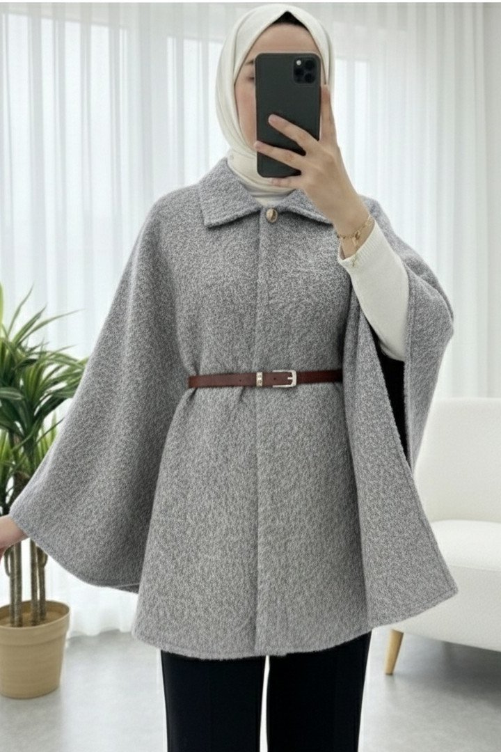 Tek Düğmeli Beli Kemerli Sakallı Panço -Açık Gri