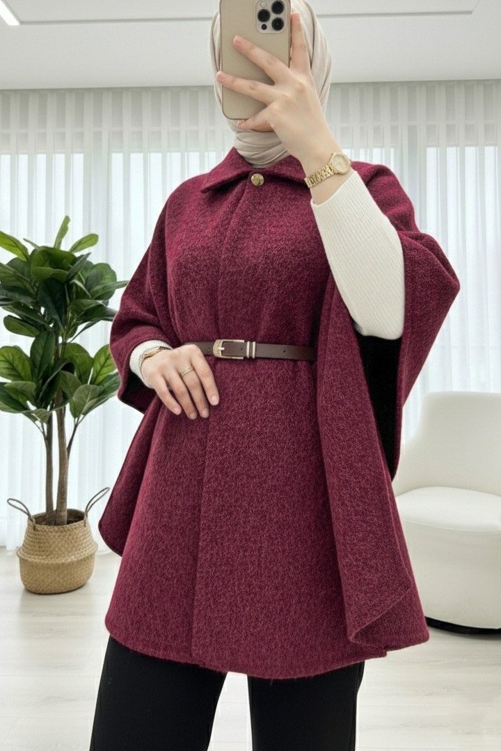 Tek Düğmeli Beli Kemerli Sakallı Panço -Bordo