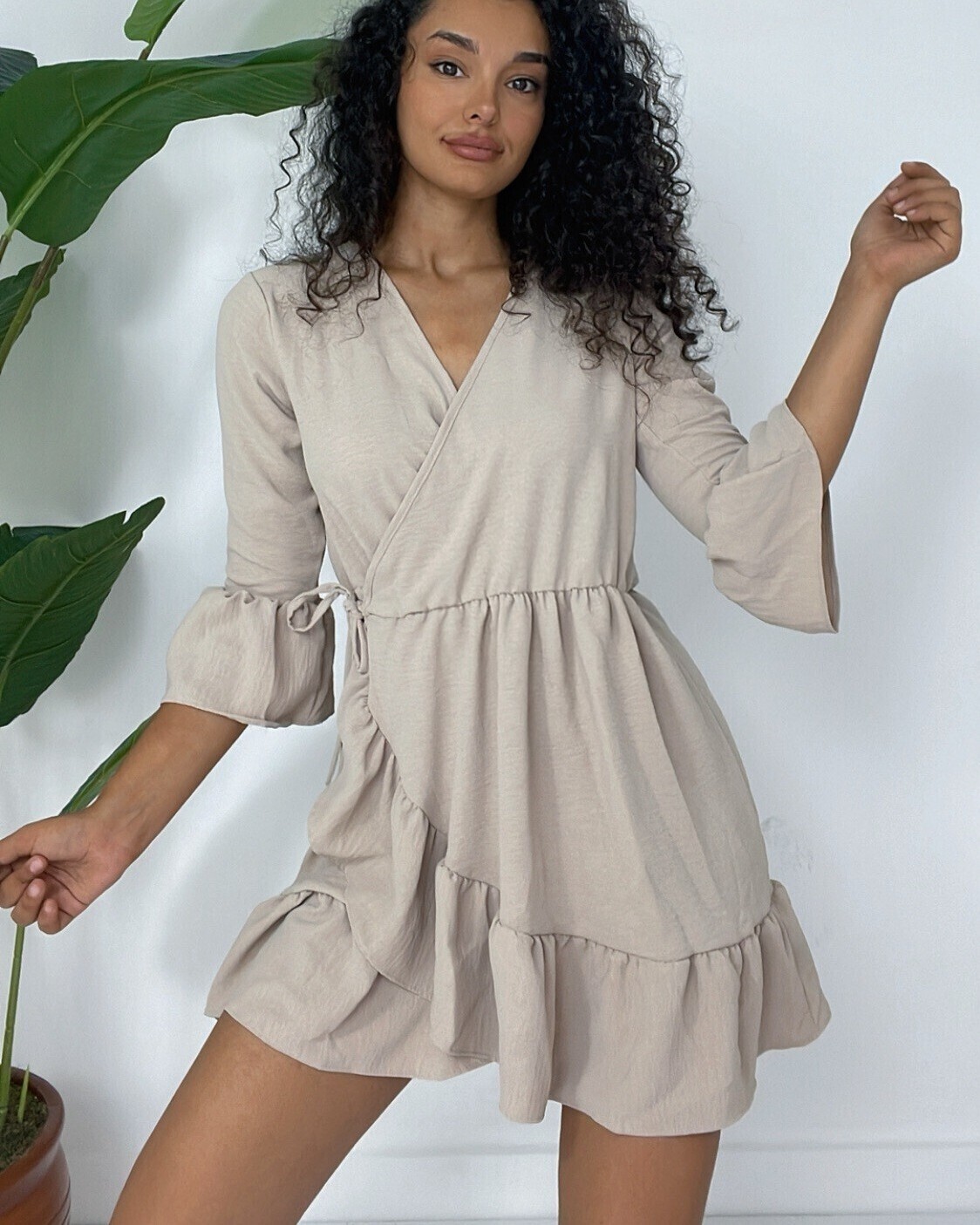 Eteği Ve Kolları Fırfırlı Beli Lastikli Ayrobin Elbise -Açık Vizon