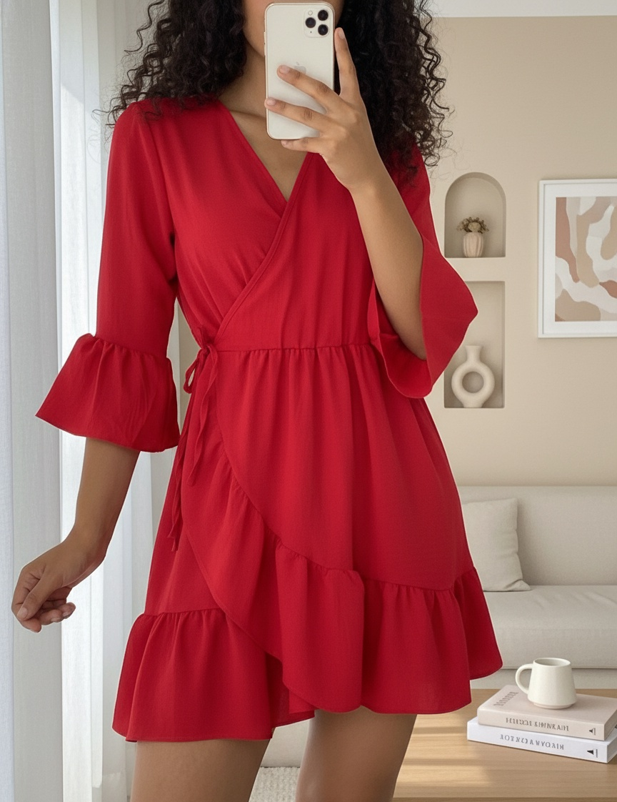 Eteği ve kolları fırfırlı, beli bağlamalı elbise modelimiz yeni sezonun en çok sevilen modelleri arasında yer almaktadır.