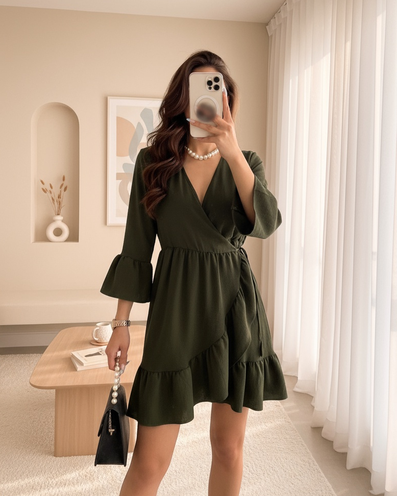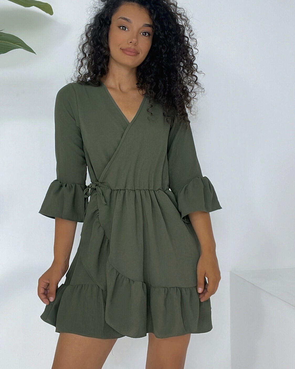 Eteği Ve Kolları Fırfırlı Beli Lastikli Ayrobin Elbise -Haki