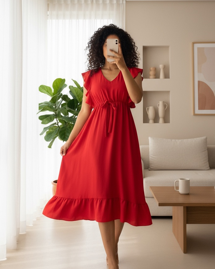 Omuzu Fırfırlı Beli Lastikli Sıfır Kol Midi Boy Ayrobin Elbise -Kırmızı