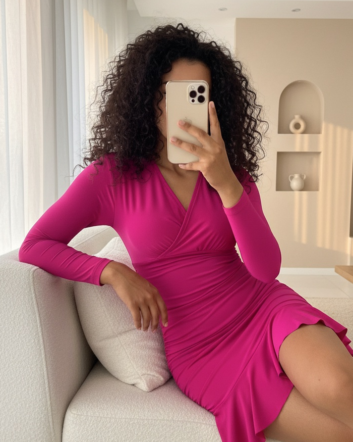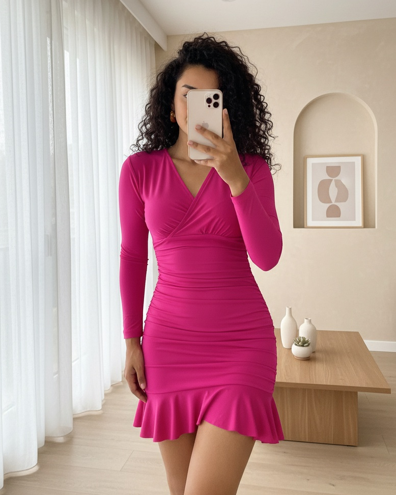 V yaka, yanları büzgülü, eteği fırfırlı elbise modelimiz yeni sezonun en çok sevilen modelleri arasında yer almaktadır.