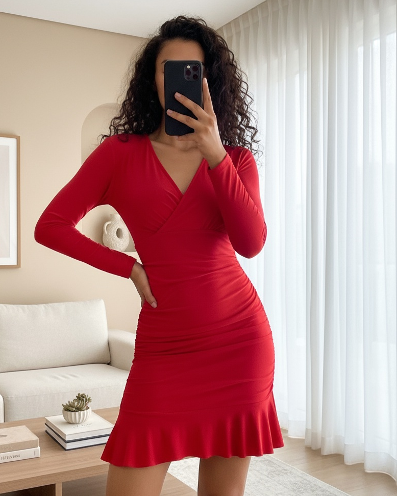 V yaka, yanları büzgülü, eteği fırfırlı elbise modelimiz yeni sezonun en çok sevilen modelleri arasında yer almaktadır.